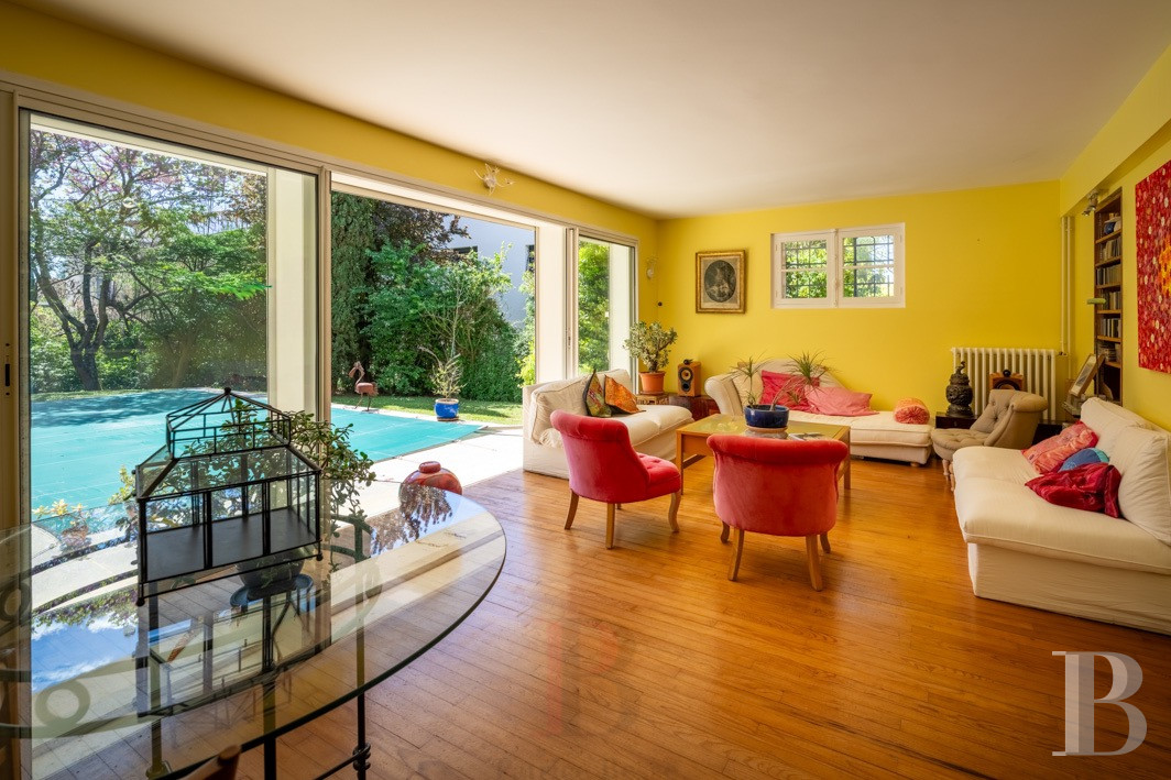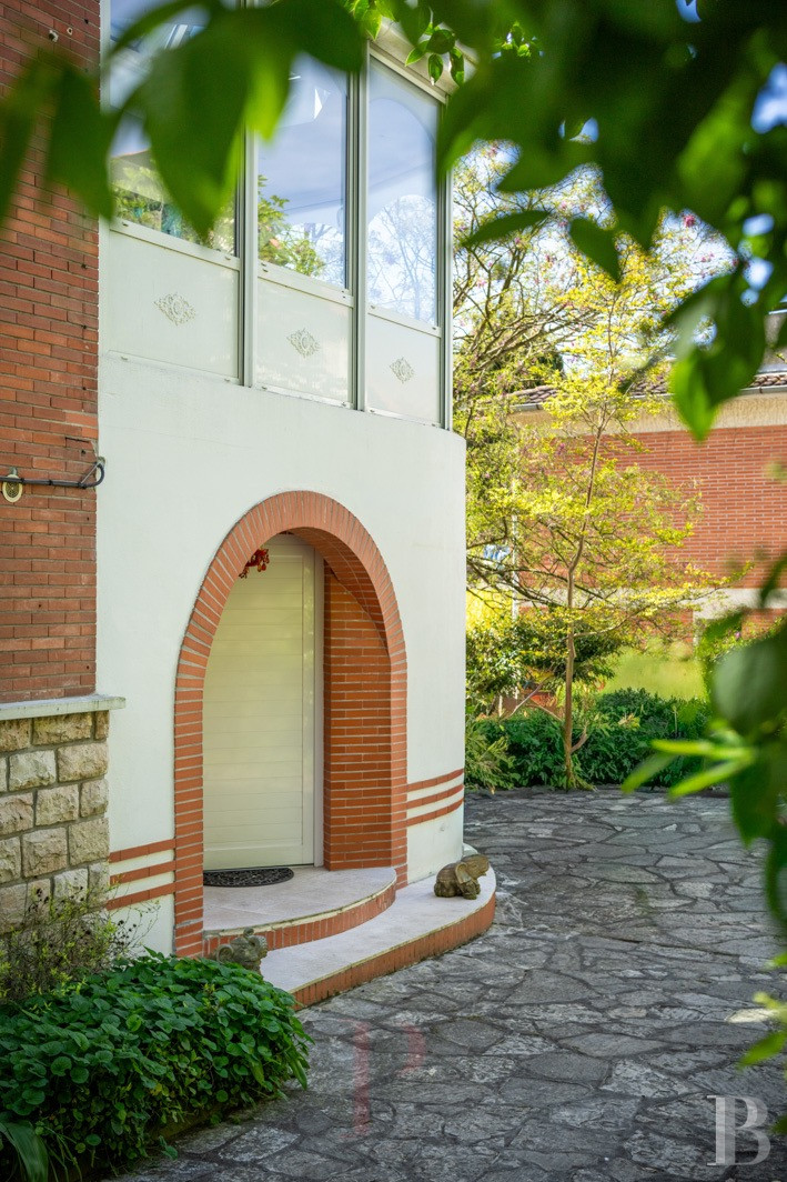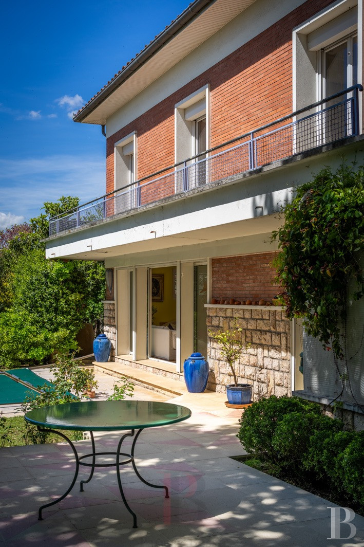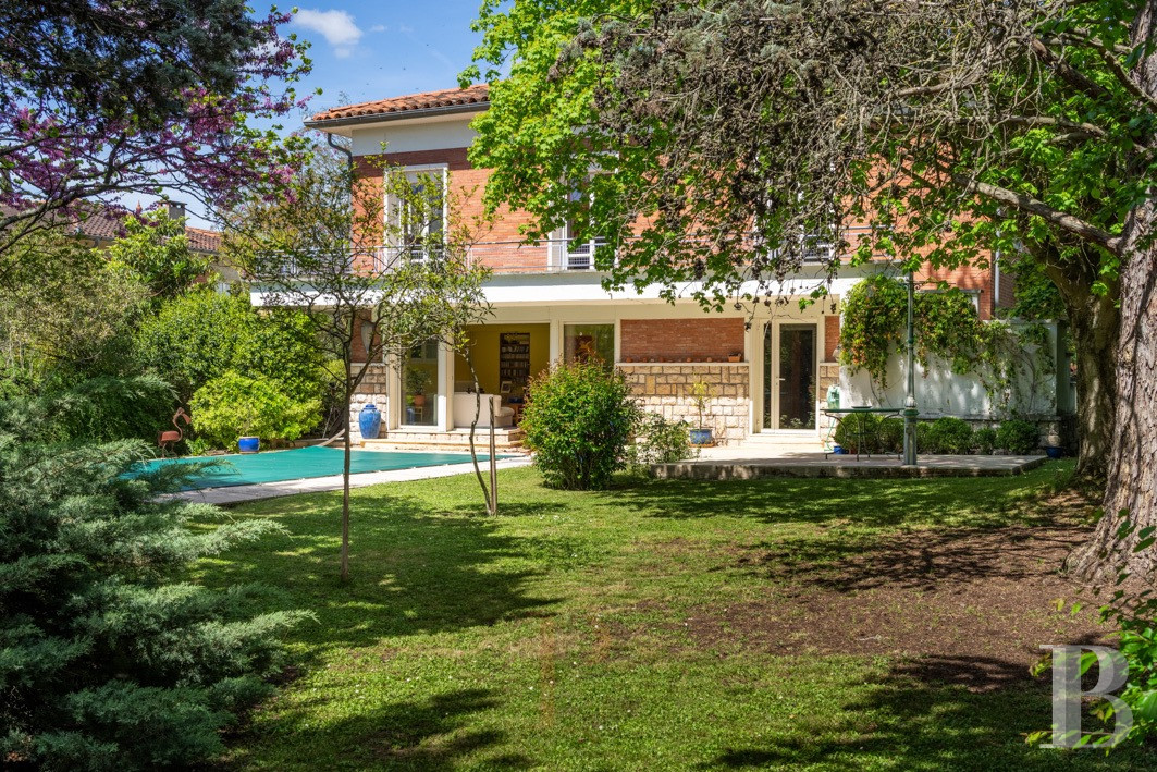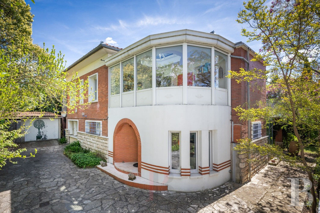 Une maison des années 1950 revisitée, lumineuse et singulière. Derrière sa façade de brique, elle dévoile une identité façonnée par des interventions successives. L’extension arrondie, largement vitrée, constitue une pièce manifeste, baignée d’une lumière zénithale et ouverte sur la végétation. Les espaces de vie, orientés au sud, prolongent naturellement le rapport au jardin et à la piscine, dans une continuité dedans-dehors. L’ensemble se distingue par une présence décorative affirmée : mosaïques graphiques, papiers peints et détails soignés composent une atmosphère chaleureuse. À l’étage, volumes et usages se diversifient, tandis que le jardin dense garantit l'intimité de chacun. À proximité immédiate du centre de la Ville rose et à moins de 2 km du canal du Midi, elle promet un équilibre entre animation urbaine et douceur paysagère.
