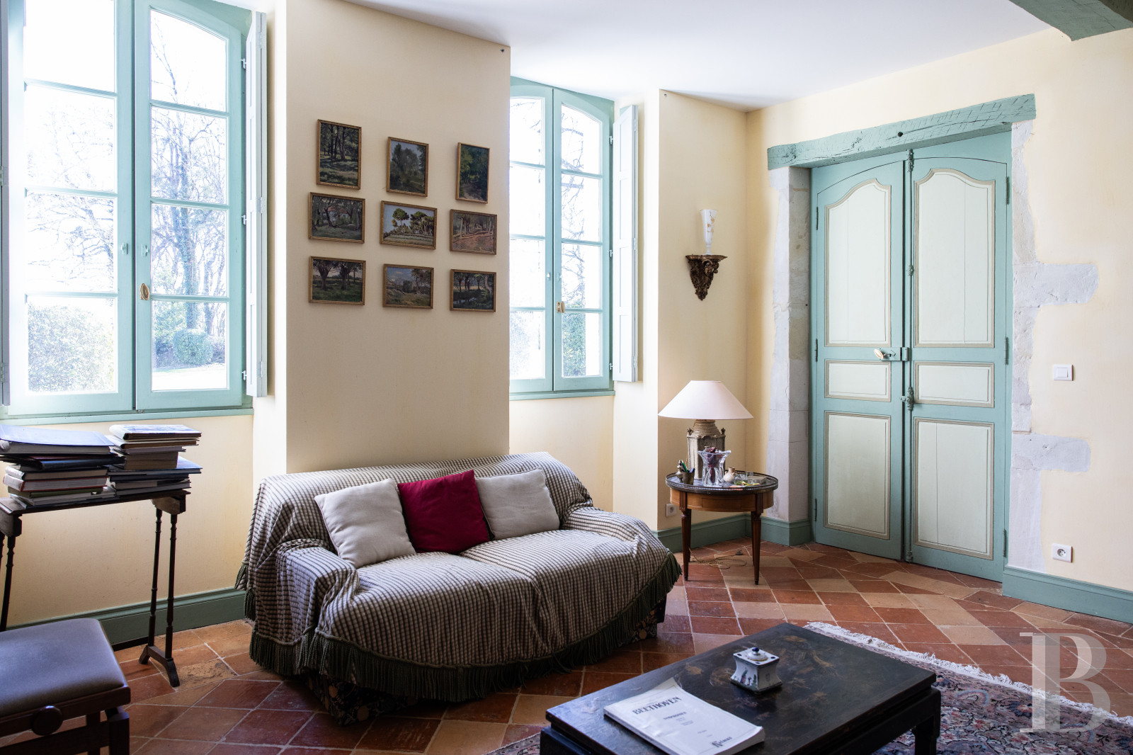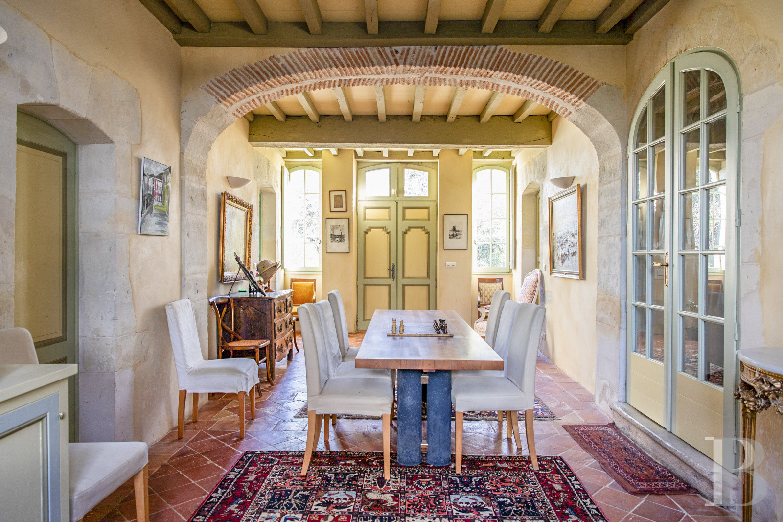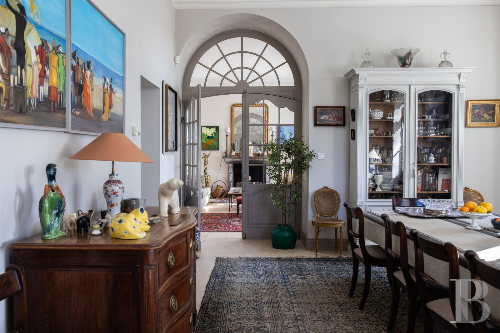 Il s’organise autour d’un vaste hall d’entrée traversant qui distribue trois salons de réception. Le plus vaste, d’un peu moins de 60 m² et où une cheminée est adossée à l’un des murs, donne sur la terrasse, avec vue sur la chaîne des Pyrénées. Les sols les plus anciens ont conservé leurs tommettes d’origine et la partie la plus récente est dallée de pierre de type travertin de couleur claire. Une salle à manger avec une double exposition sud et ouest et une cheminée ouvre sur une cuisine entièrement équipée, rénovée en 2012. À l’opposé, dans la partie la plus ancienne de la demeure, sont installés une seconde cuisine également équipée et un appartement indépendant d’environ 38 m² avec salon, chambre et salle de douche. Une disposition idéale pour recevoir amis et famille ou pour y loger du personnel.