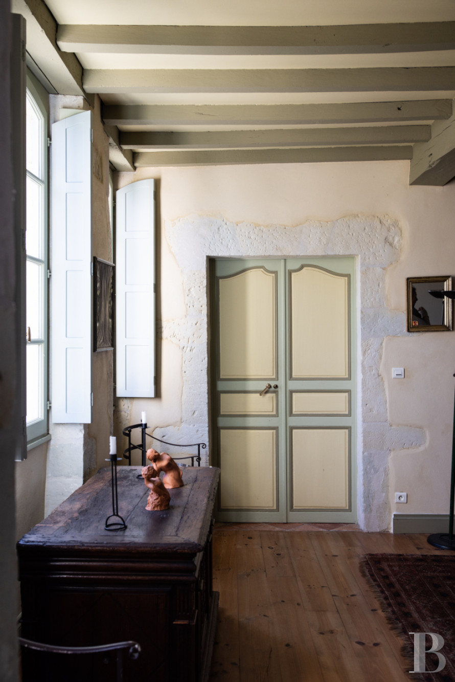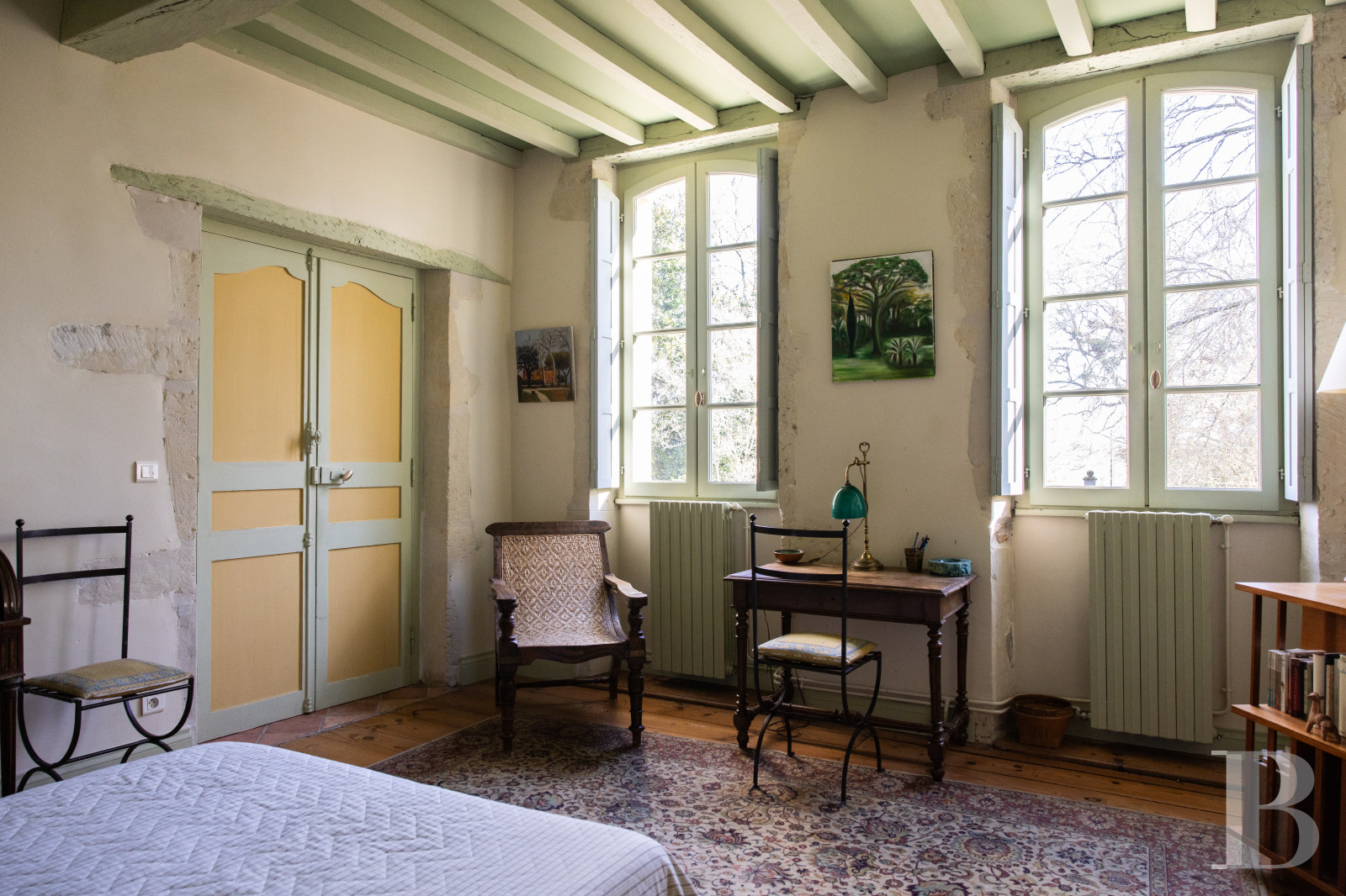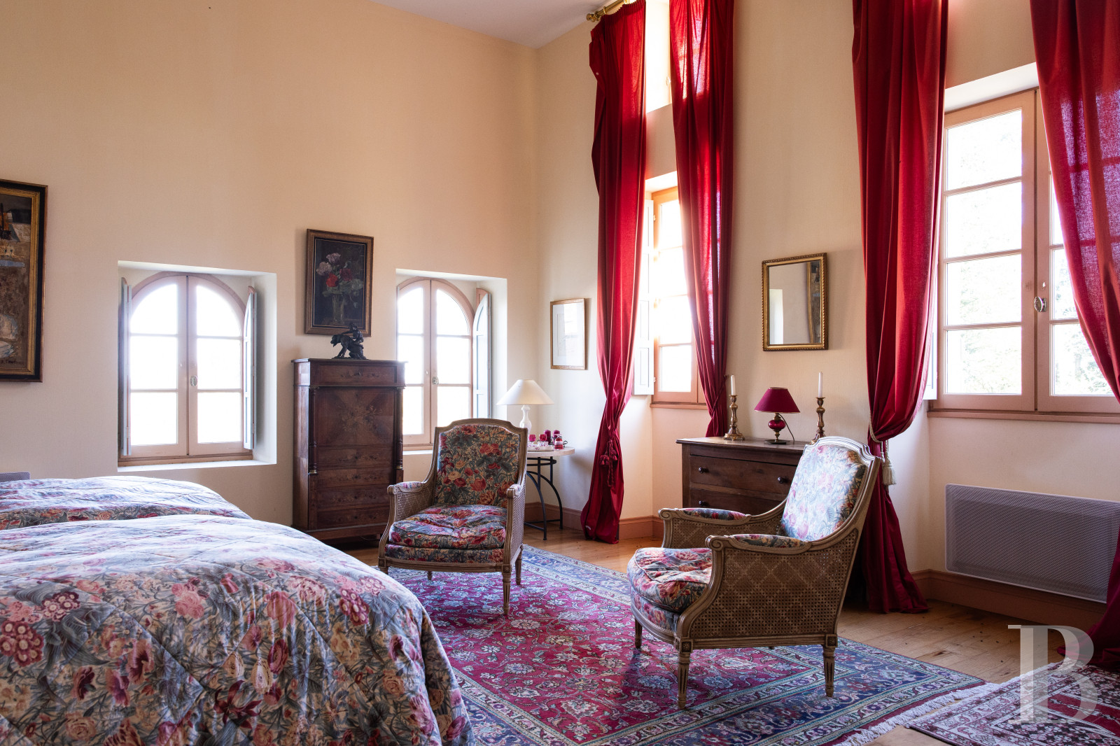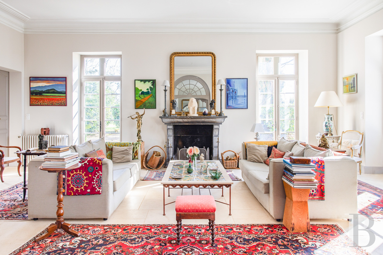 Il s’organise autour d’un vaste hall d’entrée traversant qui distribue trois salons de réception. Le plus vaste, d’un peu moins de 60 m² et où une cheminée est adossée à l’un des murs, donne sur la terrasse, avec vue sur la chaîne des Pyrénées. Les sols les plus anciens ont conservé leurs tommettes d’origine et la partie la plus récente est dallée de pierre de type travertin de couleur claire. Une salle à manger avec une double exposition sud et ouest et une cheminée ouvre sur une cuisine entièrement équipée, rénovée en 2012. À l’opposé, dans la partie la plus ancienne de la demeure, sont installés une seconde cuisine également équipée et un appartement indépendant d’environ 38 m² avec salon, chambre et salle de douche. Une disposition idéale pour recevoir amis et famille ou pour y loger du personnel.