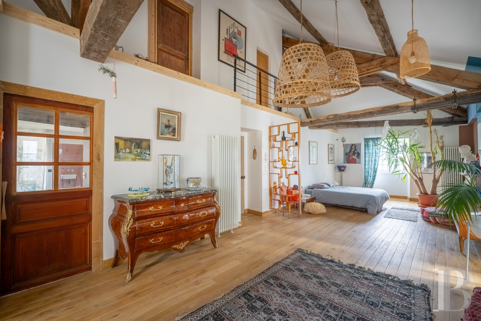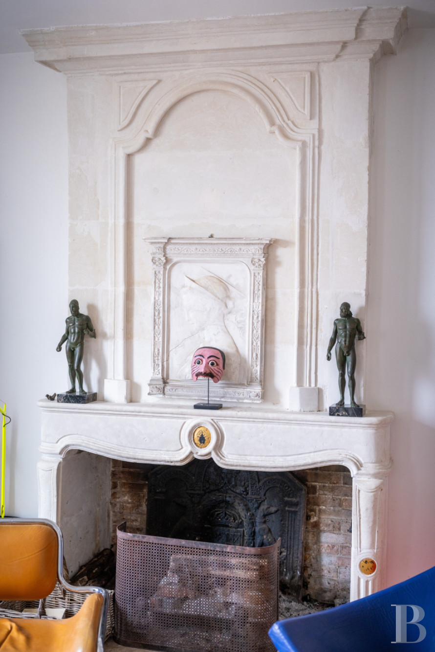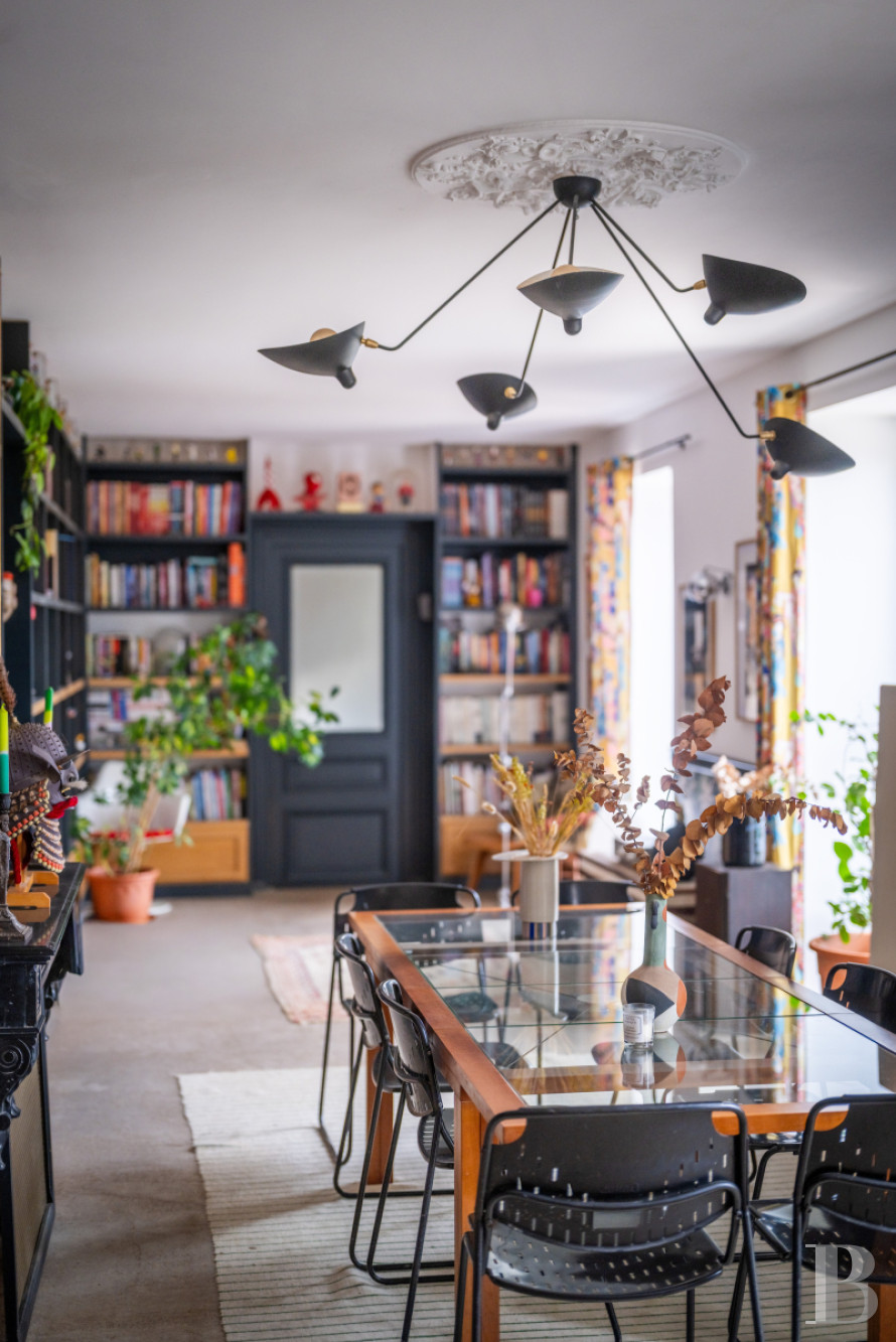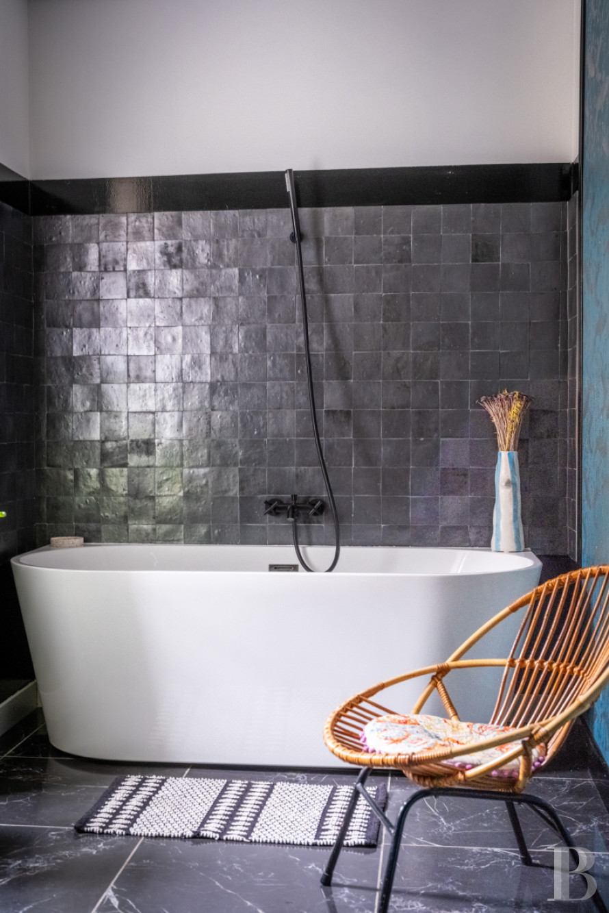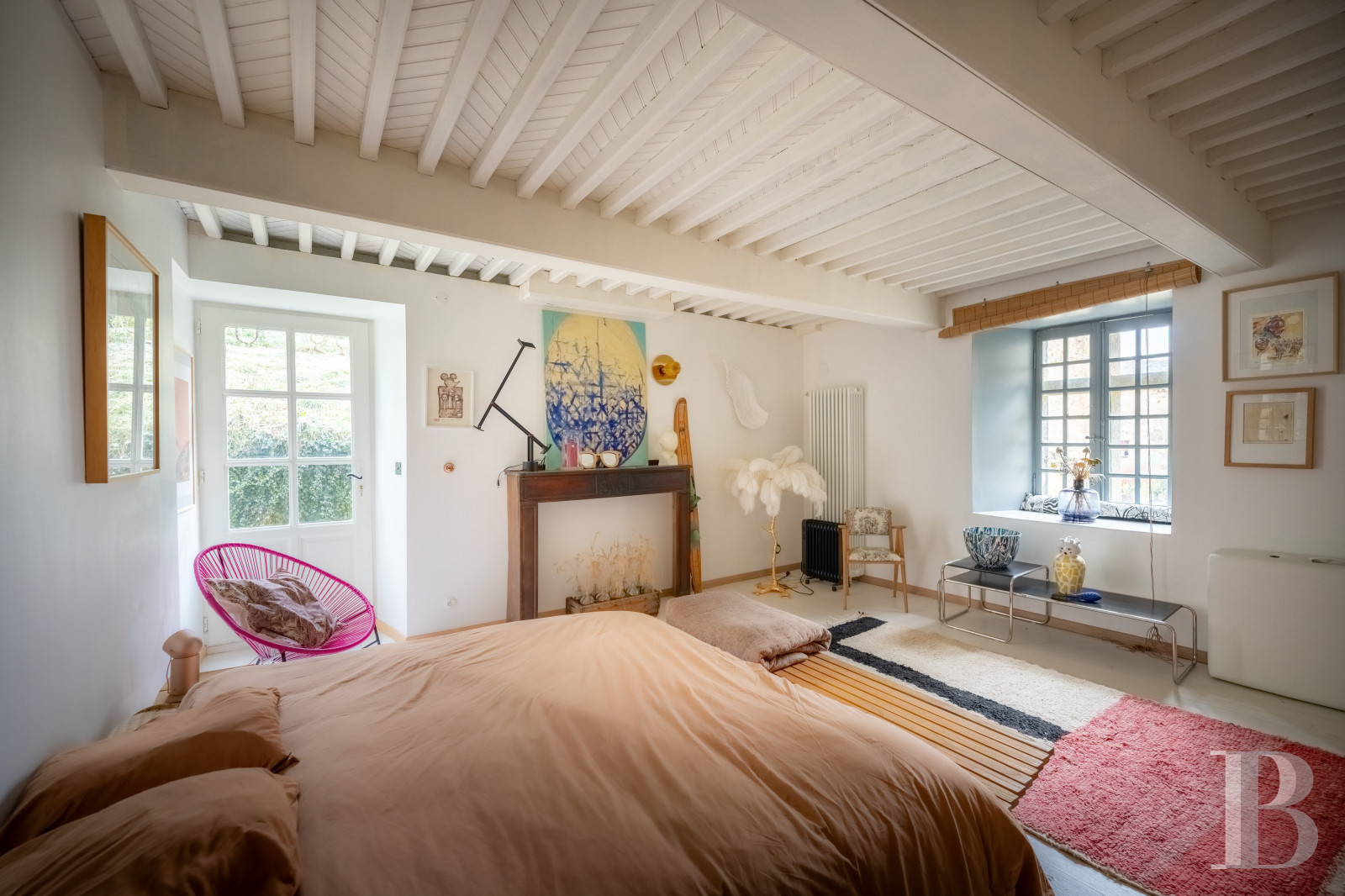 Le palier dessert un vaste espace de garde-robe aménagé sur mesure. Un long couloir, éclairé par les baies en triptyque, pourrait servir de lieu d’exposition, dans un esprit de galerie, et mène à une salle de bibliothèque de plus de 13 m de long. Deux de ses murs sont garnis d’étagères fixes de forte épaisseur, peintes dans des tonalités inspirées de Mondrian, et une cheminée en pierre de taille en marque le centre. Au sud, une grande salle de jeux, ouverte sur trois orientations, comprend des toilettes aménagées dans la tour ronde. À l’autre extrémité du château, un vaste ensemble s’étire sur d’environ 100 m² où une chambre, longue de près de 12 m, révèle en double hauteur la charpente apparente et comporte une cheminée en marbre blanc veiné de noir. Une salle de bains, avec baignoire et douche, traitée dans un style contemporain, conserve une cheminée ancienne en marbre gris. L’ensemble se développe dans la tour et comprend un vaste bureau avec tomettes hexagonales, cheminée en marbre blanc et baie dont l’ébrasement est entièrement fait de bois naturel. Un escalier mène enfin à un salon aménagé dans les combles de la tour, véritable pièce retirée où la charpente en bois, remarquablement conservée, laisse entrevoir ses assemblages.