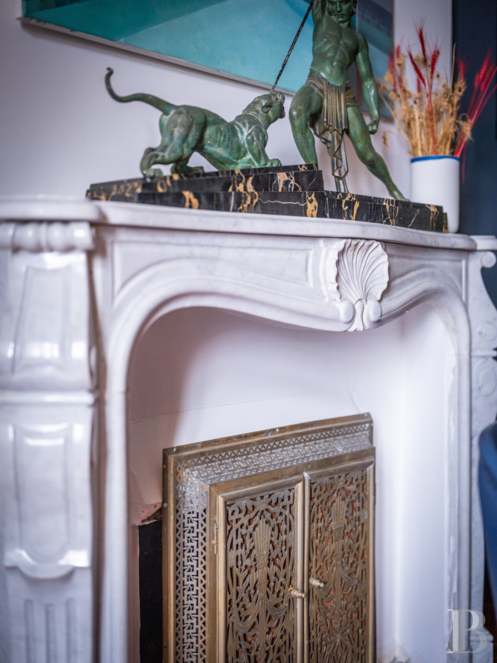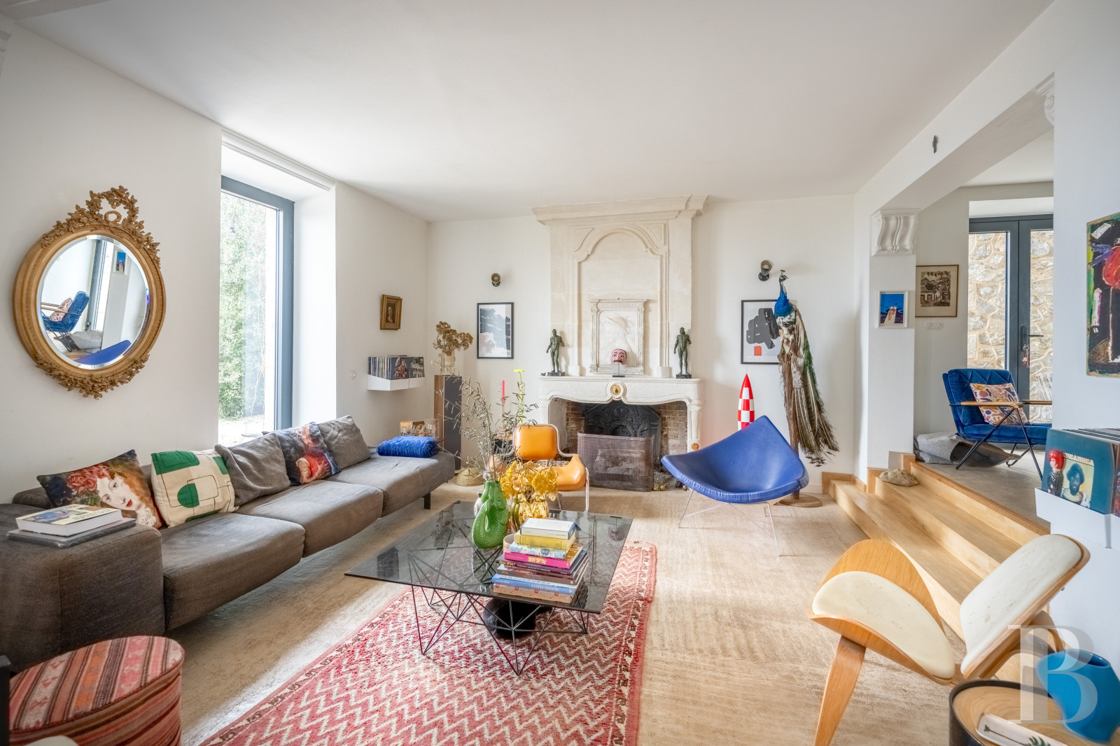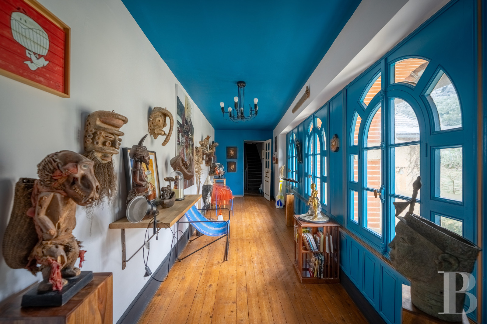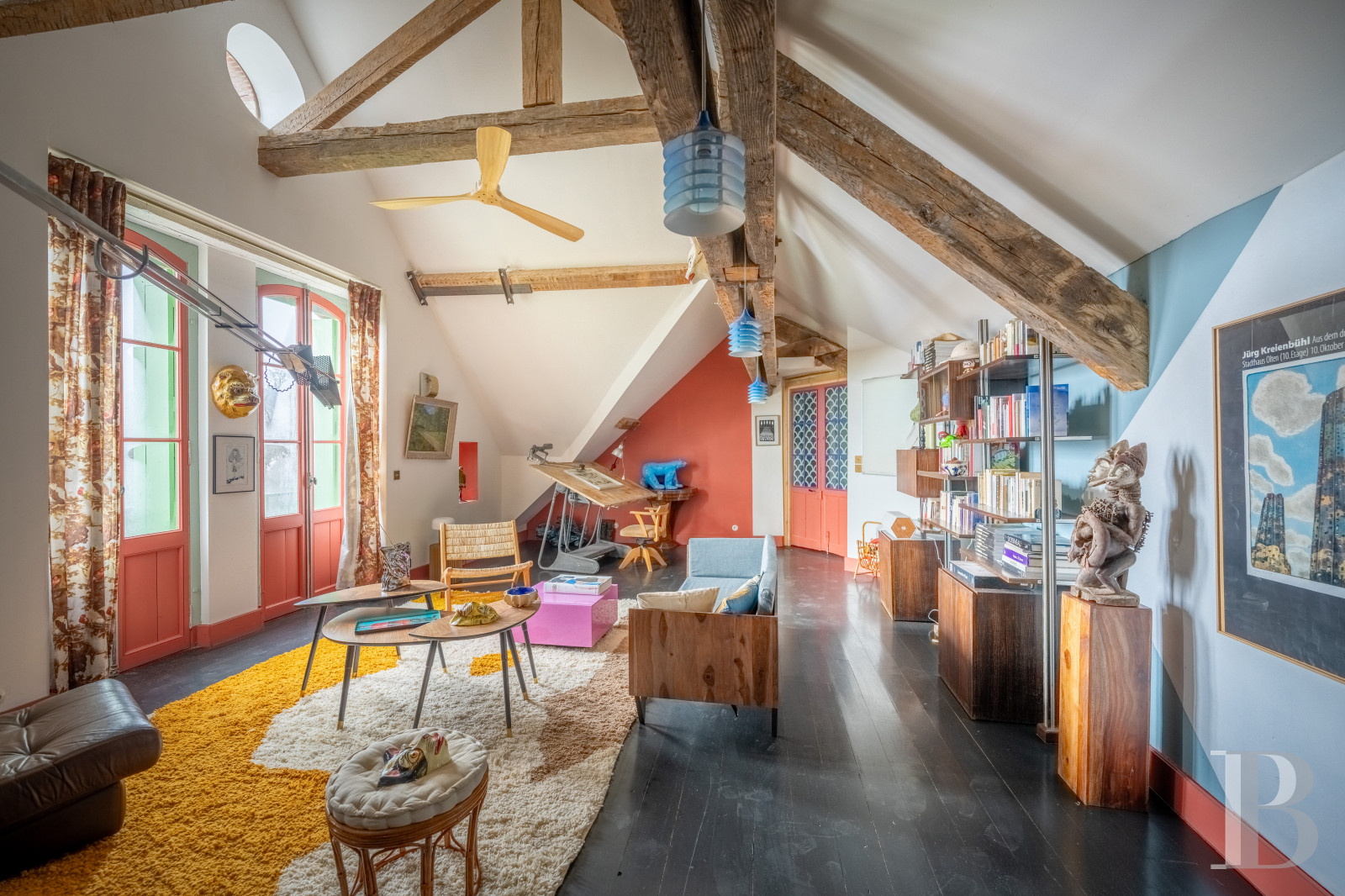 Le palier dessert un vaste espace de garde-robe aménagé sur mesure. Un long couloir, éclairé par les baies en triptyque, pourrait servir de lieu d’exposition, dans un esprit de galerie, et mène à une salle de bibliothèque de plus de 13 m de long. Deux de ses murs sont garnis d’étagères fixes de forte épaisseur, peintes dans des tonalités inspirées de Mondrian, et une cheminée en pierre de taille en marque le centre. Au sud, une grande salle de jeux, ouverte sur trois orientations, comprend des toilettes aménagées dans la tour ronde. À l’autre extrémité du château, un vaste ensemble s’étire sur d’environ 100 m² où une chambre, longue de près de 12 m, révèle en double hauteur la charpente apparente et comporte une cheminée en marbre blanc veiné de noir. Une salle de bains, avec baignoire et douche, traitée dans un style contemporain, conserve une cheminée ancienne en marbre gris. L’ensemble se développe dans la tour et comprend un vaste bureau avec tomettes hexagonales, cheminée en marbre blanc et baie dont l’ébrasement est entièrement fait de bois naturel. Un escalier mène enfin à un salon aménagé dans les combles de la tour, véritable pièce retirée où la charpente en bois, remarquablement conservée, laisse entrevoir ses assemblages.