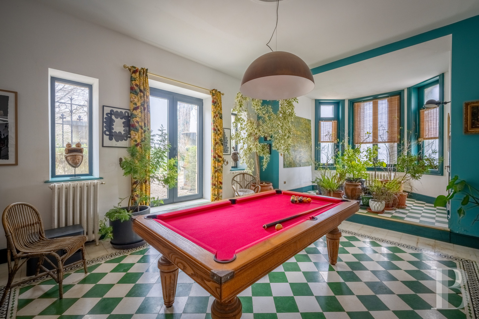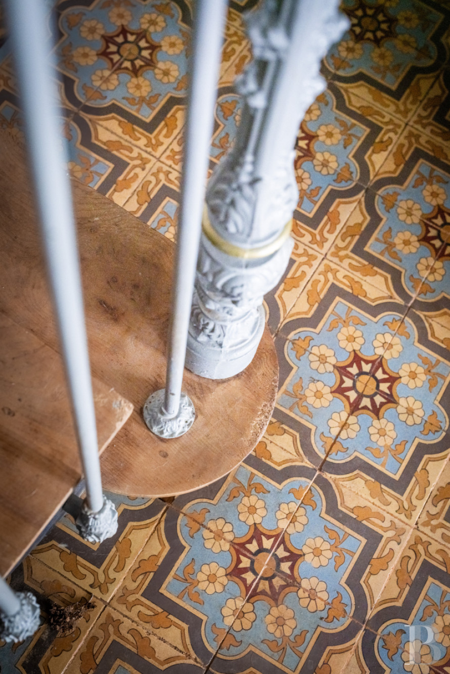 Le hall d’entrée, pavé de dalles de schiste anciennes et ouvert en double hauteur, distribue d’un côté, un escalier vers plusieurs chambres d’invités ; dans l’axe, une salle à manger ; et à l'opposé, un couloir qui dessert l’escalier de la partie habitation. La salle à manger, longue d’environ 13 m, est particulièrement lumineuse grâce à ses quatre baies qui donnent sur une terrasse à l’ouest. Trois murs sont occupés par une bibliothèque intégrée qui encadrent une cheminée en marbre noir de style classique. Le sol est en béton ciré. La pièce communique au sud avec une salle de billard, dallée de carreaux bicolores avec frise décorative et installée dans l’oriel. De l’autre côté, la salle à manger ouvre sur un salon aux tonalités claires, ponctué de consoles moulurées et d’une cheminée en pierre de taille à l’ornementation curviligne. Deux marches conduisent à une cuisine, traitée dans un style sobre et contemporain. Le sol est en ciment ciré ; le mobilier, réalisé sur mesure en chêne massif, jouxte des plans de travail et des jouées en pierre naturelle. En retour, une seconde petite salle à manger dessert une buanderie, une chaufferie et la cour arrière. Depuis la cuisine, l’accès à la tour se fait en traversant successivement un dégagement avec toilettes, un vaste bureau et un cellier. Le château conserve des éléments du 19e s., notamment des menuiseries intérieures et extérieures, ainsi qu’un escalier métallique finement ornementé et ses marches en chêne, qui mène à un palier au sol de carreaux de ciment aux tons ocre et bleu.