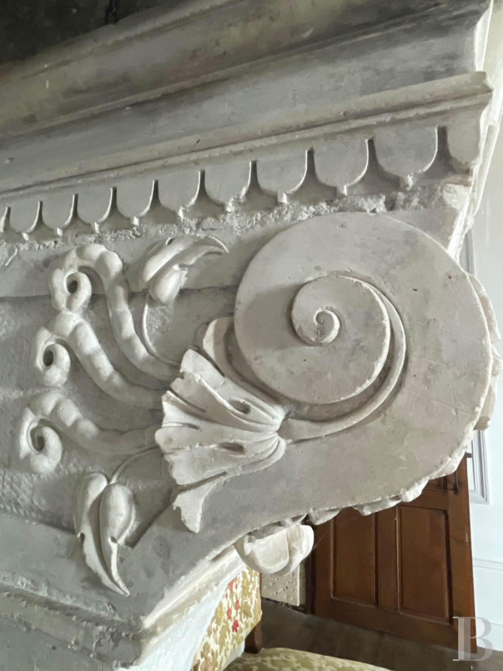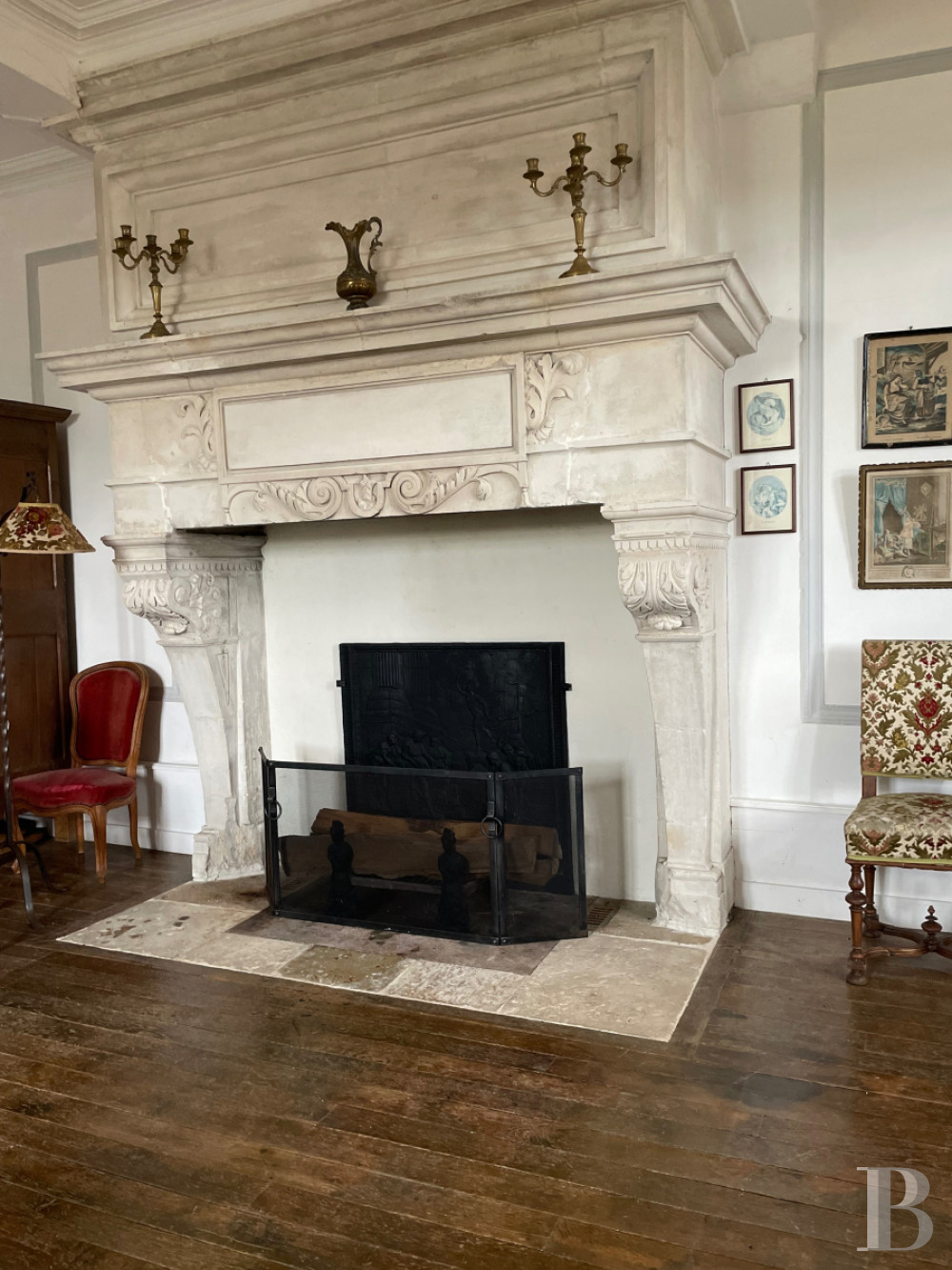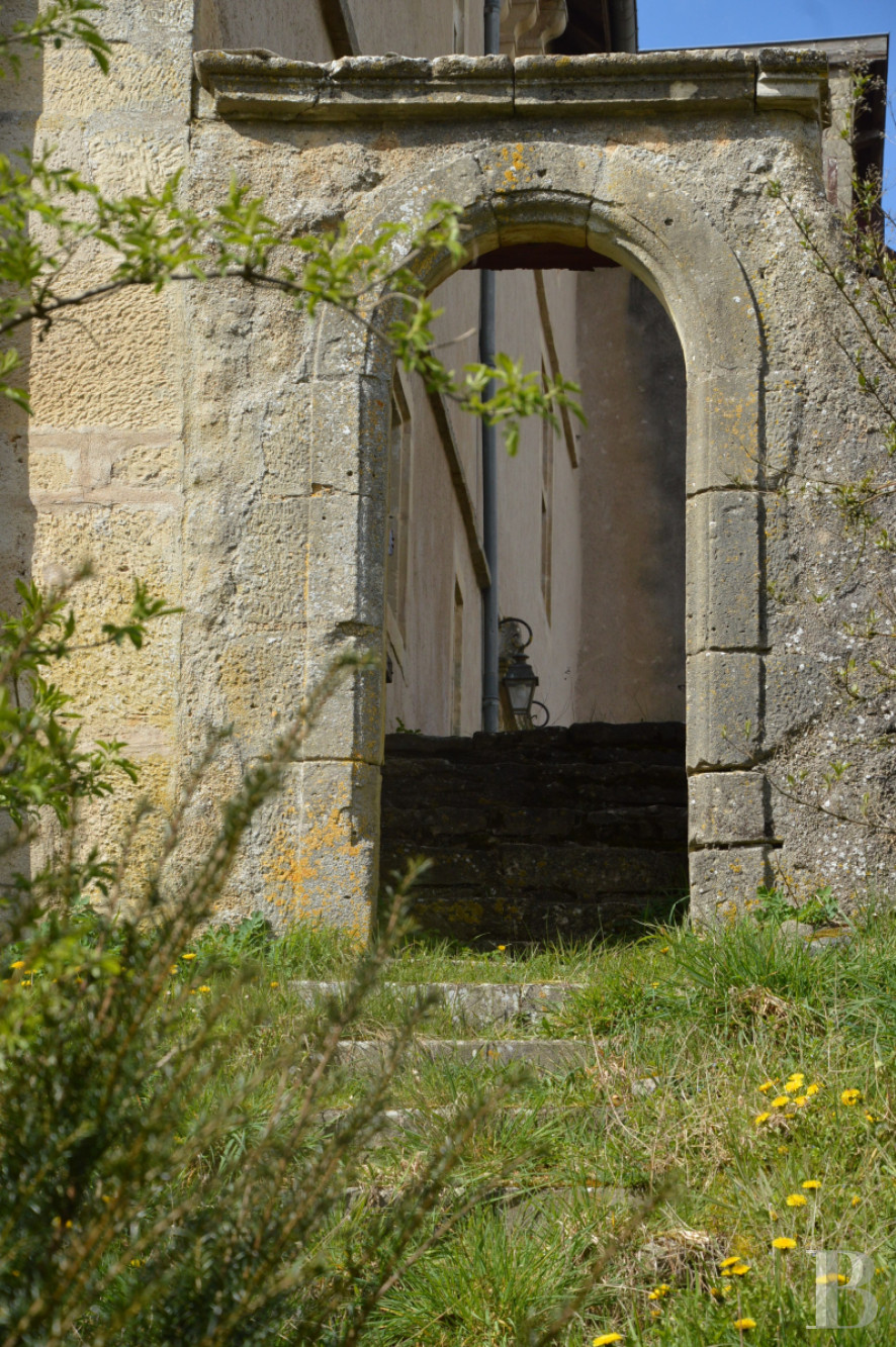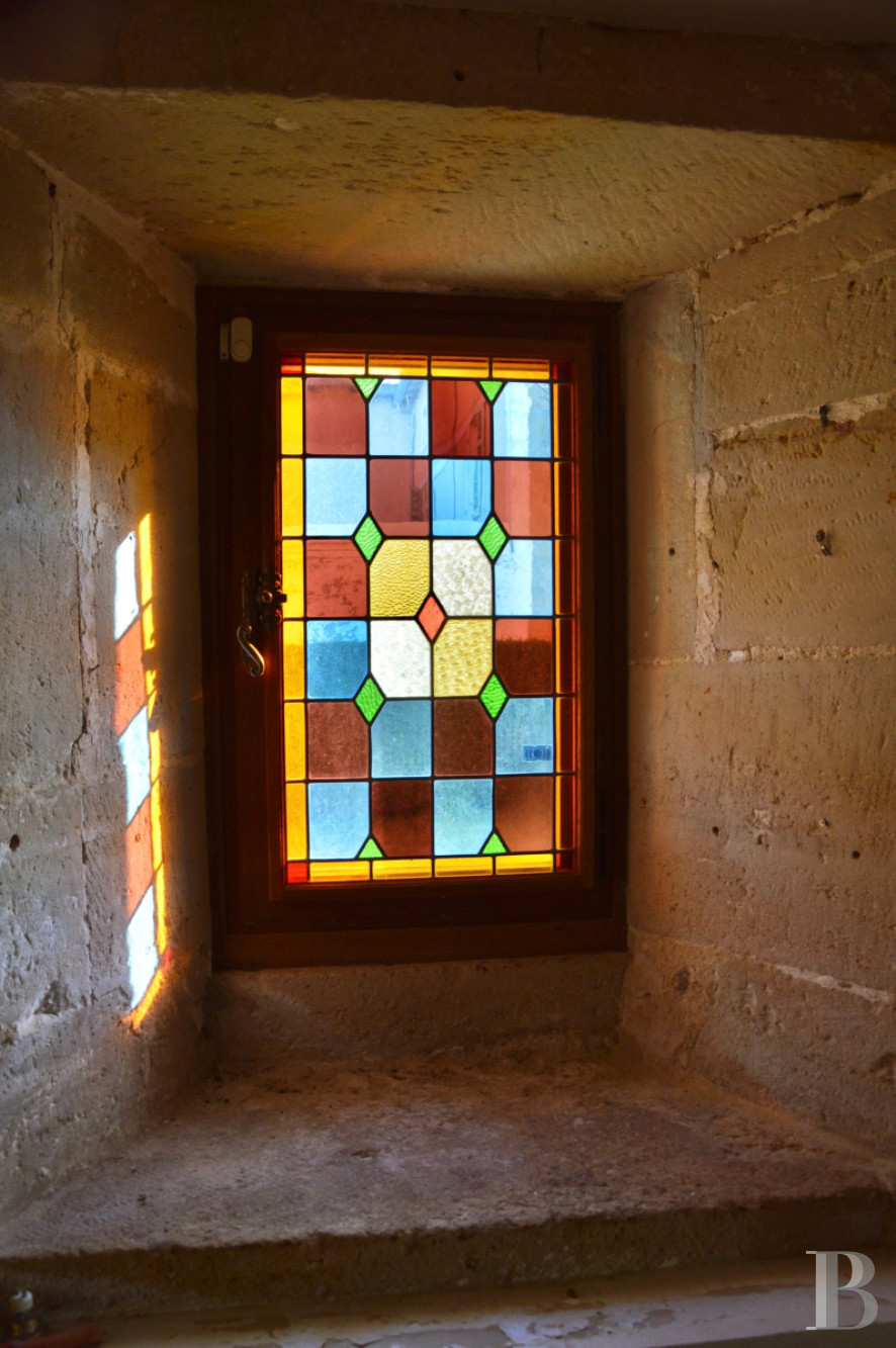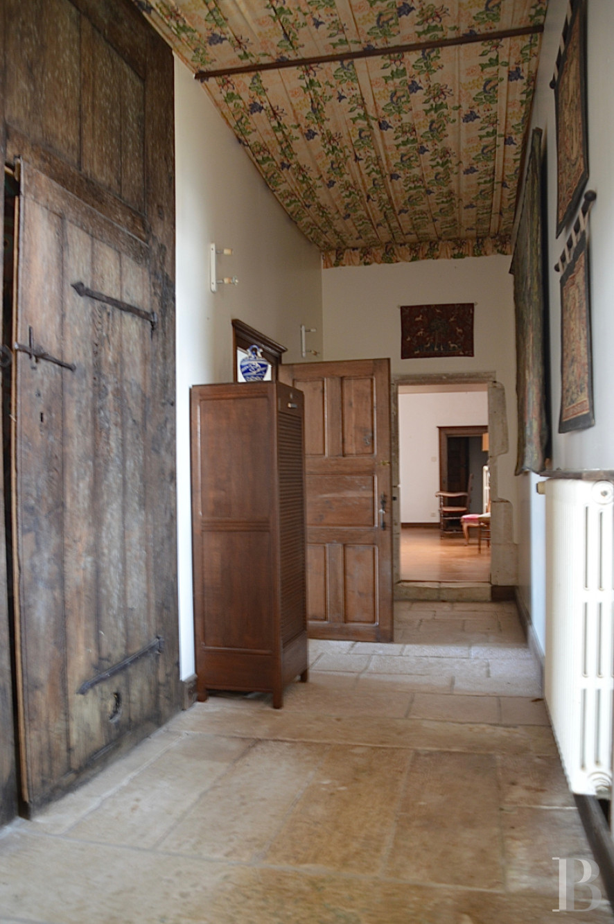 Depuis le hall d'entrée, un escalier en pierre avec palier de repos, patiné par les siècles, permet d'accéder au premier étage. Un couloir mène à une chambre d'environ 48m2 ouverte sur l'échauguette, remarquable poste d'observation sur la vallée. La cheminée en pierre du 16e s. comporte une hotte droite et une cornique moulurée. Les pieds droits galbés sont surmontés d'un linteau à corniche identique. Finement ouvragée de coquillages se terminant par des bouquets fleuris, des palmettes, rosettes et triglyphes. La plaque de fonte qui garnit le contrecoeur porte la date de 1636. Ce niveau comprend également une salle de bain avec une baignoire et une douche ainsi que des toilettes séparés, une vaste bibliothèque d'environ 40m2 qui précède le premier étage du bâtiment sur rue. Celui-ci se compose de deux chambres, une lingerie, une salle de bain et des toilettes.