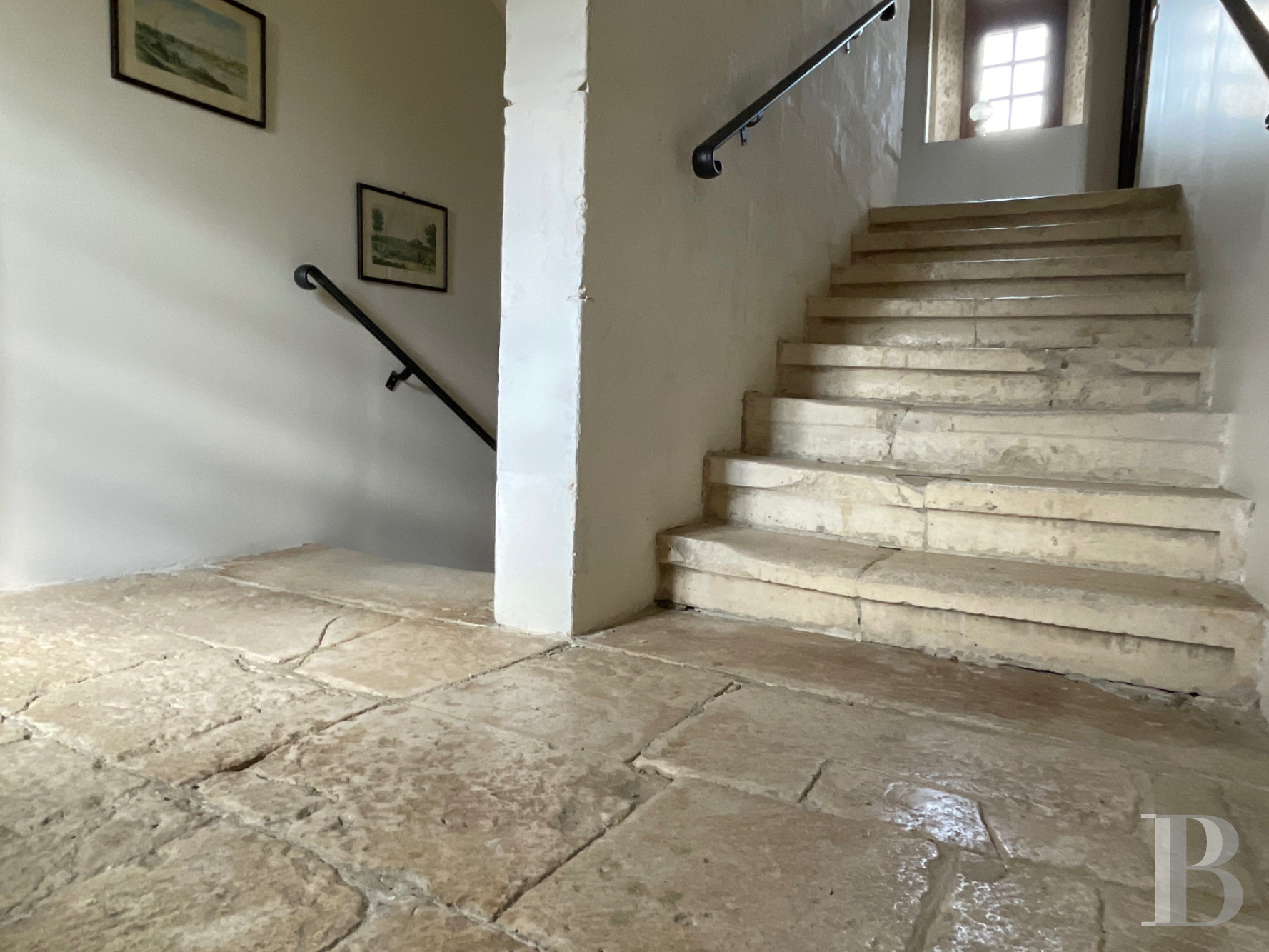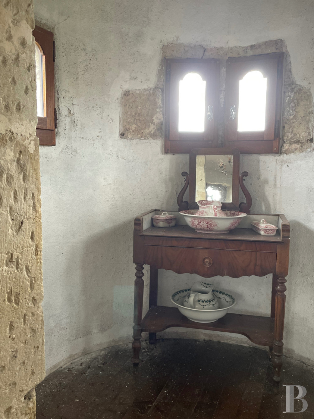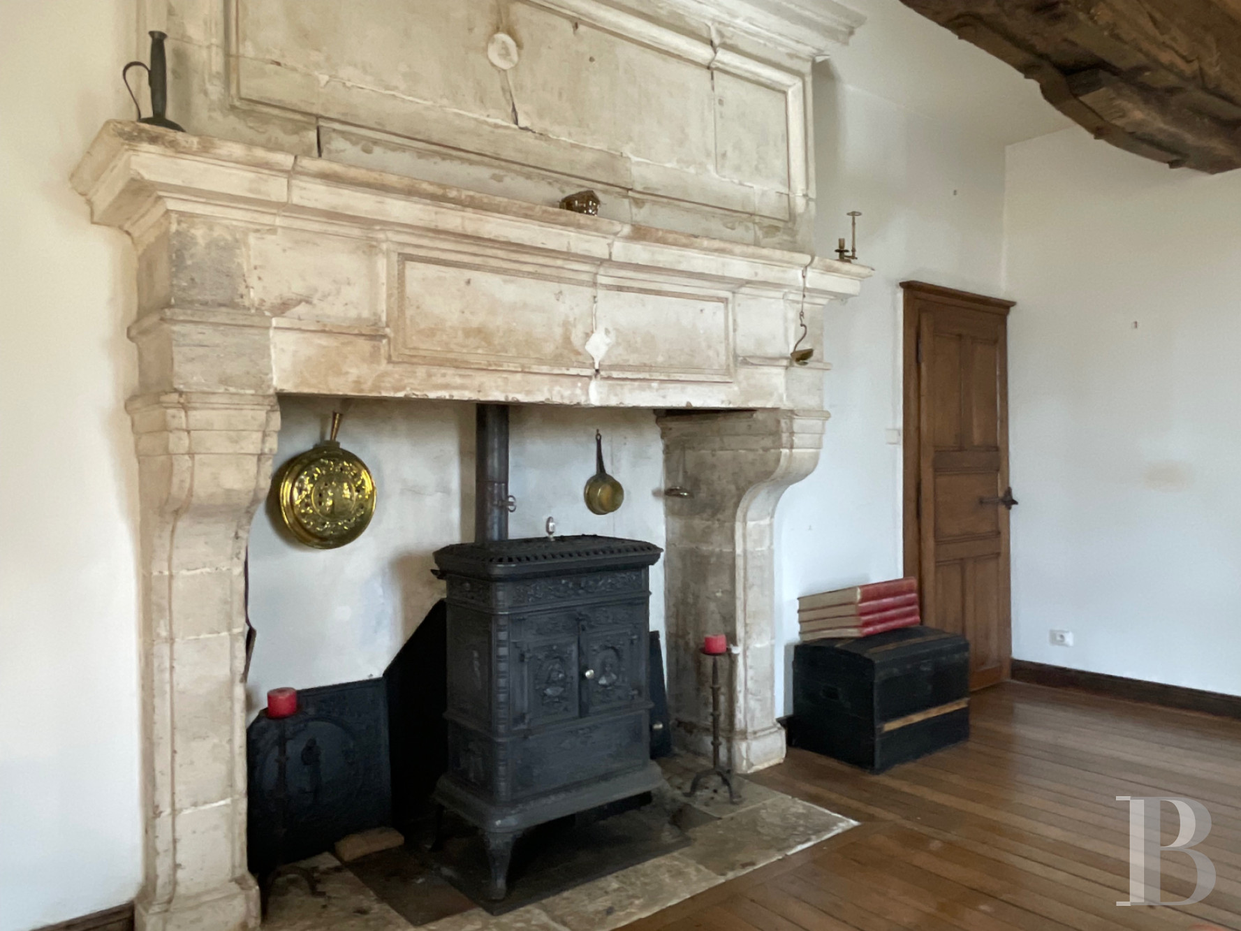 L'escalier en pierre avec palier de repos qui mène à ce niveau est dissimulé par une porte rustique en chêne. Le plancher est recouvert de laine de verre.