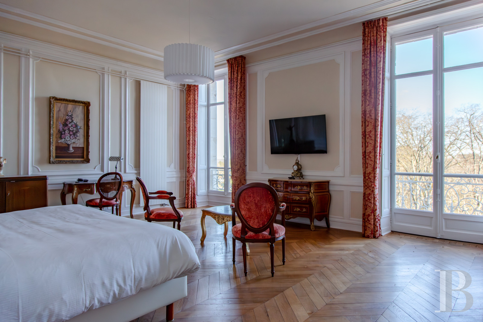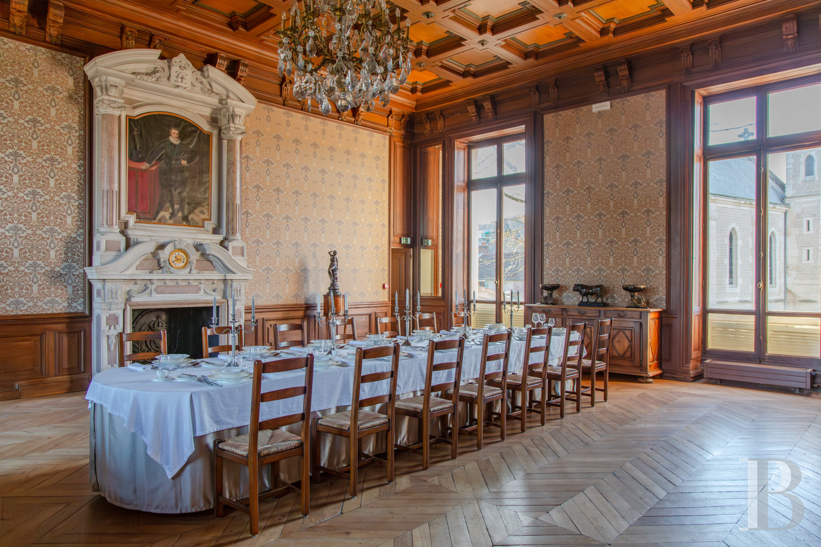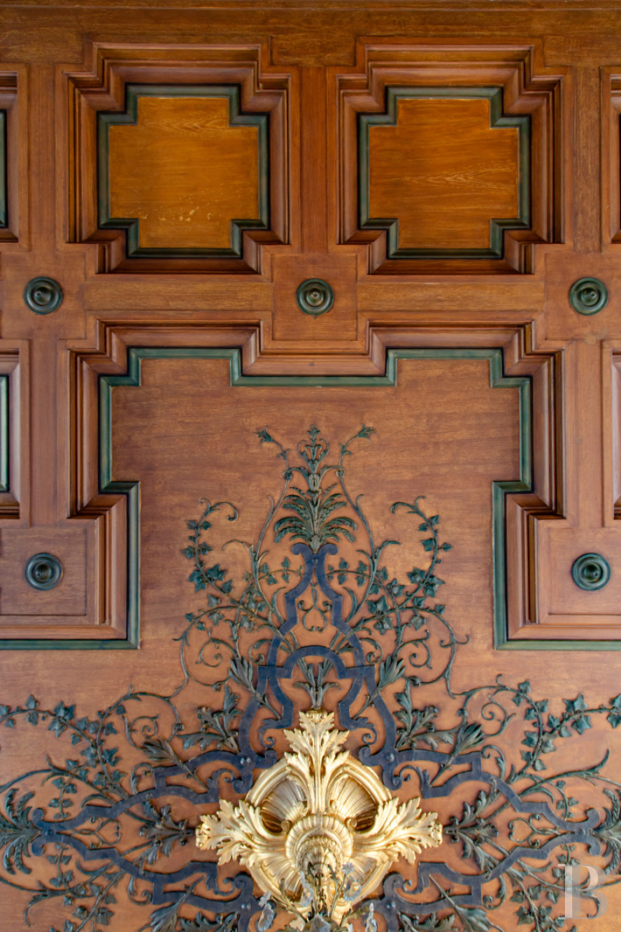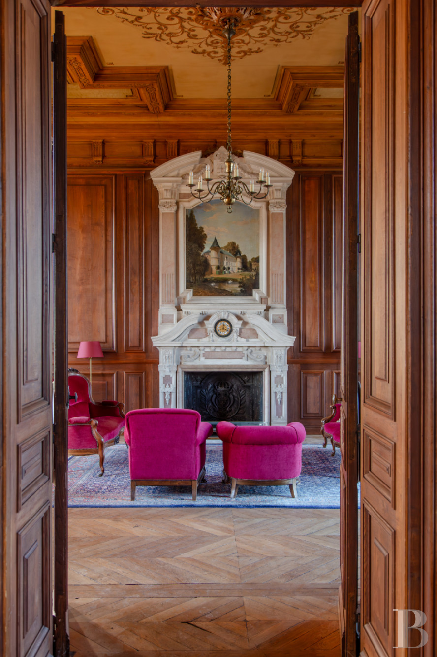 À ce niveau se tiennent en enfilade des salons de réception, propices aux repas autour d’une table d’hôtes comme aux formats davantage évènementiels. Ils ont conservé un décor authentique, typique des demeures du 19e s. : boiseries sur toute la hauteur, plafonds à caissons moulurés, parquets à point de Hongrie, cheminée monumentale. Les hautes fenêtres ouvertes sur le paysage accentuent l’ampleur des pièces, qui reçoivent une abondante lumière naturelle. L’ensemble témoigne d’une recherche décorative singulière, où l’art du décor intérieur se conjugue au savoir-faire des artisans d’art.