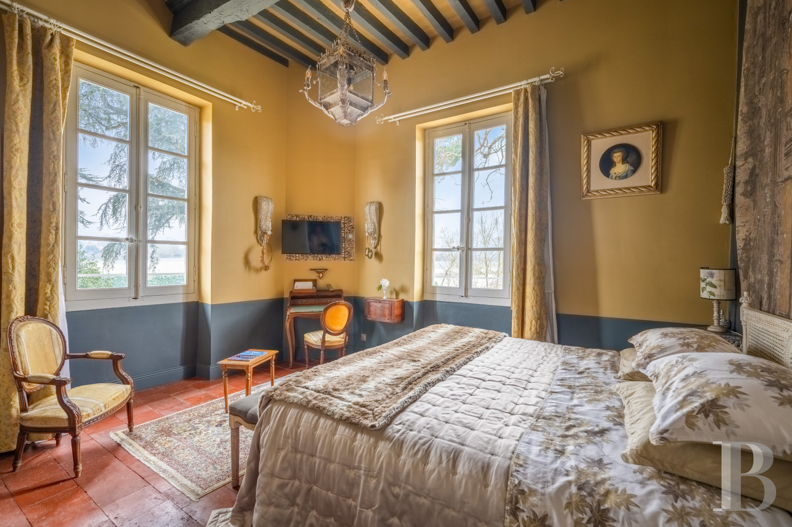 À l’étage, dans l’aile nord, un large couloir mène à une chambre consacrée à l’illustre ancien occupant des lieux, Lapérouse. Elle intègre une cheminée à manteau en bois surmontée d’un miroir délicatement orné. Le plafond est décoré d’un médaillon peint, tandis que le sol est pavé de carreaux de terre cuite. La chambre est orientée à l’ouest et jouxte une salle d’eau. Une seconde chambre, également située dans l’aile nord, comprend une salle d’eau contemporaine et donne accès à une coursive au surplomb de la porte cochère, avec vue sur la cour et l’allée d’entrée. Dans l’aile sud, un couloir dessert d’abord une lingerie, puis un salon réservé aux invités. Celui-ci conserve un plafond à la française remarquable, une cheminée à manteau en bois surmonté d'un miroir. Les baies donnent sur la cour et le jardin, selon trois orientations et une luminosité constante. Le salon accède à une chambre et à une salle d’eau. Leurs sols sont dallés de carreaux de terre cuite et les plafonds laissent apparaître des planchers bois.