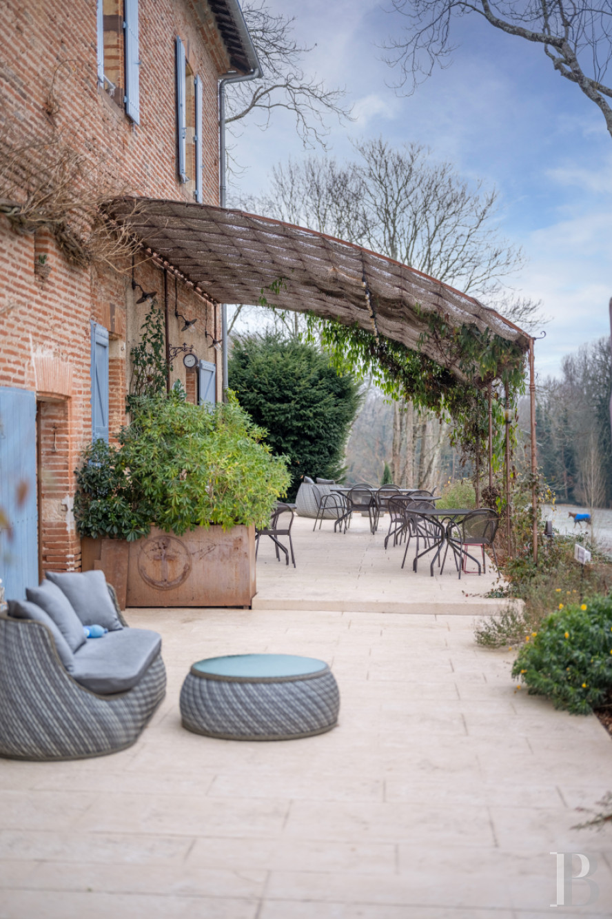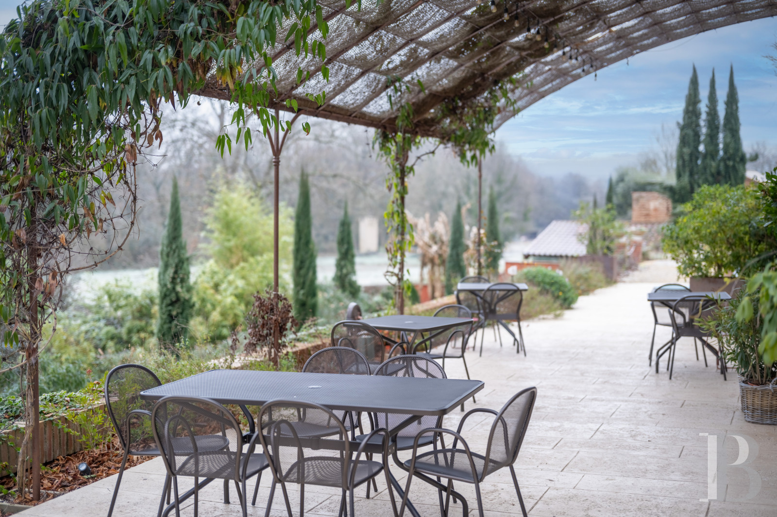 Les espaces extérieurs se partagent en plusieurs espaces autour du château. À l’avant, le jardin s’étend sur un même plateau et présente des parterres engazonnés ponctués d’arbres et d’arbustes, parmi lesquels un grand cèdre et un pin parasol. Au nord, une petite dépendance sert de garage et d’espace de stockage. La terrasse aménagée au pied des façades ouest et sud, sous une exposition favorable, est surmontée d’une pergola. Plusieurs murs de soutènement en maçonnerie organisent le terrain en deux niveaux vers les prés en contrebas. Deux escaliers maçonnés assurent la liaison entre les niveaux. Au sud, une piscine a été aménagée avec vue sur les prés et la rive toute proche du Tarn. À l’ouest, un ancien nymphée, probablement édifié au 19e s. et alimenté par une source, subsiste au milieu des bambous. Le fleuve est accessible à pied à travers les prés ; ses berges arborées ont un accès aisé à l’eau. Deux prés supplémentaires sont actuellement loués et peuvent continuer à l’être par les occupants selon leurs besoins.Ce que nous en pensons