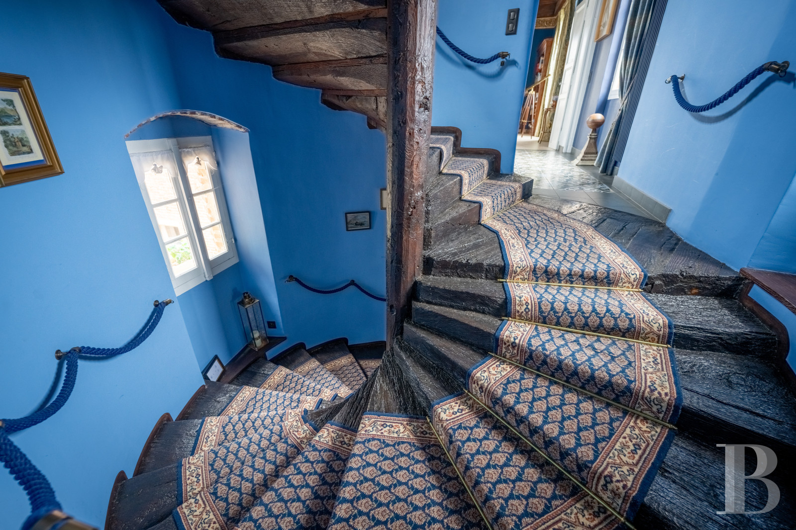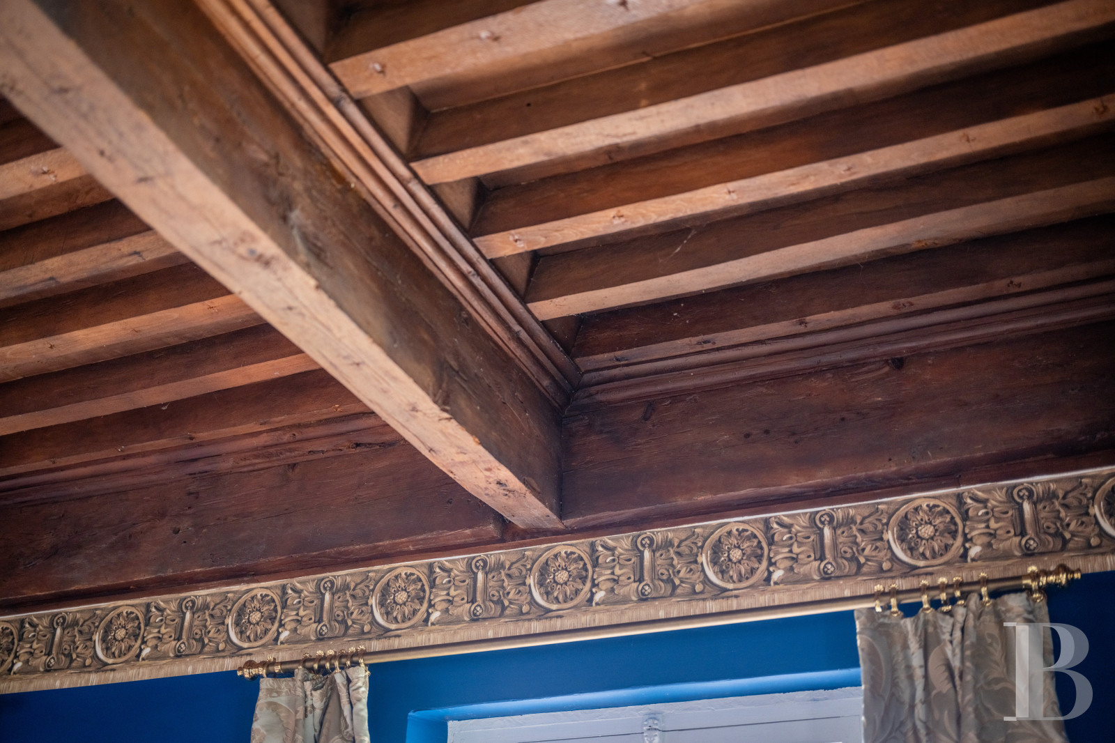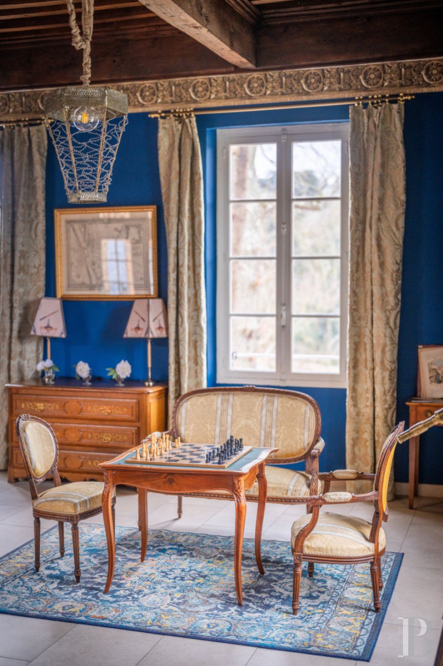 L’entrée ouvre sur un escalier à vis en bois du 17e s., ouvrage peu répandu qui constitue l’un des éléments majeurs du château. Une palier dessert une terrasse ainsi que les deux ailes. L’aile sud est accessible par un vaste dégagement qui comprend des toilettes et un accès direct à la cour. Ce hall conduit à une salle de séjour et salle à manger réunies en un même volume, sous un plafond à la française fait de poutres moulurées de forte section. Le plancher en bois ancien repose sur des solives apparentes. Une cheminée monumentale en brique, où un poêle a été installé, structure la pièce, très lumineuse grâce à sa triple orientation. Une ample cuisine, récemment aménagée dans un vocabulaire contemporain, fait écho aux proportions de l’édifice. Elle donne à la fois sur la cour et sur la terrasse. Dans l’aile nord, une première chambre présente un plafond à la française de même facture que celui du salon. De larges baies ouvrent à l’ouest sur la terrasse et au nord sur le jardin. La chambre est attenante à une salle de bains avec baignoire et douche, aménagée de façon contemporaine, ainsi qu’à une garde-robe en fond d’aile. Le rez-de-chaussée constitue l’espace de vie des occupants, tandis que l’étage est dédié à l’activité de chambres d’hôtes.