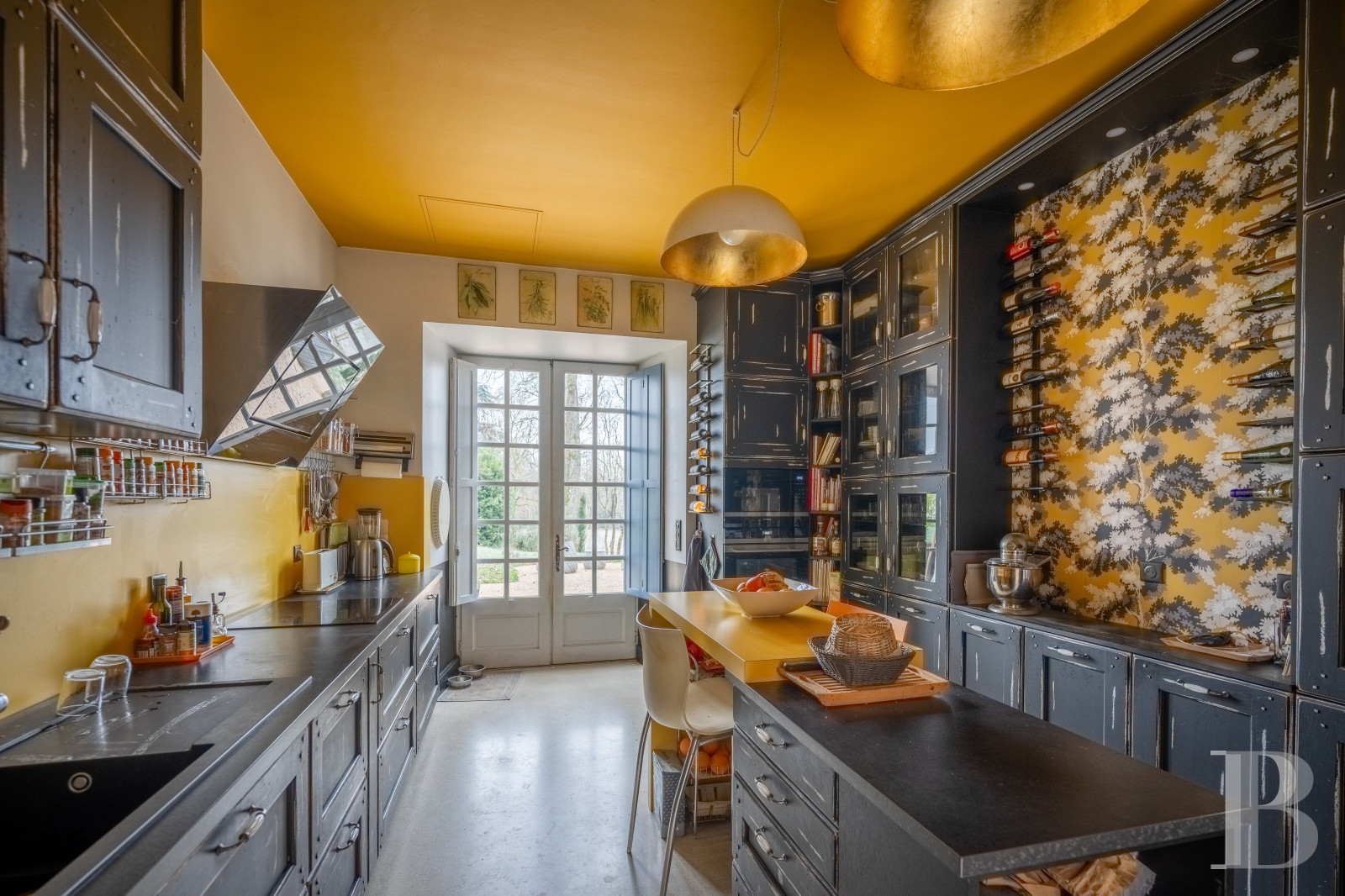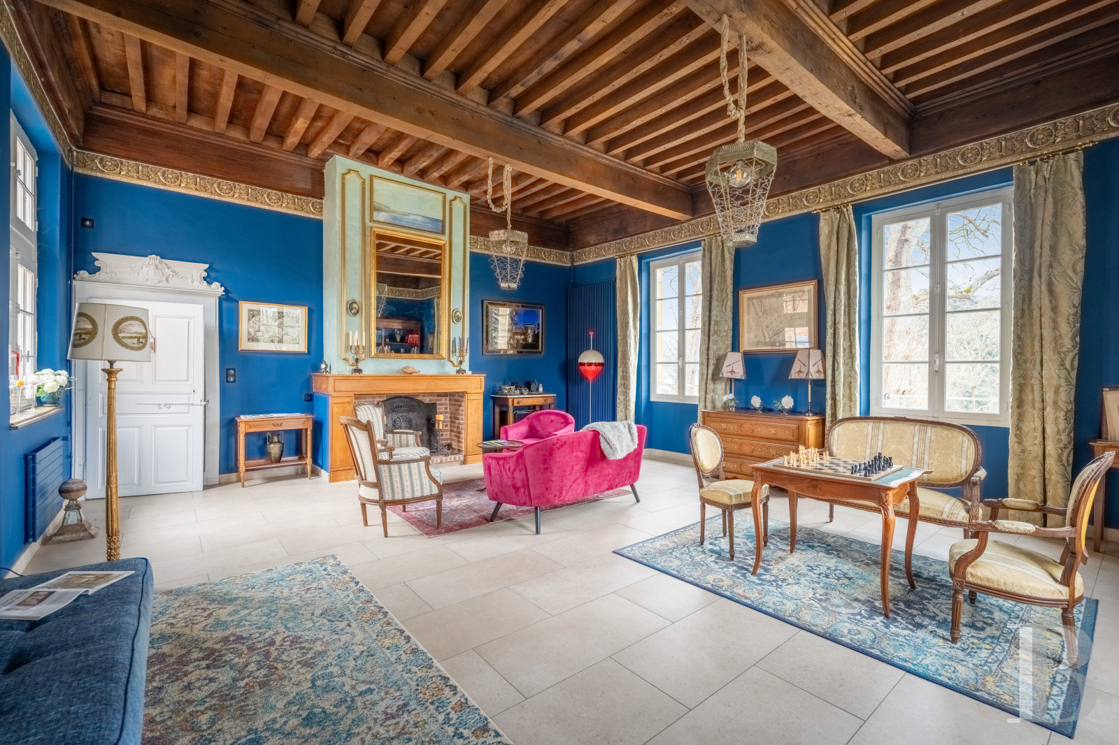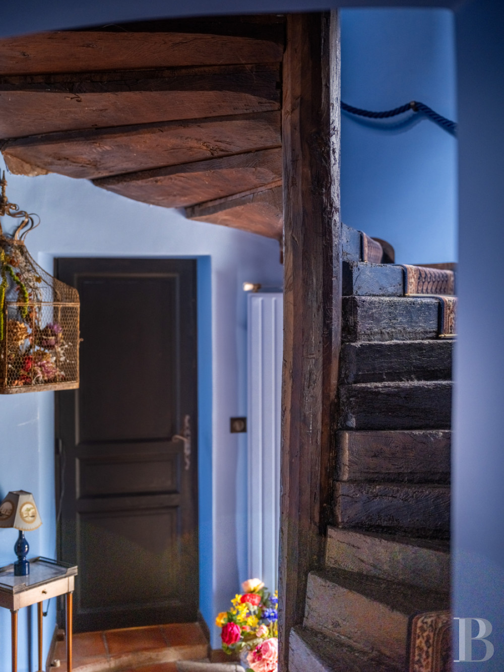 L’entrée ouvre sur un escalier à vis en bois du 17e s., ouvrage peu répandu qui constitue l’un des éléments majeurs du château. Une palier dessert une terrasse ainsi que les deux ailes. L’aile sud est accessible par un vaste dégagement qui comprend des toilettes et un accès direct à la cour. Ce hall conduit à une salle de séjour et salle à manger réunies en un même volume, sous un plafond à la française fait de poutres moulurées de forte section. Le plancher en bois ancien repose sur des solives apparentes. Une cheminée monumentale en brique, où un poêle a été installé, structure la pièce, très lumineuse grâce à sa triple orientation. Une ample cuisine, récemment aménagée dans un vocabulaire contemporain, fait écho aux proportions de l’édifice. Elle donne à la fois sur la cour et sur la terrasse. Dans l’aile nord, une première chambre présente un plafond à la française de même facture que celui du salon. De larges baies ouvrent à l’ouest sur la terrasse et au nord sur le jardin. La chambre est attenante à une salle de bains avec baignoire et douche, aménagée de façon contemporaine, ainsi qu’à une garde-robe en fond d’aile. Le rez-de-chaussée constitue l’espace de vie des occupants, tandis que l’étage est dédié à l’activité de chambres d’hôtes.