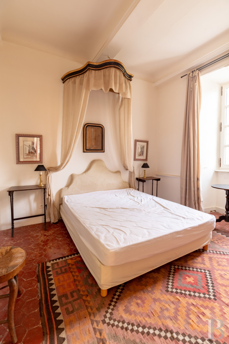 L'accès au deuxième niveau se fait par l'escalier en pierre, sobre et massif, qui part de l'entrée. Il débouche sur un grand hall qui dessert via un couloir au sol de tomettes sept chambres au sol carrelé de terre cuite en majorité, ou parqueté pour l'une d'elles ; cinq sont associées à des salles de bains et des toilettes, tandis qu'une en est dépourvue et une autre sert aux occupants actuels de buanderie.Toutes donnent soit sur la cour, soit sur le parc et certaines sont agrémentées de cheminées en marbre surmontées de trumeaux moulurés et, au plafond, de poutres coffrées.Enfin, une salle de douche commune, équipée de toilettes, a été aménagée sur un palier à mi-étage.