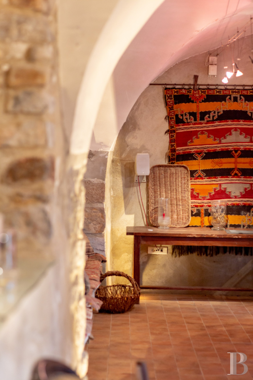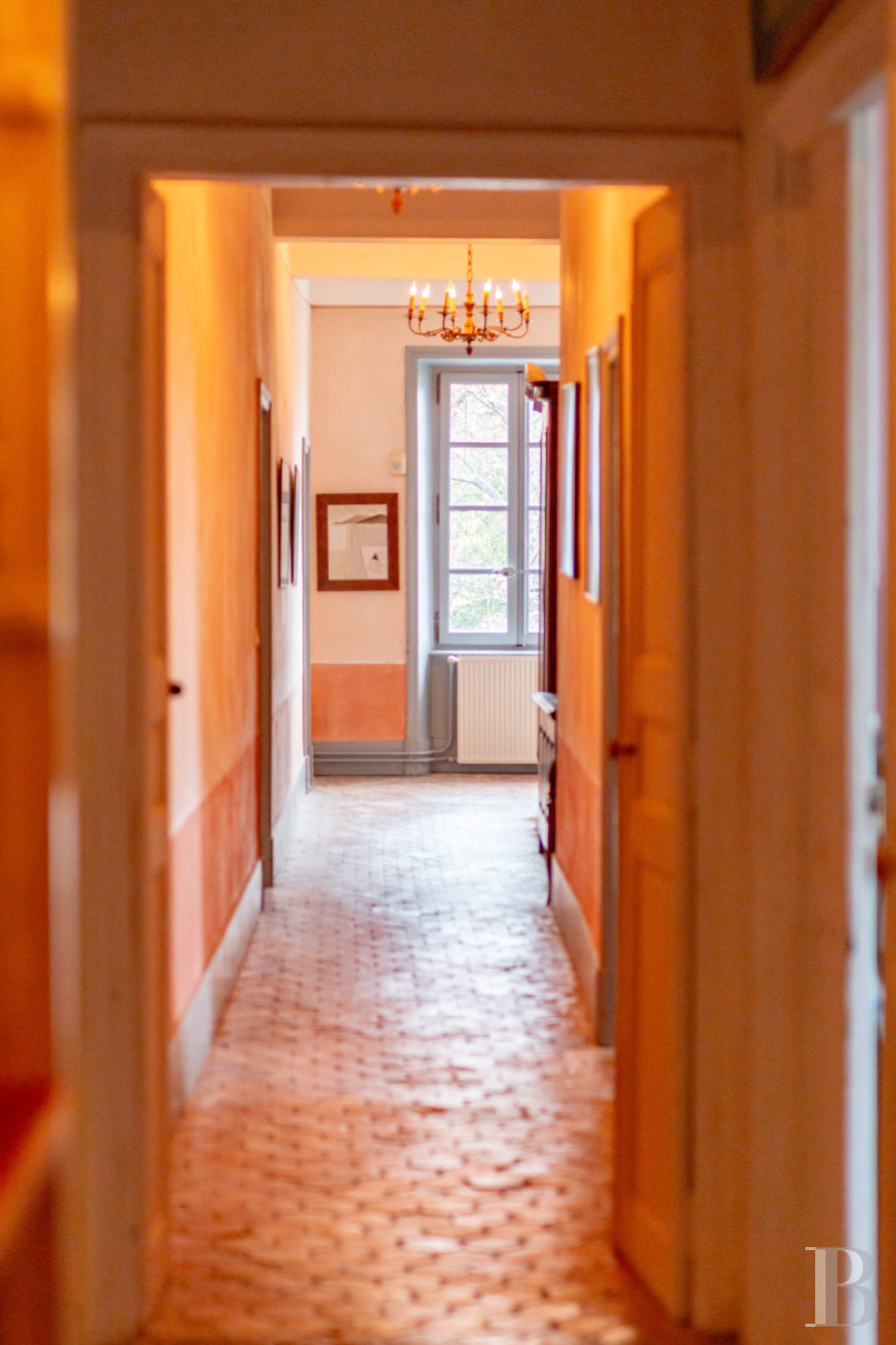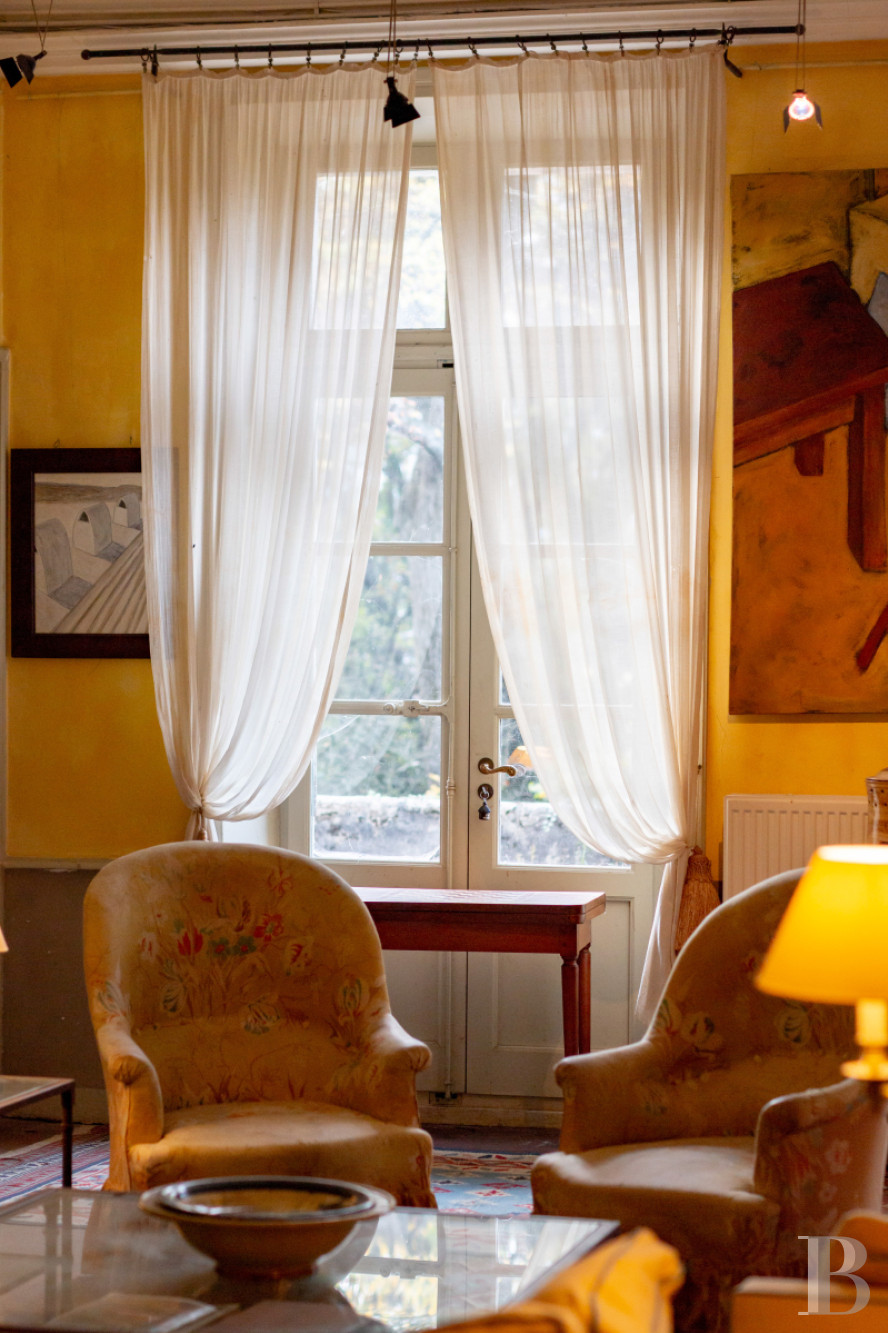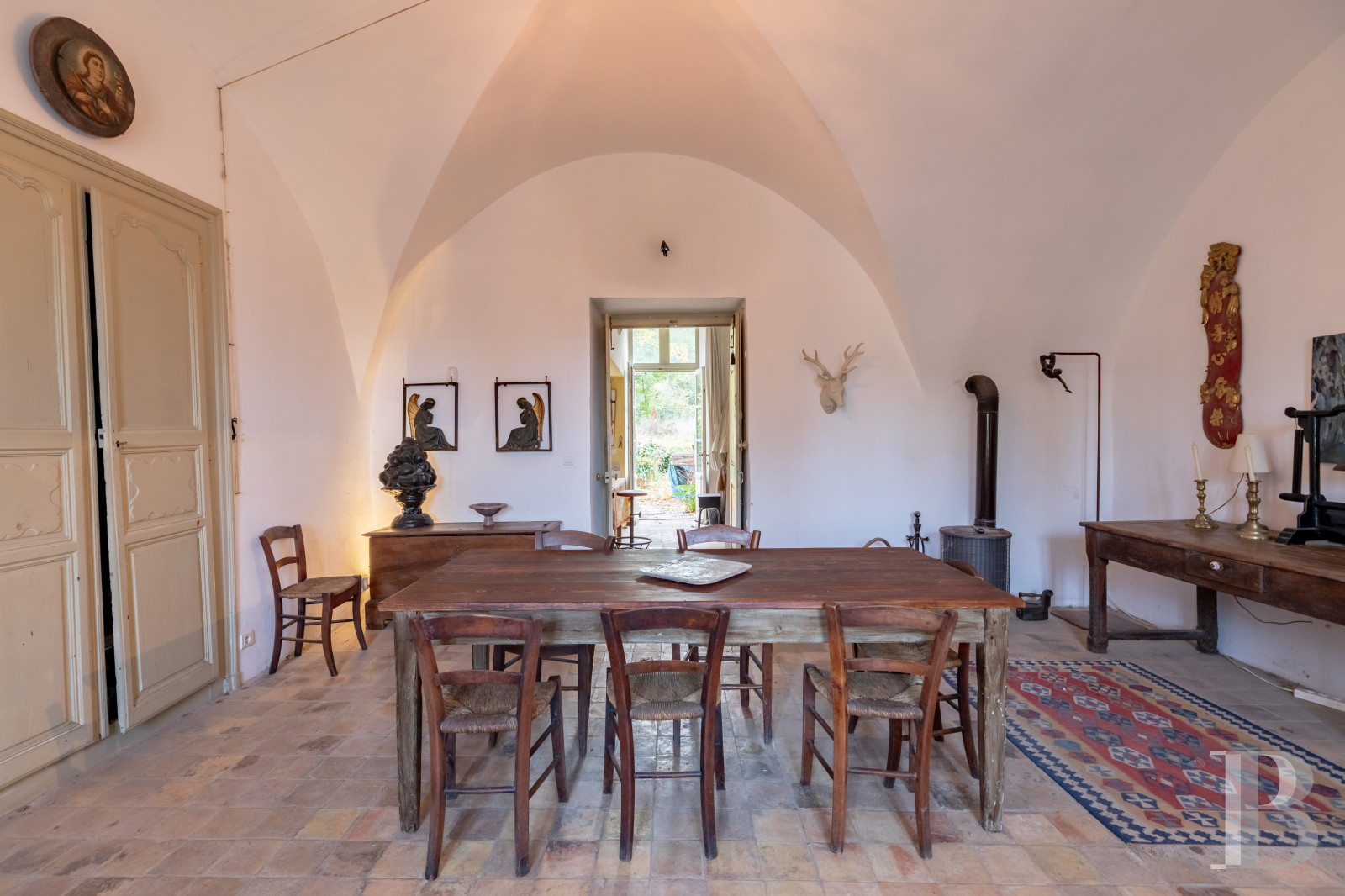 Le rez-de-chausséePassé la porte d'entrée, un hall spacieux voûté en berceau dessert les différentes pièces de réception du niveau, qui forment une enfilade. Se trouve en premier lieu une ancienne cuisine au sol et aux murs en pierres de taille. Une grande salle à manger suit, voûtée comme la cuisine et recouverte au sol de carreaux anciens en terre cuite. Plus loin, un vaste salon avec cheminée en pierre et exposition plein sud donne sur une ancienne chapelle transformée en bureau, une bibliothèque au sol en tomettes, une petite chambre au même revêtement avec cheminée en marbre surmontée d'un trumeau à colonnes et entablement moulurés, enfin une salle de bains attenante, située dans une tour orientée au sud-ouest. Communiquant avec la bibliothèque et la salle à manger, un atelier d'artiste ouvre par des portes-fenêtres sur la terrasse sud et le parc qui lui fait suite.