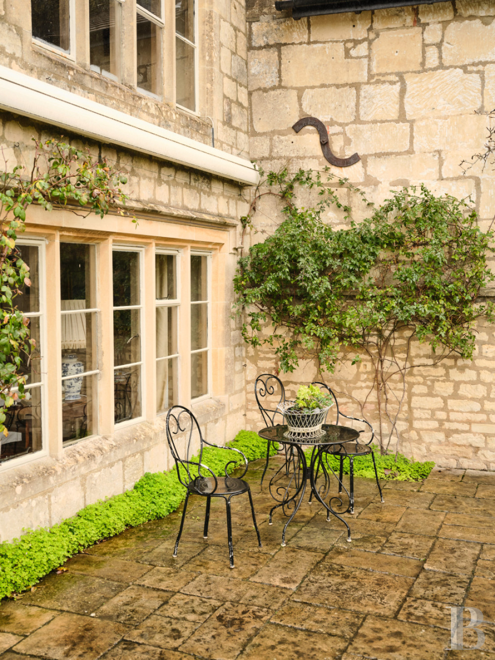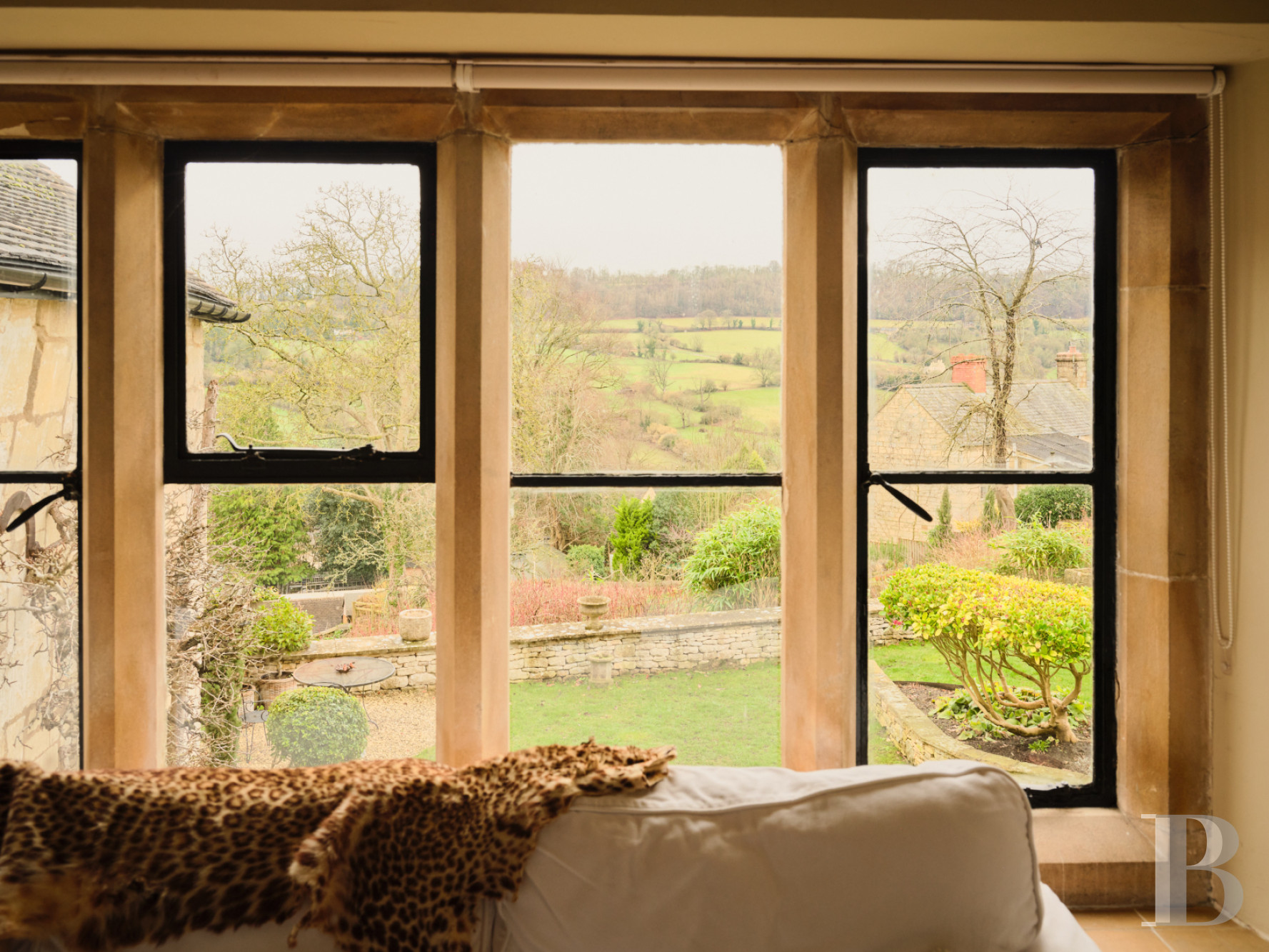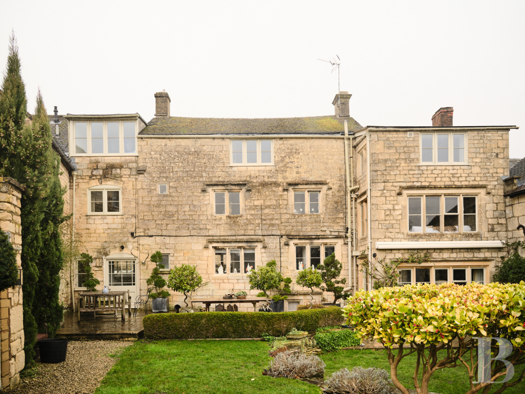 Vicarage Street trace son chemin à travers Painswick depuis que cette ville des Cotswolds exportait laine et tissus vers Londres et Bristol. La restauration de la bâtisse a maintenu le dialogue entre matériaux historiques et équipements contemporains. Le jardin clos orienté plein sud s'ouvre sur des perspectives embrassant la vallée en contrebas, composition paysagère structurée autour d'une terrasse généreuse, pelouses soignées et bordures plantées encadrées de haies de buis. Un refuge végétal protégé par des murs de pierre où déjeuners estivaux et moments de lecture trouvent leur cadre naturel. Painswick occupe une position stratégique au sommet des cinq vallées convergeant vers ce bourg que l'industrie lainière enrichit avant que tourisme et résidentialisation ne prennent le relais au 20e s. Un territoire où la pierre calcaire dorée structure encore villages, murets et granges, préservant l’identité architecturale malgré les pressions immobilières croissantes sur cette région classée Area of Outstanding Natural Beauty.