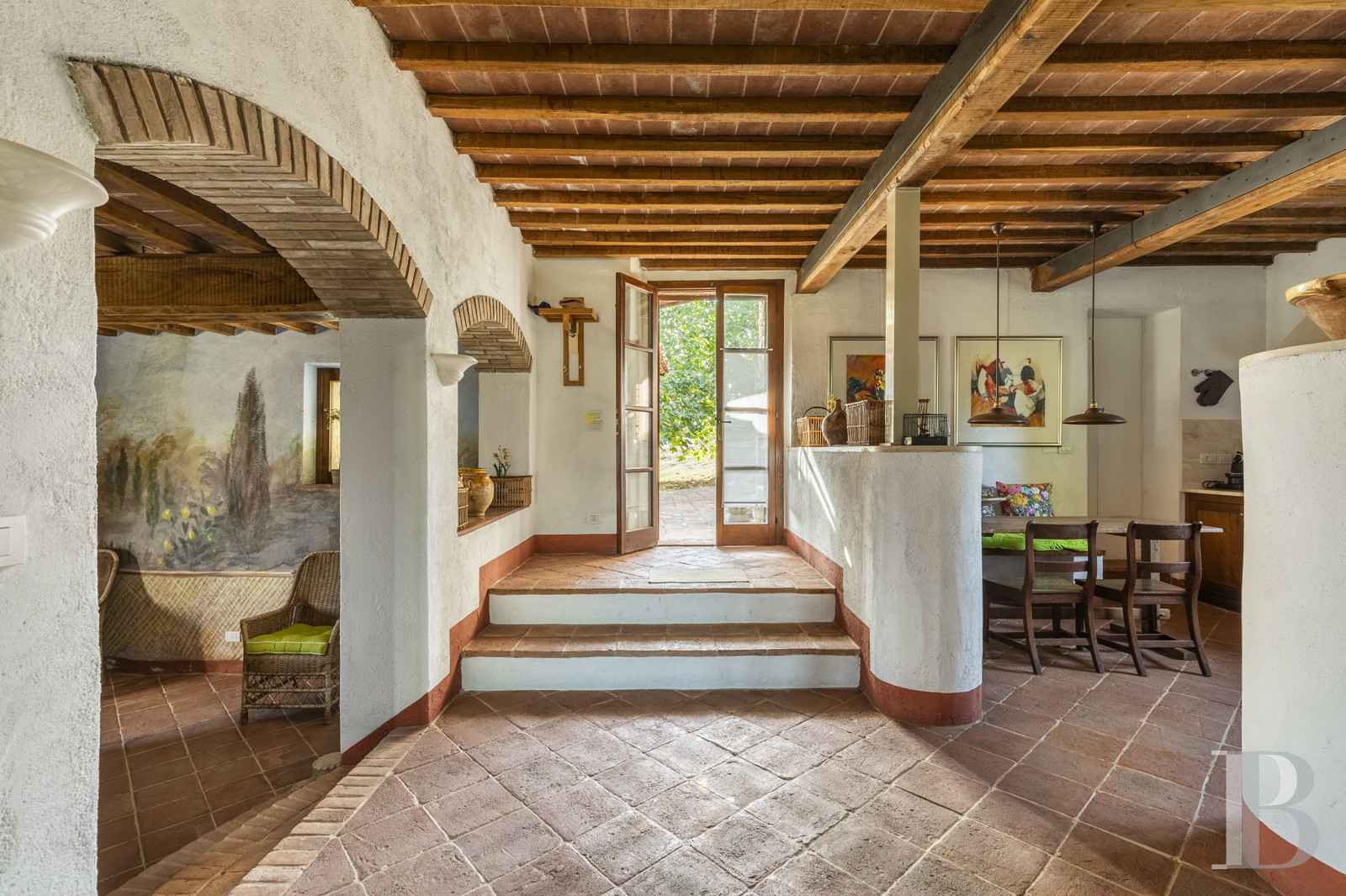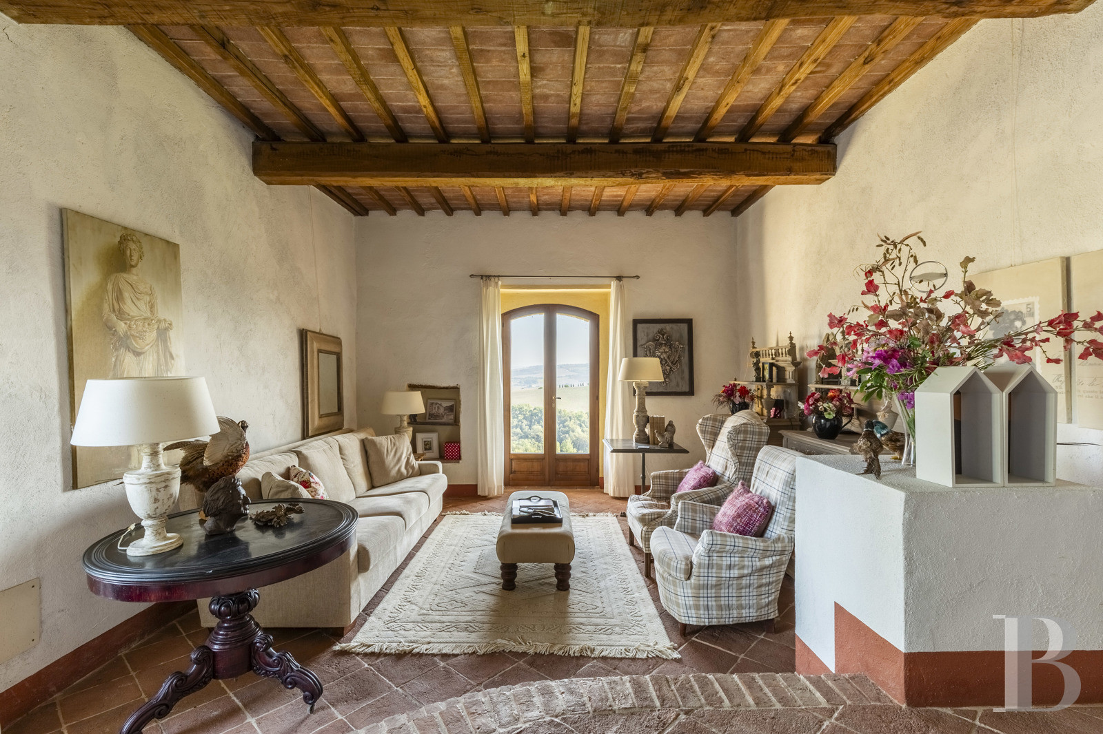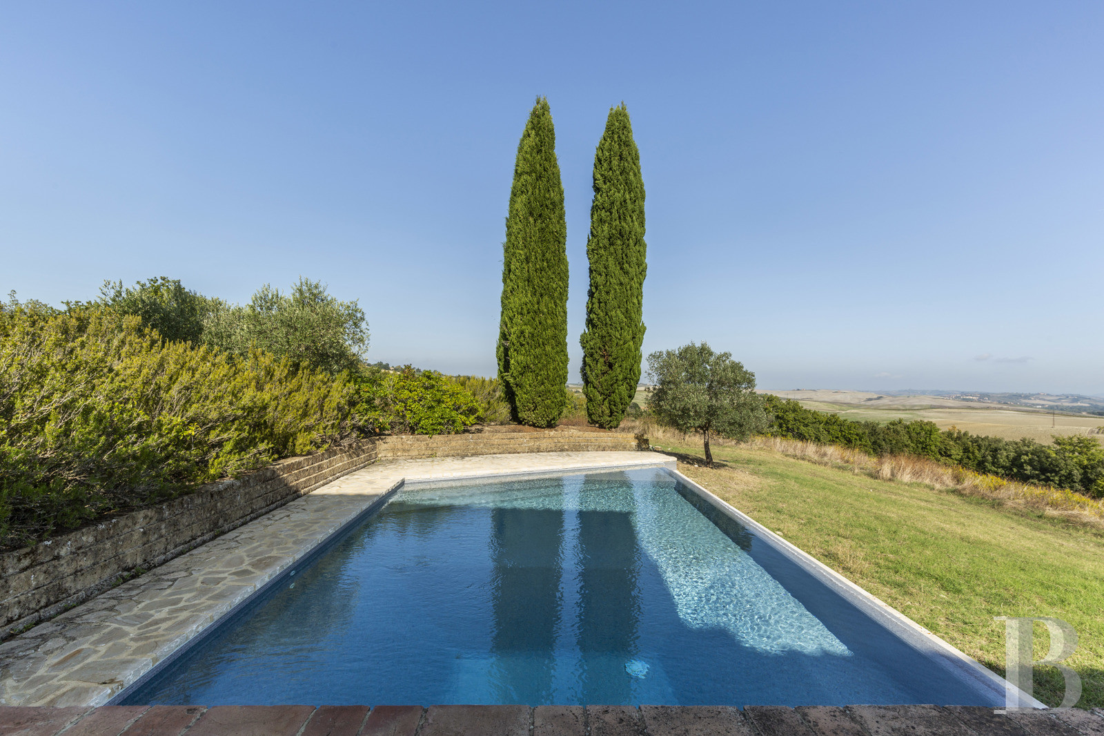 Ici, la pierre ne se contente pas de construire un abri : elle compose avec le paysage. Les larges baies de la demeure encadrent la Val d’Orcia comme autant de perspectives où la lumière change selon les heures du jour. Les cyprès qui jalonnent la propriété dessinent des repères verticaux dans l’ondulation des collines. À l’intérieur, les arches en brique articulent les espaces sans les cloisonner. Les volumes s’adaptent à différents usages : résidence permanente ou accueil temporaire. La piscine à débordement prolonge le regard vers Montalcino et ses vignobles. La demeure conserve cette qualité rare : permettre un quotidien en lien direct avec la campagne toscane, entre oliviers centenaires et routes sinueuses menant aux caves du Brunello.