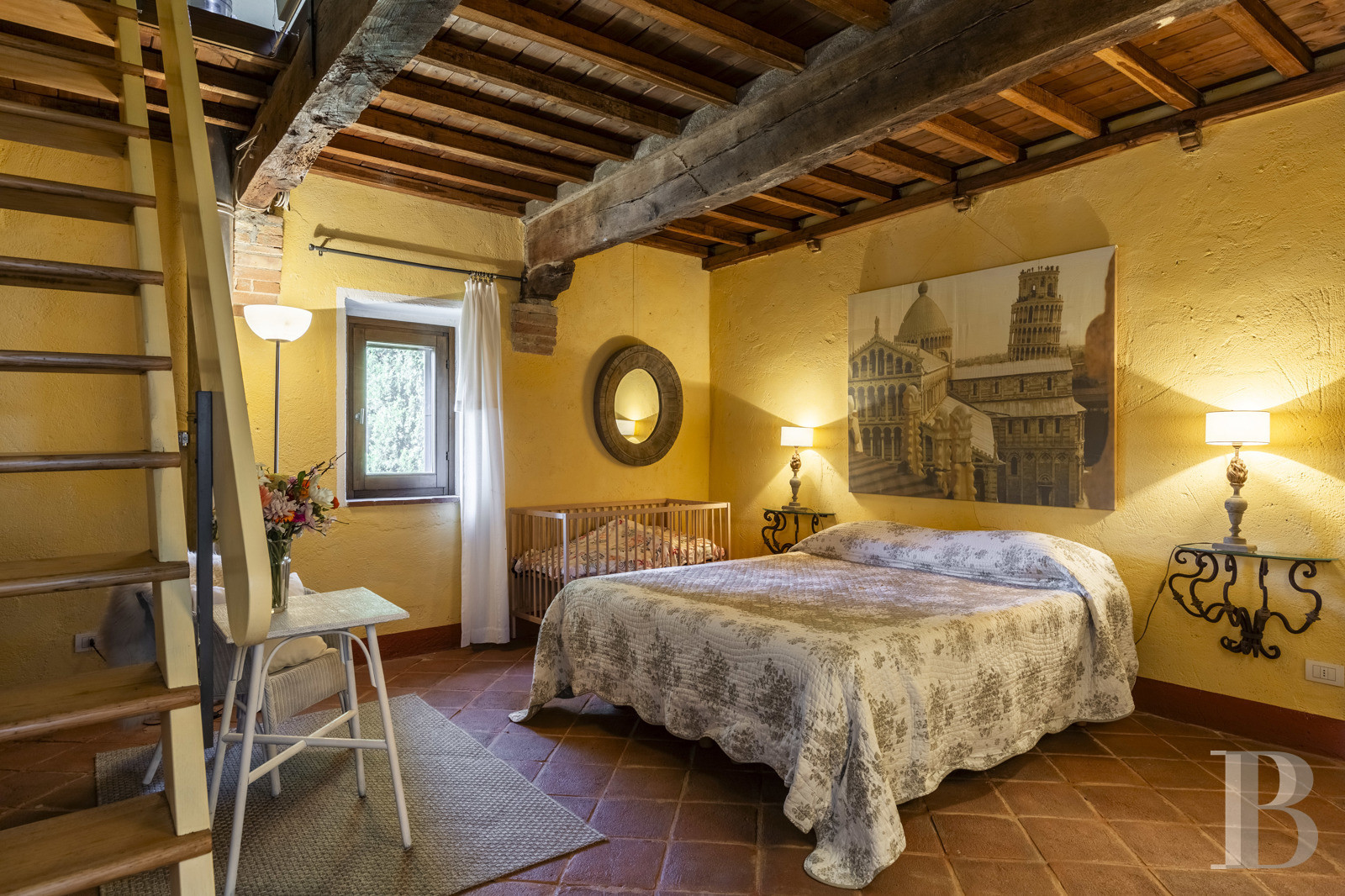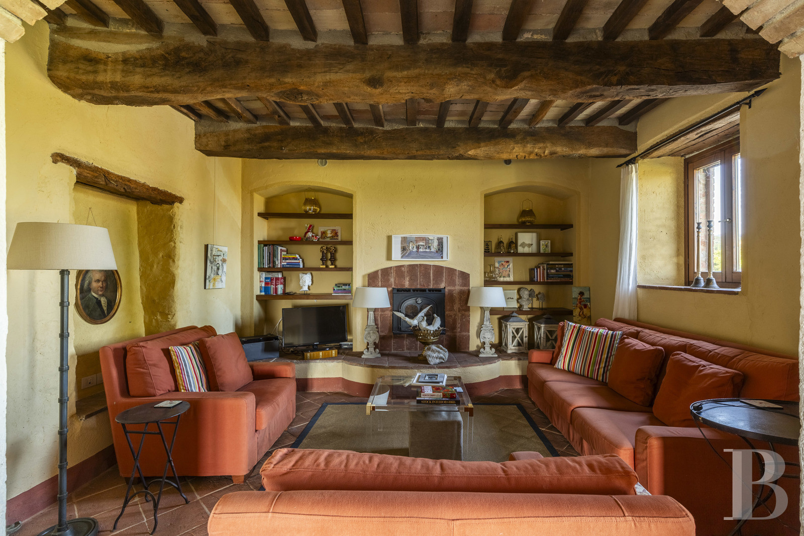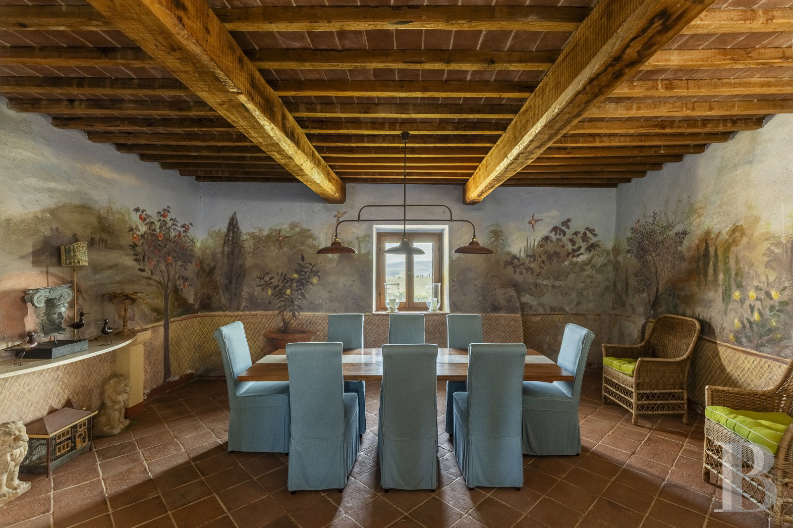 Ici, la pierre ne se contente pas de construire un abri : elle compose avec le paysage. Les larges baies de la demeure encadrent la Val d’Orcia comme autant de perspectives où la lumière change selon les heures du jour. Les cyprès qui jalonnent la propriété dessinent des repères verticaux dans l’ondulation des collines. À l’intérieur, les arches en brique articulent les espaces sans les cloisonner. Les volumes s’adaptent à différents usages : résidence permanente ou accueil temporaire. La piscine à débordement prolonge le regard vers Montalcino et ses vignobles. La demeure conserve cette qualité rare : permettre un quotidien en lien direct avec la campagne toscane, entre oliviers centenaires et routes sinueuses menant aux caves du Brunello.