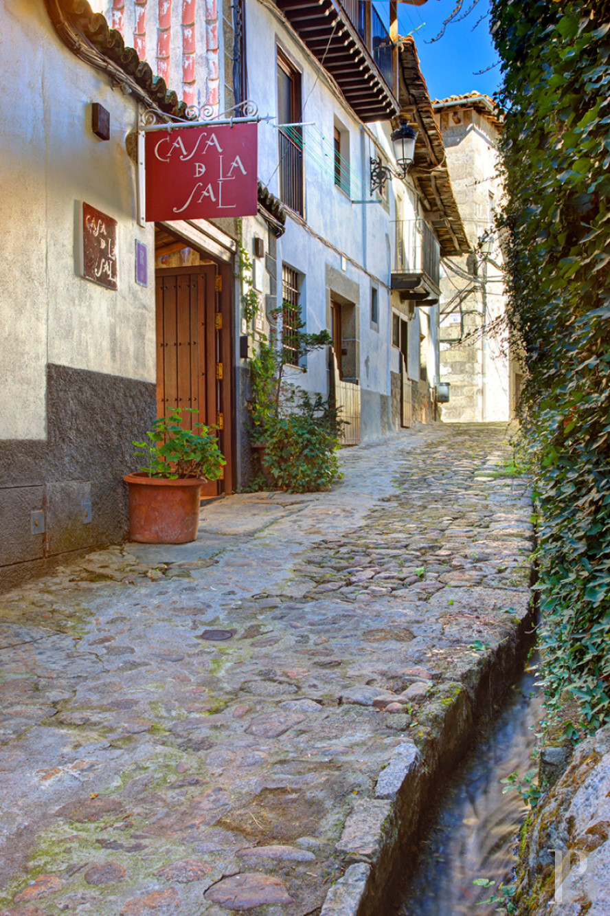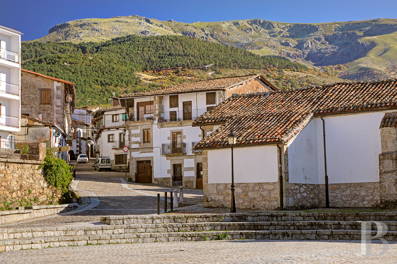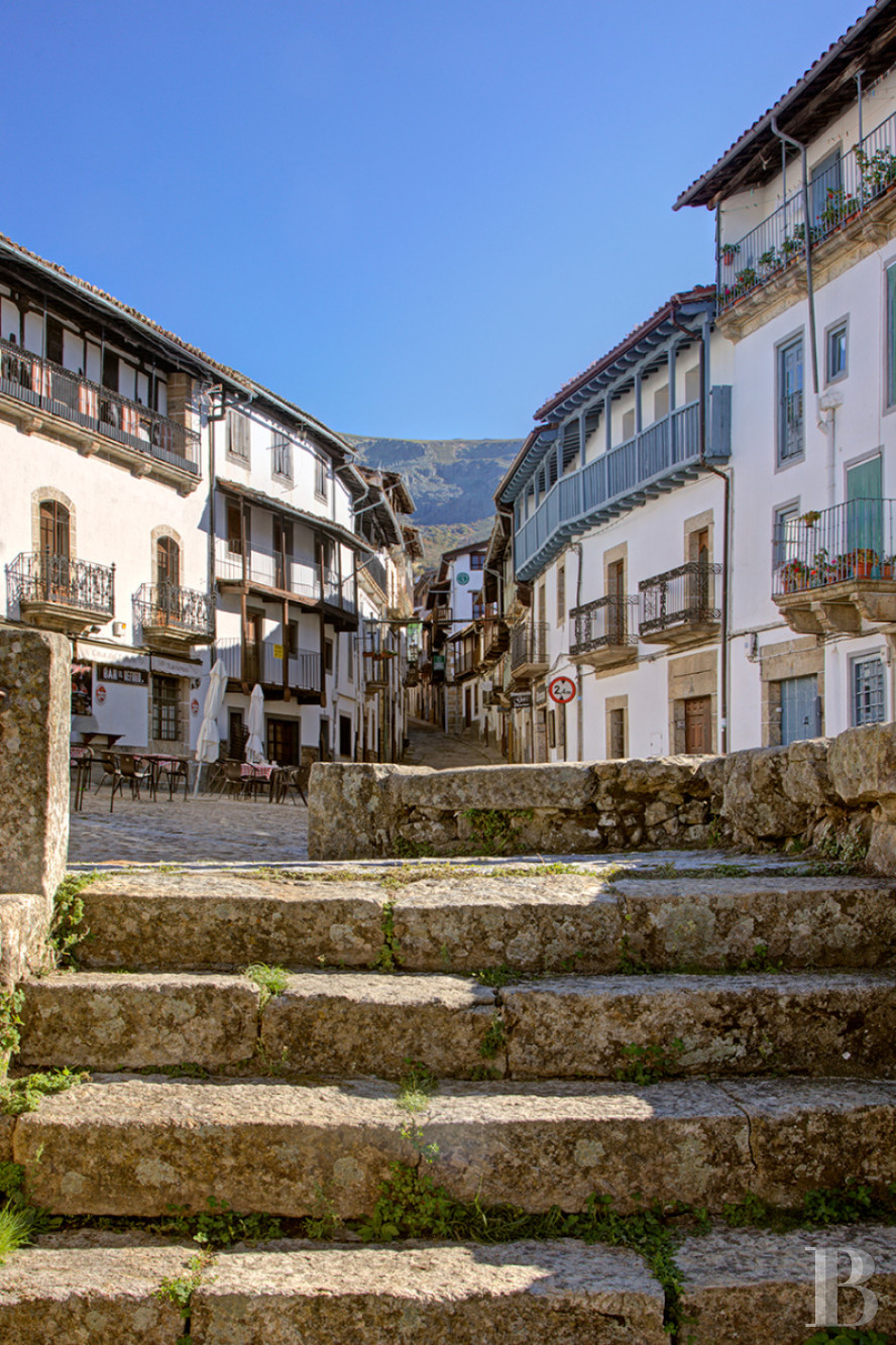 Candelario appartient à ces villages de montagne où le temps n'efface rien, où chaque pierre raconte une nécessité. Perché dans la Sierra de Béjar, classé parmi les plus beaux d'Espagne, il doit son caractère à une tradition : celle des artisans charcutiers qui, dès le 18e siècle, ont façonné son architecture. La maison qui nous occupe en témoigne. Édifiée pour abriter à la fois une famille et un savoir-faire, elle conjugue murs épais, galeries de bois et larges portes à double battant, autant d'éléments pensés pour résister au froid et permettre le séchage des viandes. Les volumes intérieurs portent encore l'empreinte de cette double vocation. Dehors, les canaux d'eau vive bordent les ruelles pavées. Les façades blanchies se détachent sur un relief boisé qui culmine à plus de 2 000 mètres. L'ensemble forme un décor dont l'authenticité tient moins à la beauté qu'à la cohérence. Acquérir ici, c'est choisir un lieu où l'histoire n'est pas un argument mais une réalité tangible.