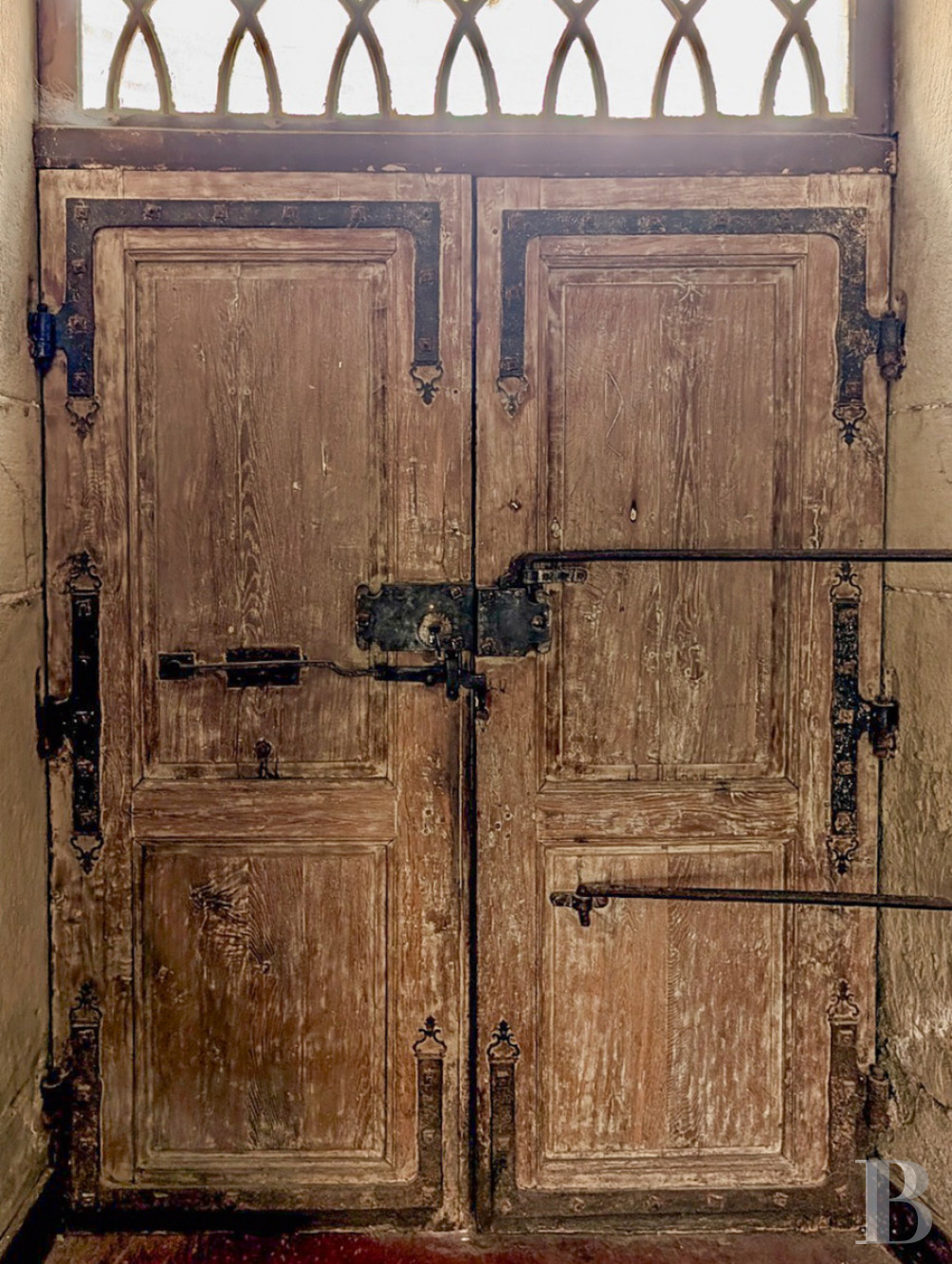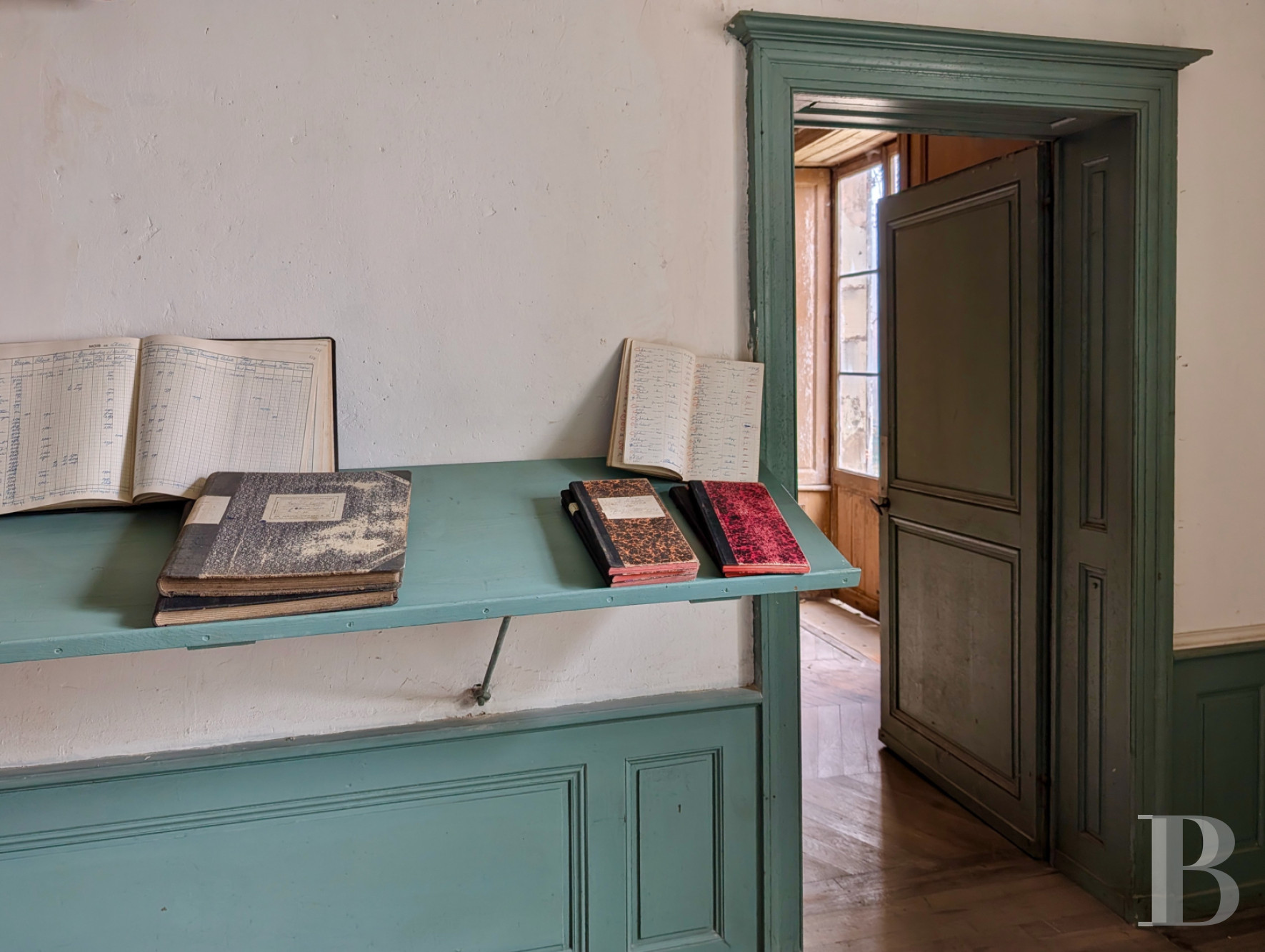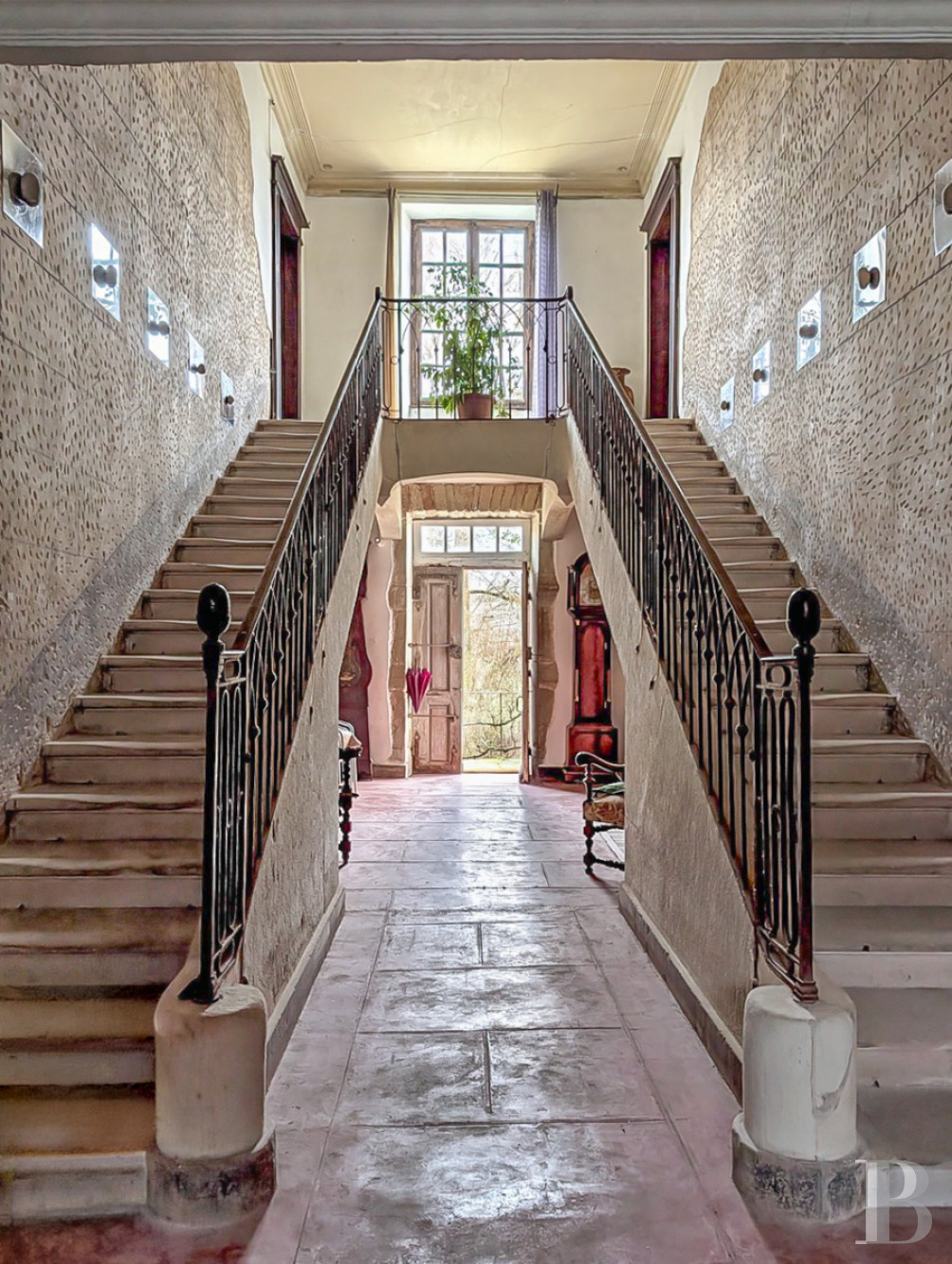 Accessible depuis le perron, la porte à double battants a conservé toutes ses ferrures d’origine, elle ouvre sur un large vestibule traversant la bâtisse jusqu’au jardin, mettant en scène au passage, deux escaliers en pierre à balustres en fer forgé symétriques qui s'élancent vers le premier étage.A gauche, une première porte accède à la cuisine au dallage d’origine. Elle possède une pierre à eau, des placards de boiseries qui habillent tout un pan de mur ainsi qu'une imposante cheminée en pierre. L'arrière cuisine parquetée, avec un escalier de service en bois qui mène à l’étage, précède la salle à manger tournée vers le jardin. Ses parquets en point de Hongrie avec des boiseries murales qui intègrent une cheminée et une horloge distillent l’ambiance surannée des maisons de famille. Côté jardin, une deuxième pièce parquetée, particulièrement lumineuse, est dotée d’une cheminée en pierre et donne en retour sur une salle de bain avec des toilettes installées sous l’escalier de service.A droite du vestibule, une première porte ouvre sur l’office parqueté. Il comporte une pierre à eau surmontée de faïences murales bleues et blanches, une imposante cheminée en pierre ainsi qu’un pan de mur en boiseries peintes formant placards. Il distribue alternativement, un escalier de service, une bibliothèque et un salon. Ce dernier, aux caractéristiques proches de la salle à manger, possède une porte-fenêtre flanquée de deux encoignures, donnant accès à la terrasse. A sa droite se trouve la bibliothèque également parquetée. Autrefois bureau dédié à l’activité professionnelle, celle-ci en a gardé la configuration. Ouverte sur la charretterie qu’elle surplombe de son balcon en fer forgé, elle possède un accès indépendant au rez-de-jardin par un escalier en bois en bel état de conservation.