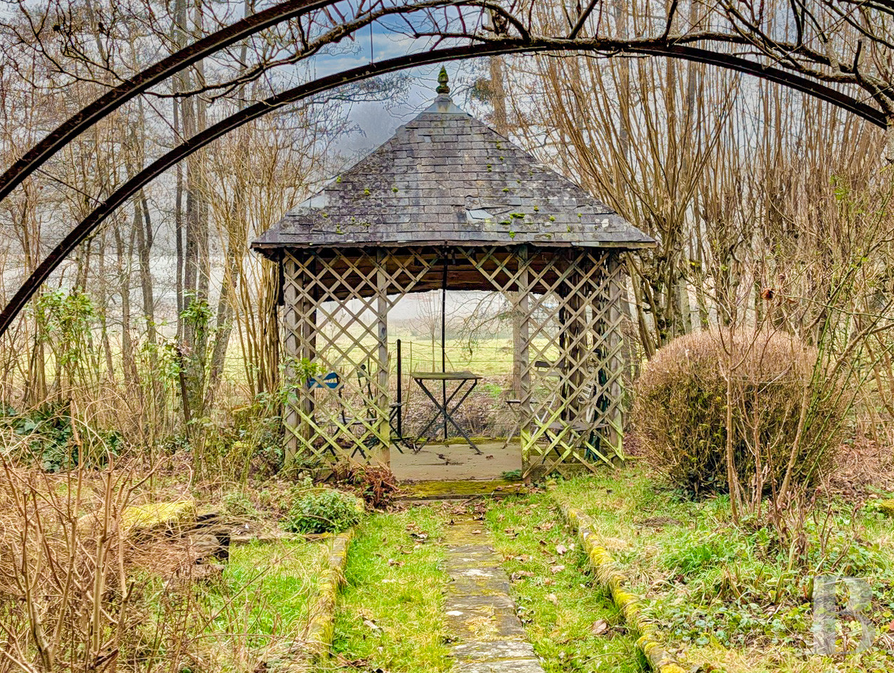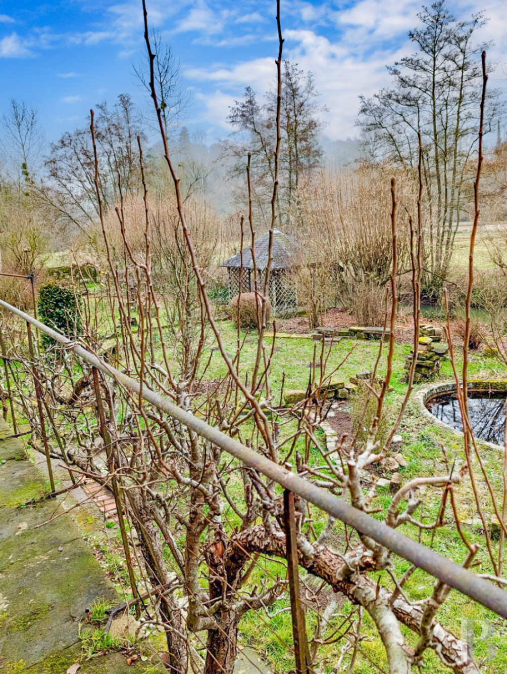 Situé au sud, l’accès au jardin , en contrebas de la terrasse, se fait par deux escaliers en pierre.Avec son bassin rond, central, en grès, où poussent les nénuphars, son kiosque romantique en bord de Saône ainsi que ses vestiges d’ornements en pierre formant chambres de verdure, il possède un charme qui invite au repos.Les rosiers grimpants, vignes et arbustes florifères y sont nombreux et variés. La vue au delà de la rive, démultipliant la sensation d’espace, dévoile un paysage naturel parsemé de quelques lointaines habitations.Ce que nous en pensons