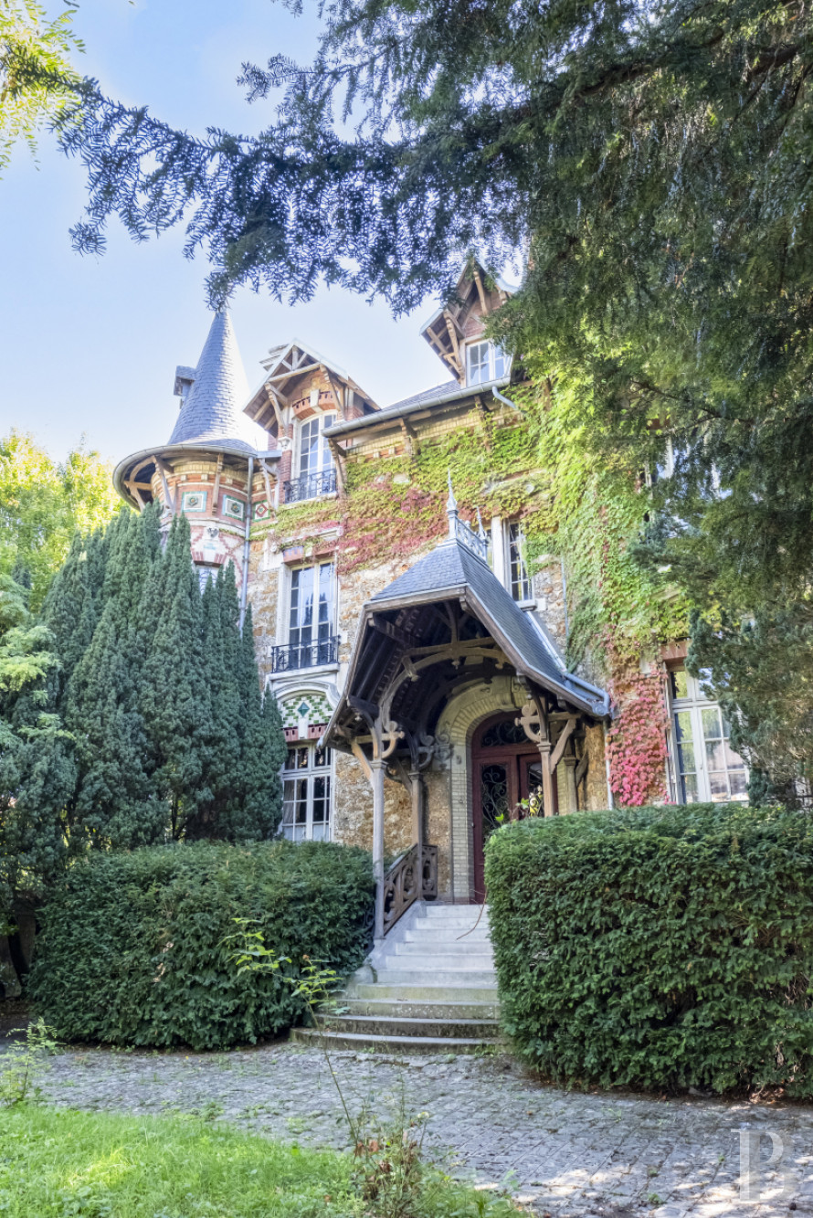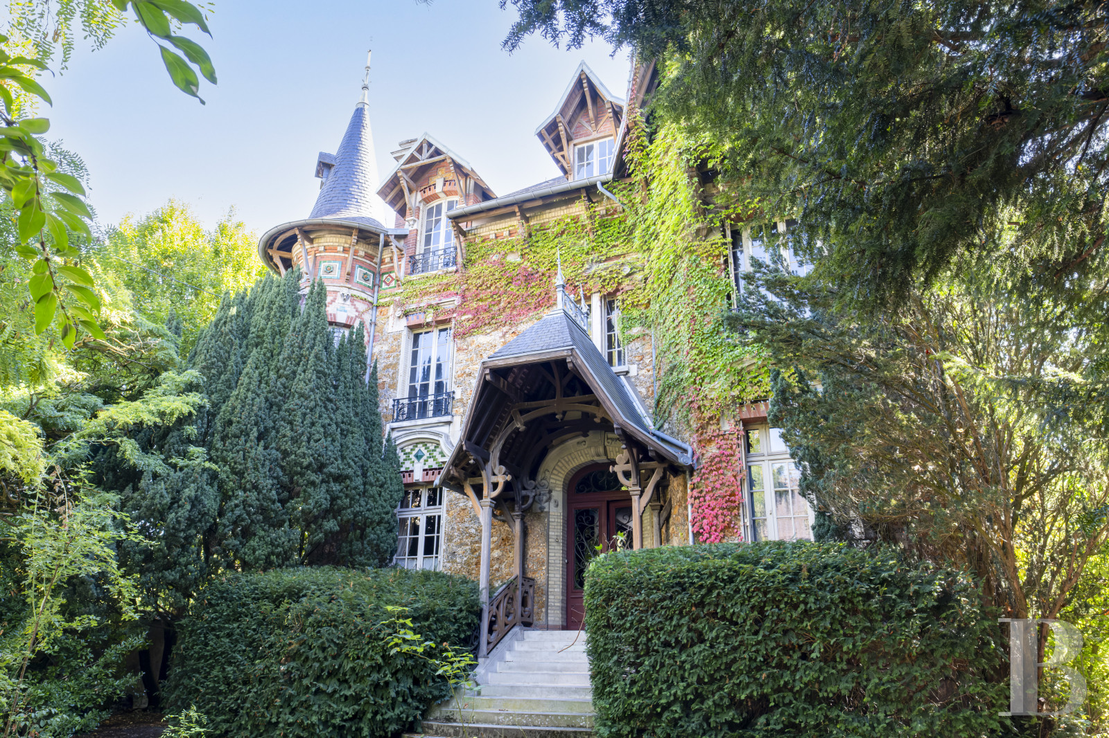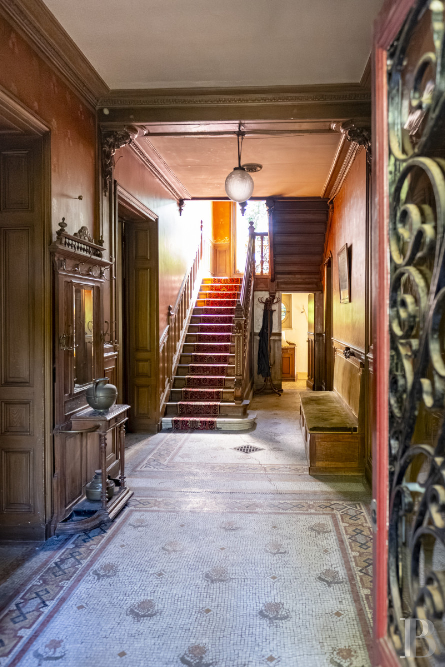 L’entrée est abritée par un porche en bois sculpté de style néogothique. Sous le pavillon, une porte en bois est surmontée d'un arc en ogive, dont le tympan est orné de vitraux délicats. Passé la porte, la perspective se prolonge sur le sol pavé d'un magnifique tapis de mosaïque. De même, les murs, lambrissés de bois pour certains, peints d'une couleur chaude pour d’autres, créent une ambiance feutrée et chaleureuse. Des moulures et des corniches sculptées ornent le sommet des murs et le plafond. À gauche se présente un ancien salon d’apparat dont les murs sont recouverts d'un papier peint à motifs damassés. Ses boiseries, ses moulures et la grande hauteur sous plafond composent une atmosphère classique. Il se poursuit par un autre salon au mobilier et à la décoration tout aussi classiques, dont une extrémité s’ouvre une véranda dont la structure vitrée et la charpente en fer forgé sont de style Art nouveau. Les grandes baies vitrées ouvrent sur le jardin. Un dégagement, doté d'un sol en mosaïque, permet d’accéder à la cuisine. À droite du couloir d’entrée s’ouvre un bureau qui a conservé l'empreinte du temps. Il donne sur un salon au caractère affirmé, dont les murs sont peints d’un ton « terracotta » et agrémentés de moulures soignées au plafond et baigné d’une abondante luminosité grâce à ses grandes baies.