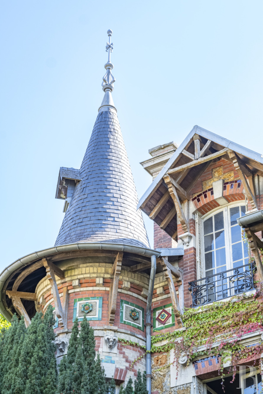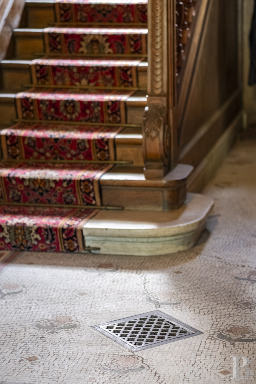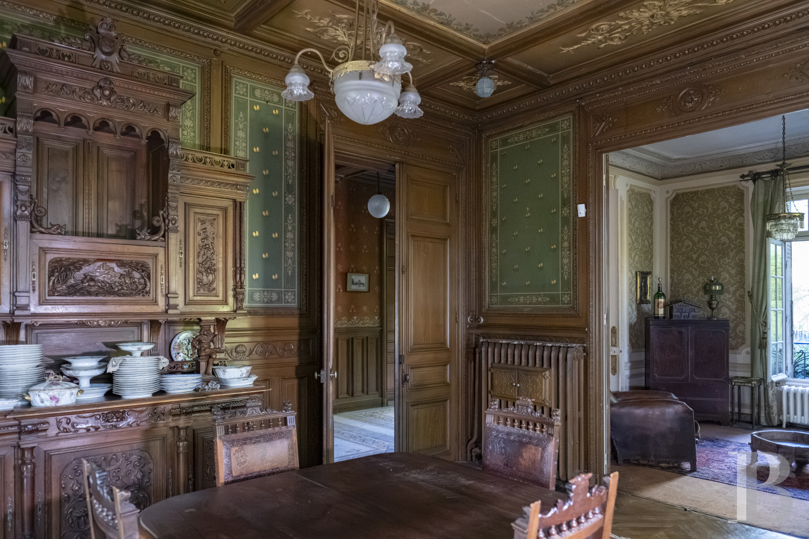 L’entrée est abritée par un porche en bois sculpté de style néogothique. Sous le pavillon, une porte en bois est surmontée d'un arc en ogive, dont le tympan est orné de vitraux délicats. Passé la porte, la perspective se prolonge sur le sol pavé d'un magnifique tapis de mosaïque. De même, les murs, lambrissés de bois pour certains, peints d'une couleur chaude pour d’autres, créent une ambiance feutrée et chaleureuse. Des moulures et des corniches sculptées ornent le sommet des murs et le plafond. À gauche se présente un ancien salon d’apparat dont les murs sont recouverts d'un papier peint à motifs damassés. Ses boiseries, ses moulures et la grande hauteur sous plafond composent une atmosphère classique. Il se poursuit par un autre salon au mobilier et à la décoration tout aussi classiques, dont une extrémité s’ouvre une véranda dont la structure vitrée et la charpente en fer forgé sont de style Art nouveau. Les grandes baies vitrées ouvrent sur le jardin. Un dégagement, doté d'un sol en mosaïque, permet d’accéder à la cuisine. À droite du couloir d’entrée s’ouvre un bureau qui a conservé l'empreinte du temps. Il donne sur un salon au caractère affirmé, dont les murs sont peints d’un ton « terracotta » et agrémentés de moulures soignées au plafond et baigné d’une abondante luminosité grâce à ses grandes baies.