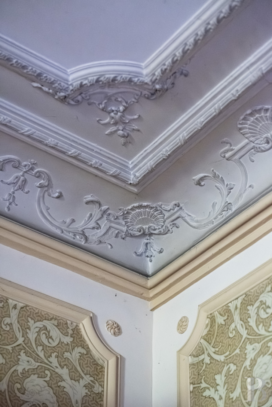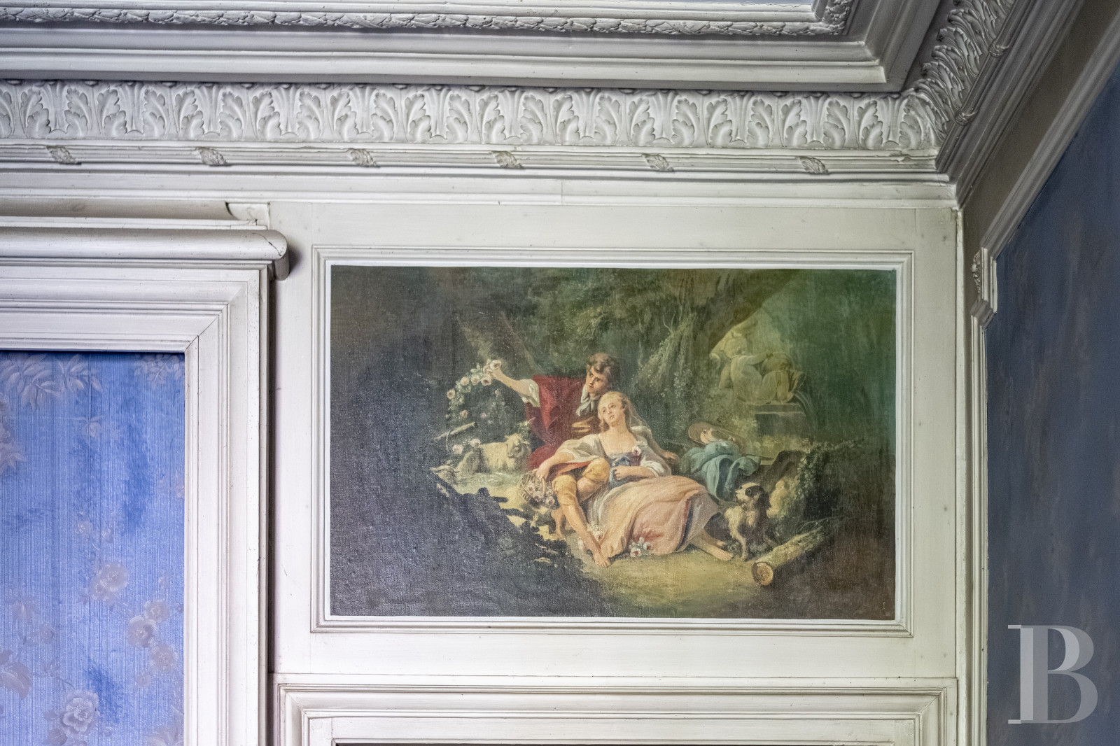 Après avoir gravi un escalier en bois mouluré, un couloir dessert l’ensemble des espaces. Un discret dégagement fait office de garde-robe, puis se succèdent plusieurs pièces d’eau, notamment une salle de bains restée intacte ou encore des toilettes. Enfin, se présente une première chambre, lumineuse, dont les murs sont ornés de boiseries et de moulures finement sculptées, qui encadrent des panneaux de papier peint aux motifs discrets. Le plafond, d'une grande hauteur, est également orné de moulures élaborées et de rosaces. Une cheminée en marbre blanc, aux lignes classiques, agrémente la pièce. Au-dessus de celle-ci, tout comme des linteaux des portes, se trouvent plusieurs trumeaux ornés de motifs champêtres dans le style du 18e s., peints sur panneaux ou marouflés, qui apportent une touche bucolique à la pièce. Au surplus, se succèdent à l’extrémité du couloir, un nouveau dégagement, puis, en miroir des autres pièces, deux nouvelles chambres, sensiblement composées à l'identique de la première.