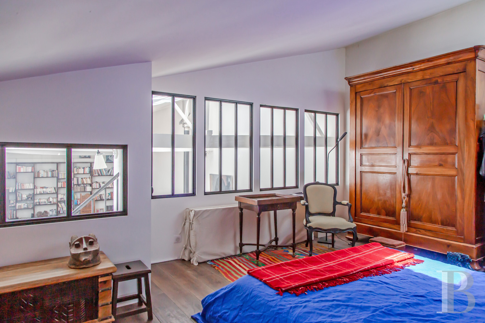 Au fond du séjour, un escalier de métal, qui a été conçu sur mesure, mène à une confortable chambre située en mezzanine – d'environ 20 m² au sol pour 15 m² en loi Carrez. Elle est pourvue d’une verrière, d’où le regard plonge sur la salle de séjour, et donne accès à une petite terrasse de toit d’environ 13 m².