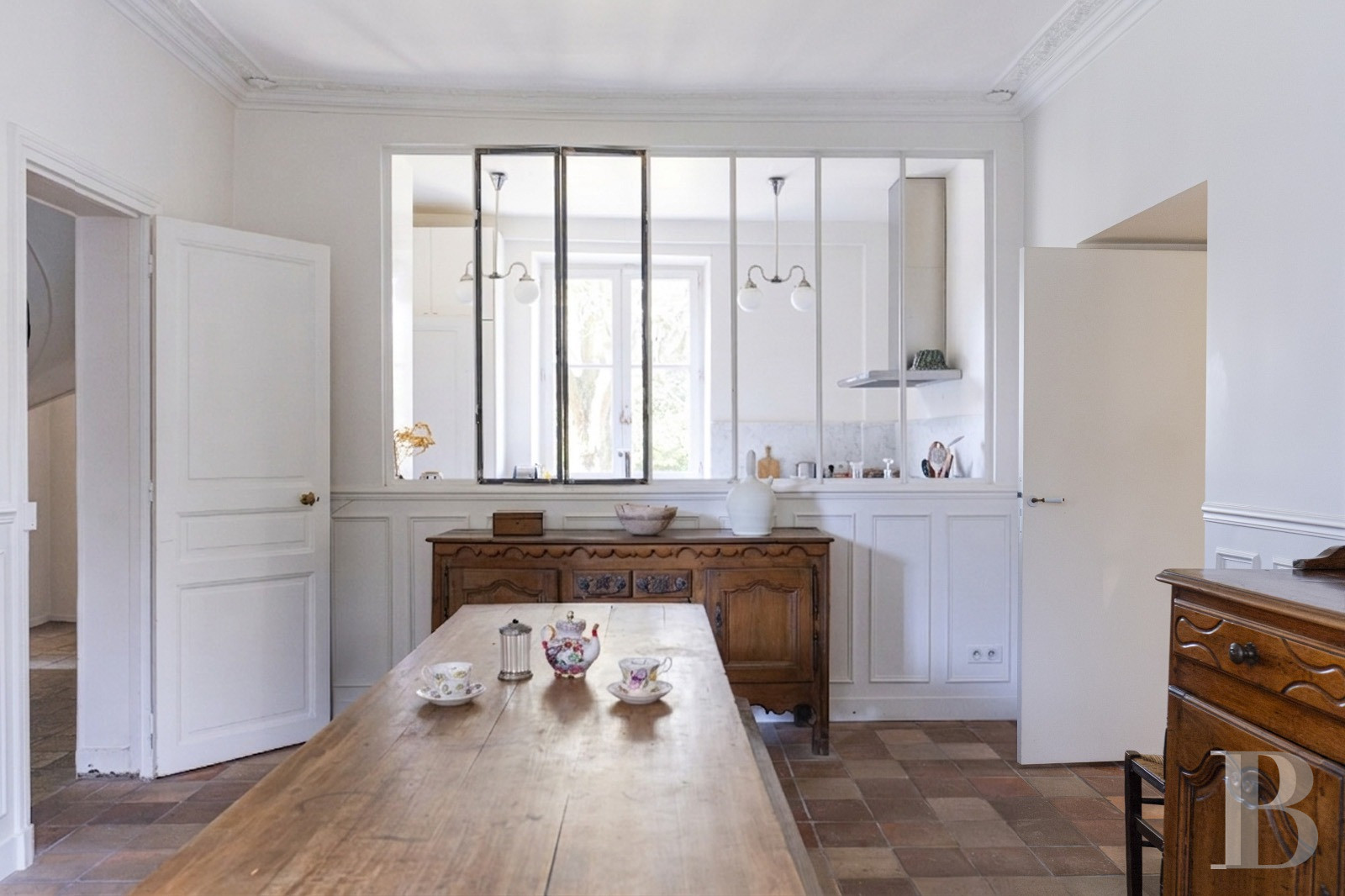 Le perron ancien qui conduit à la porte d’entrée donne, dès l’abord, le ton de la demeure. Le corridor, au sol couvert de carreaux en pierre de Bourgogne, mène à gauche à une salle de séjour et, à droite, à une salle à manger suivie d'une cuisine. Le salon, avec ses deux espaces de réception et ses quatre fenêtres, bénéficie d’une abondante luminosité tout au long de la journée grâce à ses trois orientations. Le sol de ce dernier est revêtu de pierre de Bourgogne chinée par les occupants actuels pour se coordonner avec les autres pièces du niveau. Une porte-fenêtre latérale permet l'accès à l'extérieur. La salle à manger, spacieuse et couverte au sol d'un carrelage identique à celui du couloir, donne quant à elle sur l’avant de la maison. Son plafond est orné de moulures et ses murs de lambris d'appui à panneaux peints en blanc. Orientée au sud-est, elle profite du soleil le matin, mais regarde aussi le jardin situé à l’arrière, grâce à la structure de métal, préfiguration d’une verrière, qui cloisonne la cuisine sans véritablement la séparer de l'espace de repas. À l’extrémité du corridor, enfin, une porte dans l’alignement de l’entrée permet de rejoindre le jardin par quelques marches en pierre.