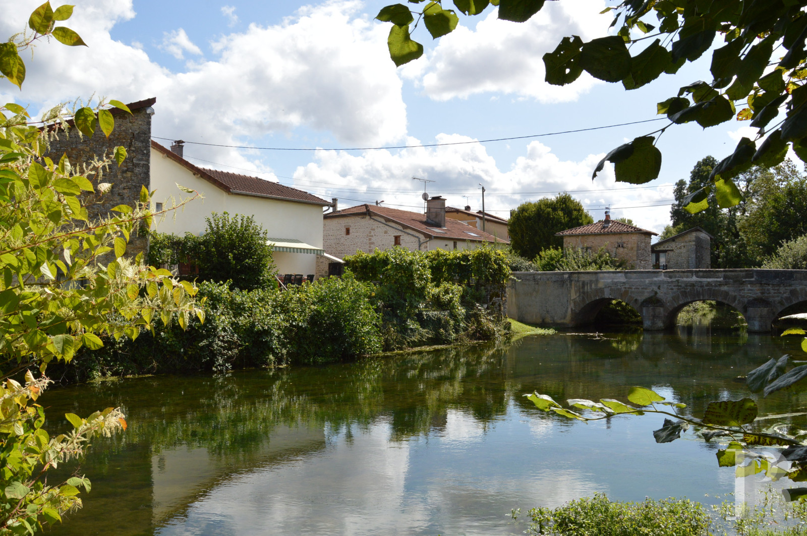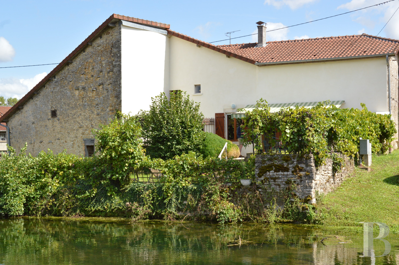 L'entrée s'effectue par une porte en chêne peint avec un heurtoir dans un espace vestiaire qui précède la cuisine. Au sol, les tomettes trop abimées pour être conservées ont été remplacées par un carrelage contemporain sous un plafond à la française. La cuisine intégrée est récente mais la cuisinière Maillard, toujours fonctionnelle, a gardé sa place dans la cheminée. Cette cuisinière-cheminée, inventée à Ligny-en-Barrois dans la Meuse voisine vers 1890 conjugue les propriétés d'une cuisinière classique à feu fermé et le plaisir d'une belle flambée. Deux portes en partie vitrées de petits carreaux mènent à un couloir avec des toilettes qui s'ouvre sur une chambre suivie d'une salle de bain avec une baignoire et une douche pour la première. La seconde communique avec une salle à manger qui s'ouvre sur la terrasse équipée d'un barbecue avec une agréable vue sur le pont en pierre et la rivière. Elle possède un escalier qui mène au premier étage. Il s'agit de l'ancienne cuisine qui a conservé sa pierre à eau et une cheminée en pierre équipée d'un poêle à bois. A sa suite, un grand salon où trône un imposant poêle émaillé lorrain. Les murs sont en pierres apparentes, percés côté jardinet par une vaste baie vitrée et par une porte-fenêtre côté terrasse. Le plafond à la française est rustique, il s'ouvre pour laisser place à un escalier qui mène au premier étage.