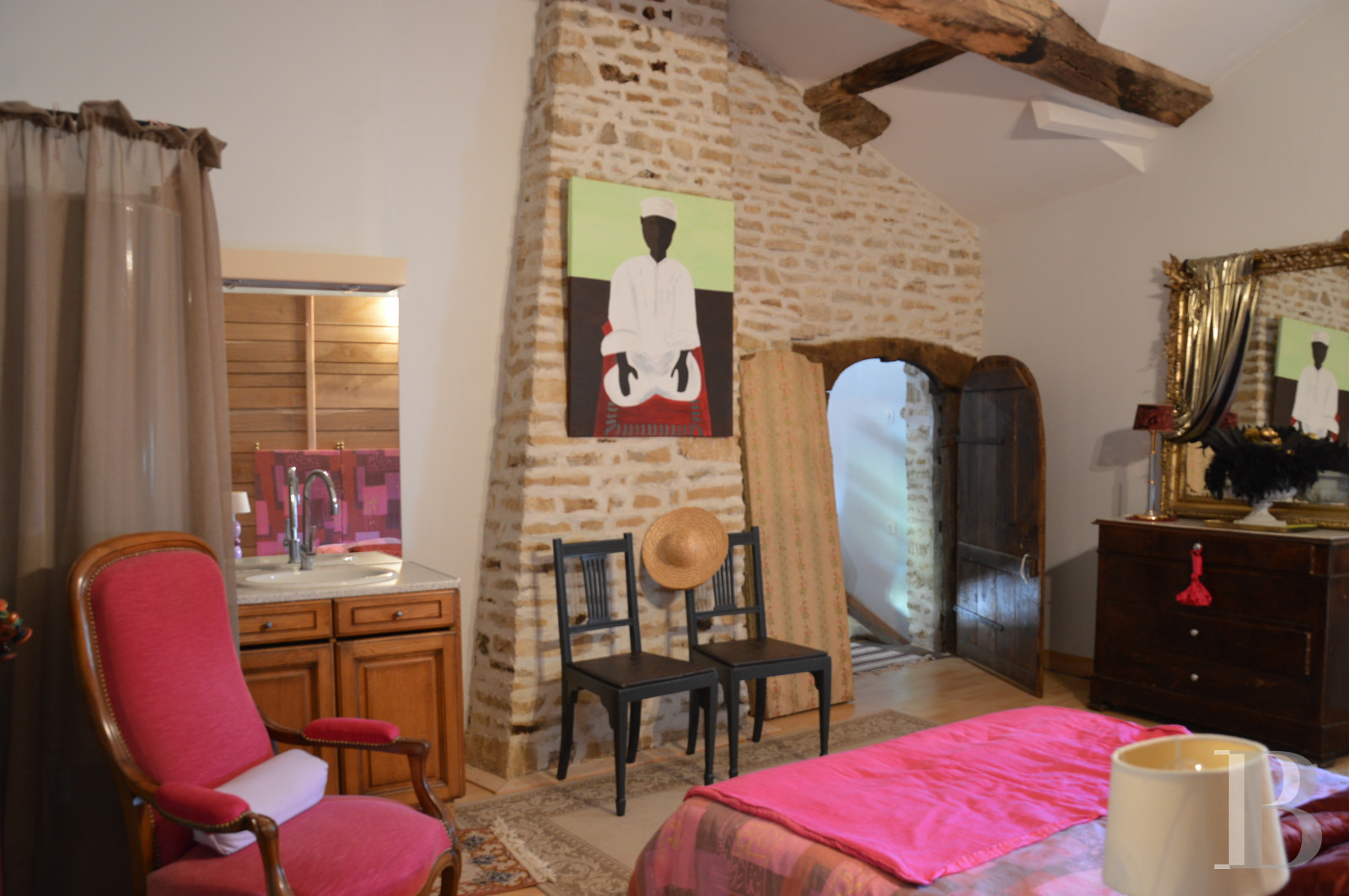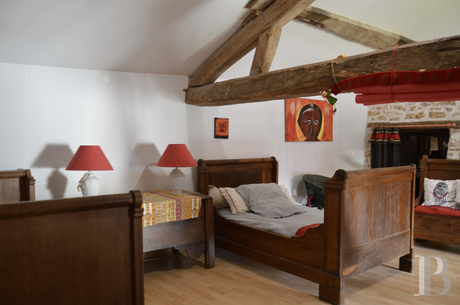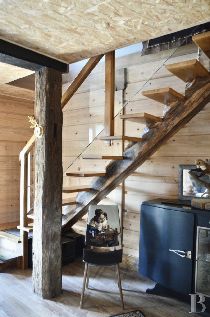 L'escalier qui prend naissance depuis le salon débouche dans une vaste pièce en mezzanine à l'imposante poutraison apparente actuellement utilisée comme dortoir pour les enfants. Quelques marches mènent à une imposante porte en plein cintre qui s'ouvre dans une chambre avec un lavabo. Elle communique avec le palier du second escalier qui rejoint la salle à manger. Il se poursuit vers deux chambres, une salle de douche et des toilettes.