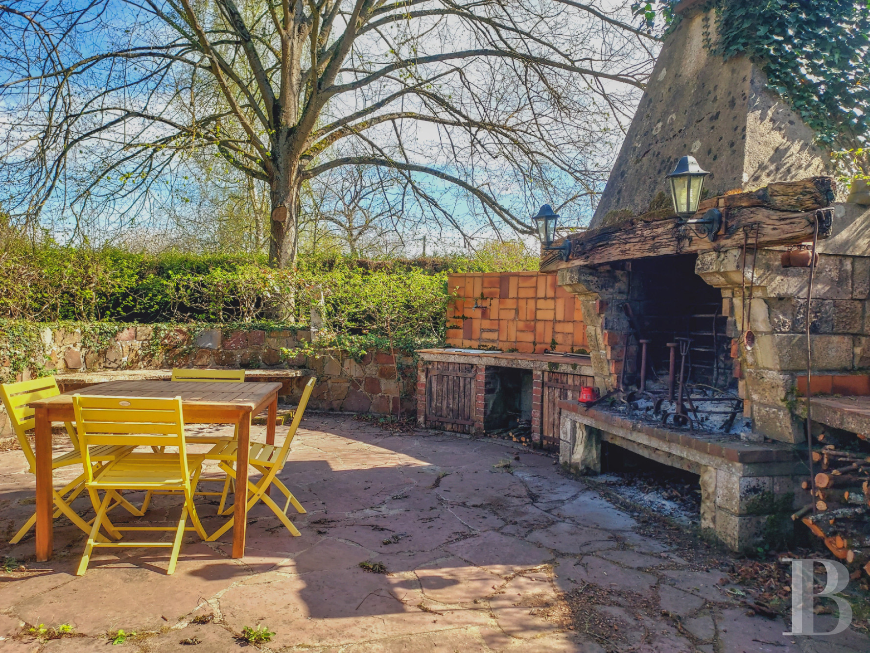 De nombreux arbres parsèment l'espace, presque entièrement enherbé. Chênes, hêtres communs ou pourpres, charmes, bouleaux, châtaigniers, pins, lauriers, aubépines et sujets d'autres essences bordent également le parc et sont plantés en bosquet sur un tiers de sa surface. Les massifs fleuris ne sont pas en reste avec de nombreux rosiers, camélias et hortensias. Non loin de la maison, une haute cheminée, vestige du pignon des ruines d'une autre habitation, a été aménagée en cuisine d'été avec plan de travail carrelé et point d'eau. Le sol y est dallé et l'ensemble est entouré d'une petite haie de forme circulaire. Enfin, plus loin, un bassin fait face à la terrasse.