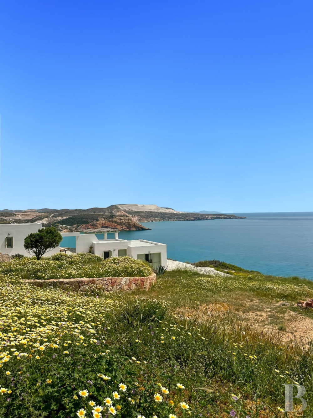 Perchée sur les hauteurs volcaniques d'Akrotiri, une demeure cycladique aux murs blanchis dialogue avec le paysage minéral de Milos, île sculptée par les éruptions anciennes et l'extraction de l'obsidienne qui attira jadis navigateurs et commerçants égéens. Les deux bâtisses se déploient dans un jardin méditerranéen où le silence n'est troublé que par le vent du large. La terrasse de la maison principale capte les lumières changeantes du sud insulaire, tandis que la configuration indépendante des volumes autorise vie familiale et accueil d'hôtes. À quelques pas, la plage d'Agios Sostis étend son sable clair face aux eaux turquoise, et les criques secrètes du littoral sud attendent l'explorateur patient. Akrotiri préserve une tranquillité rare dans les Cyclades, loin des développements touristiques qui ont transformé d'autres îles, offrant un refuge où le temps retrouve sa mesure naturelle entre mer, pierre volcanique et ciel égéen.
