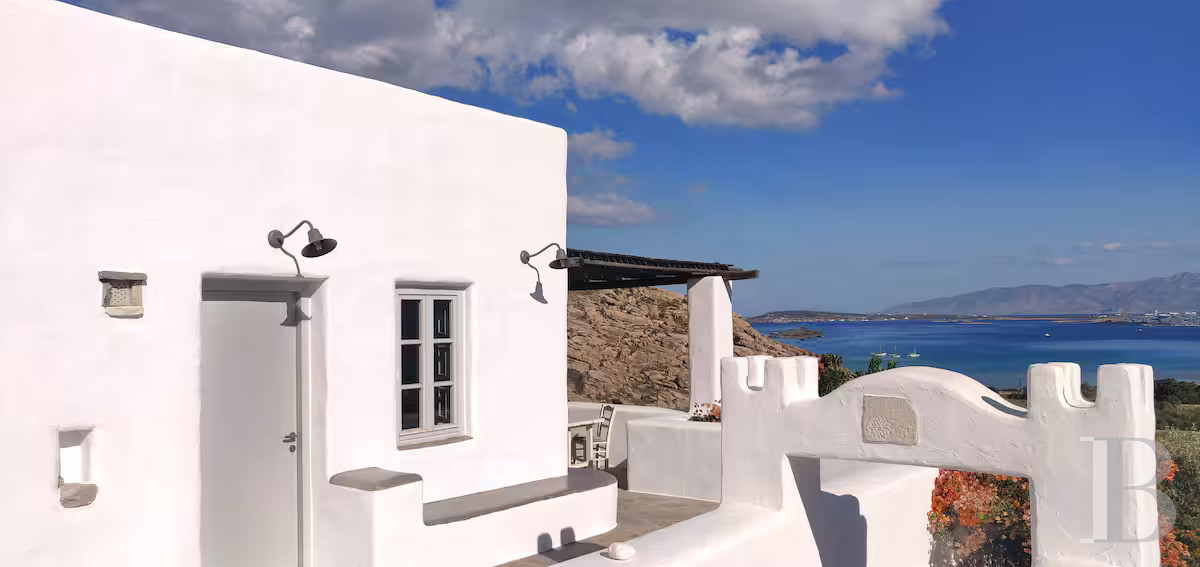 une maison cycladique de 133 m² sur 2 800 m² de terrain avec vue panoramique sur la baie de Naoussa