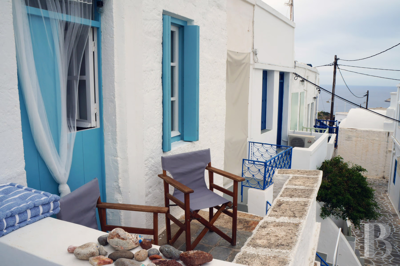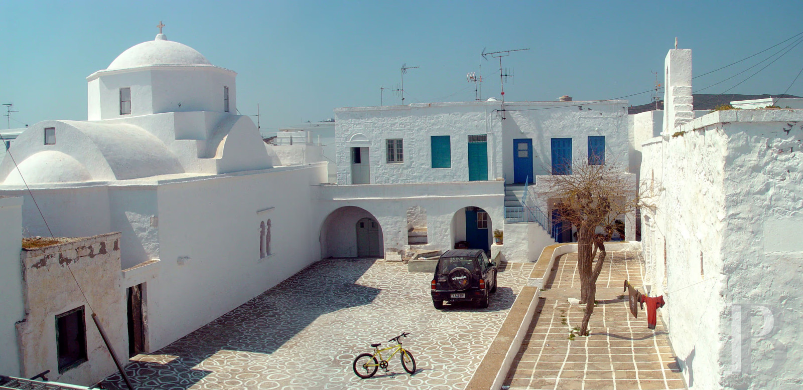 Les 100 m² de volumes blanchis à la chaux forment un sanctuaire domestique au cœur du kastro médiéval, où les ruelles étroites et les fortifications dessinent un paysage urbain figé depuis des siècles. Restaurée en 2008 sous la surveillance de l'Éphorat des Antiquités byzantines, la demeure a conservé ses éléments vernaculaires : foyers en pierre, vasques en marbre de Tinos, escalier extérieur grimpant le long de la façade. La maison convient à qui recherche un ancrage dans l'histoire cycladique, au sein d'un ensemble médiéval préservé où la vie insulaire s'organise encore selon des codes séculaires, entre mer Égée et tradition artisanale.