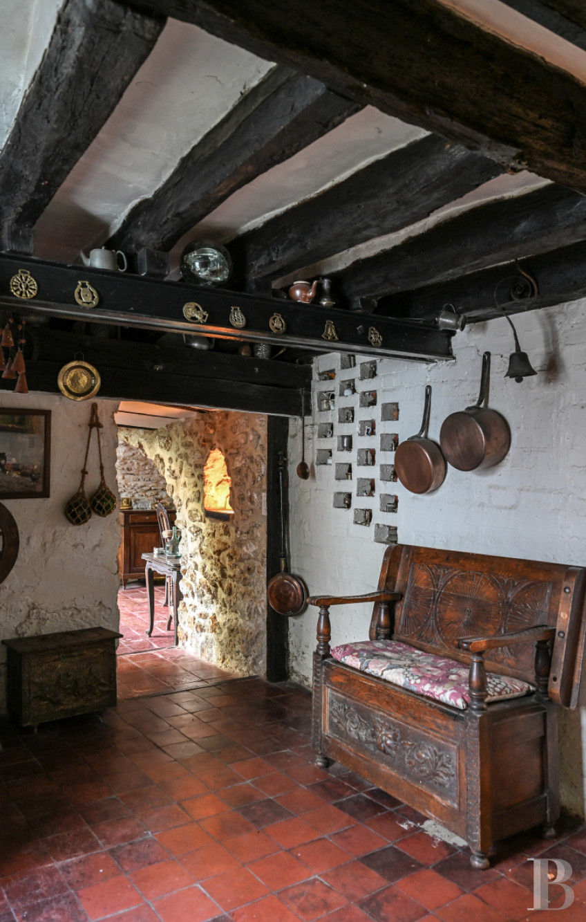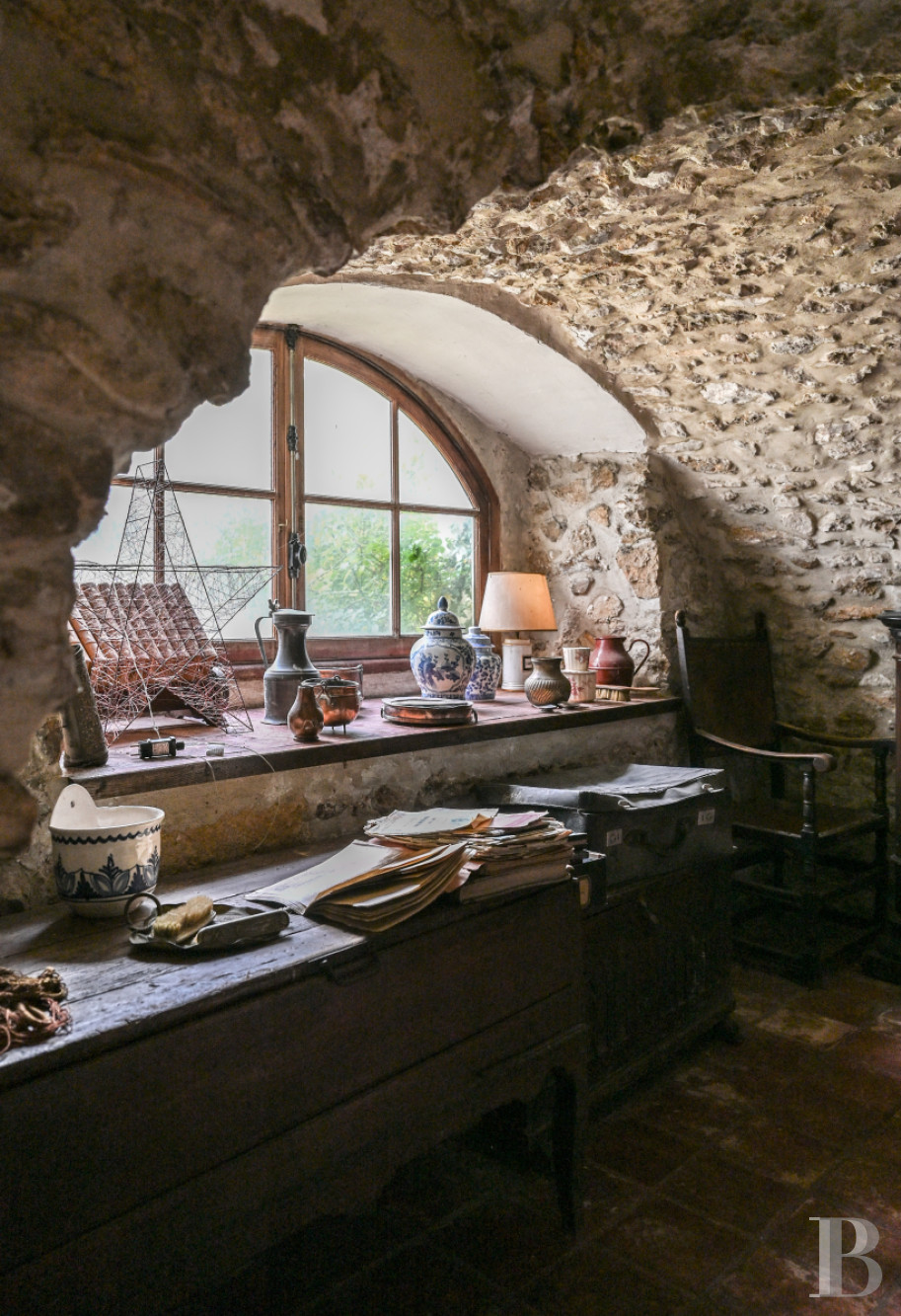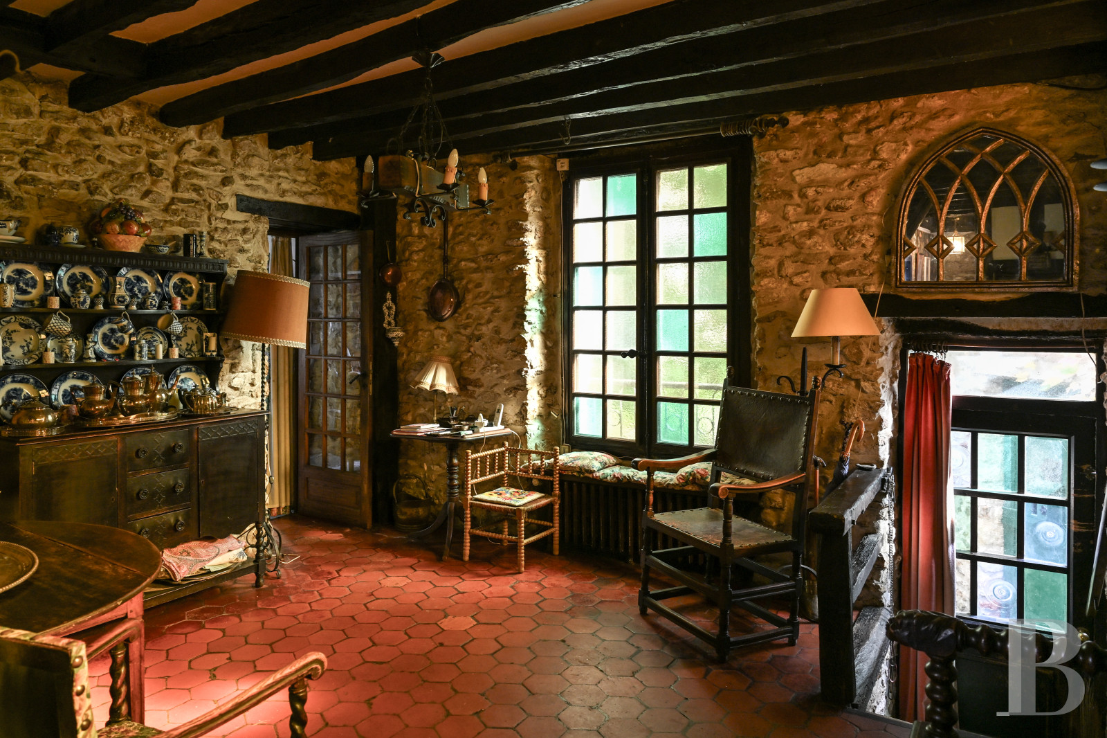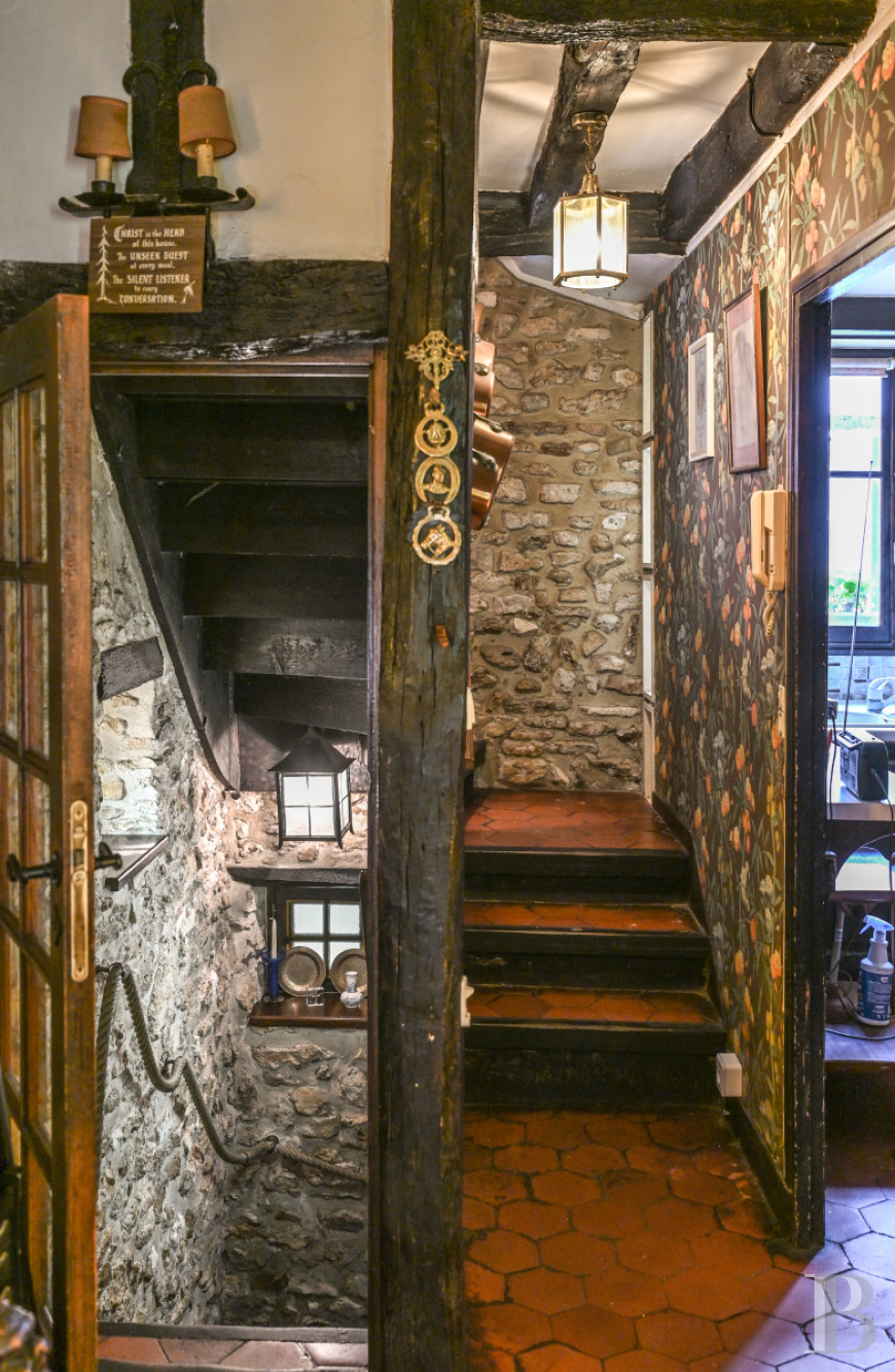 Dès l’entrée, pavée de tomettes anciennes, le ton est donné : murs en pierre apparente, poutres sombres, niches d’époque et détails patinés composent un décor rare, à la fois rustique et raffiné. L’espace conduit à un salon, vaste pièce traversante où la lumière s’invite abondamment grâce aux nombreuses fenêtres qui ouvrent sur le jardin. Au sol alternent une mosaïque de petits carreaux noirs et blancs et des tapis anciens, tandis qu’une cheminée sculptée apporte une note bourgeoise. Une cuisine, elle aussi au sol couvert de tomettes, arbore un cachet historique : poutres massives, pierres jointoyées et petites ouvertures qui viennent subtilement éclairer la pièce. Les escaliers, aux marches en bois patiné, serpentent entre les niveaux et procurent à la demeure une atmosphère ancienne. À l’étage, l’espace de nuit compte deux chambres lumineuses, dont les fenêtres donnent sur le jardin. Elles sont accompagnées d’un bureau, d’une garde-robe et d’une salle de bains. En rez-de-jardin, avec un accès direct à la zone arborée, se trouve une vaste pièce voûtée en pierre, remarquable par l'impression séculaire qu'elle dégage, qui se prêterait aisément à un salon d’hiver, à une salle à manger d’été ou à un lieu d’exposition. S’y ajoutent une buanderie et une chaufferie.