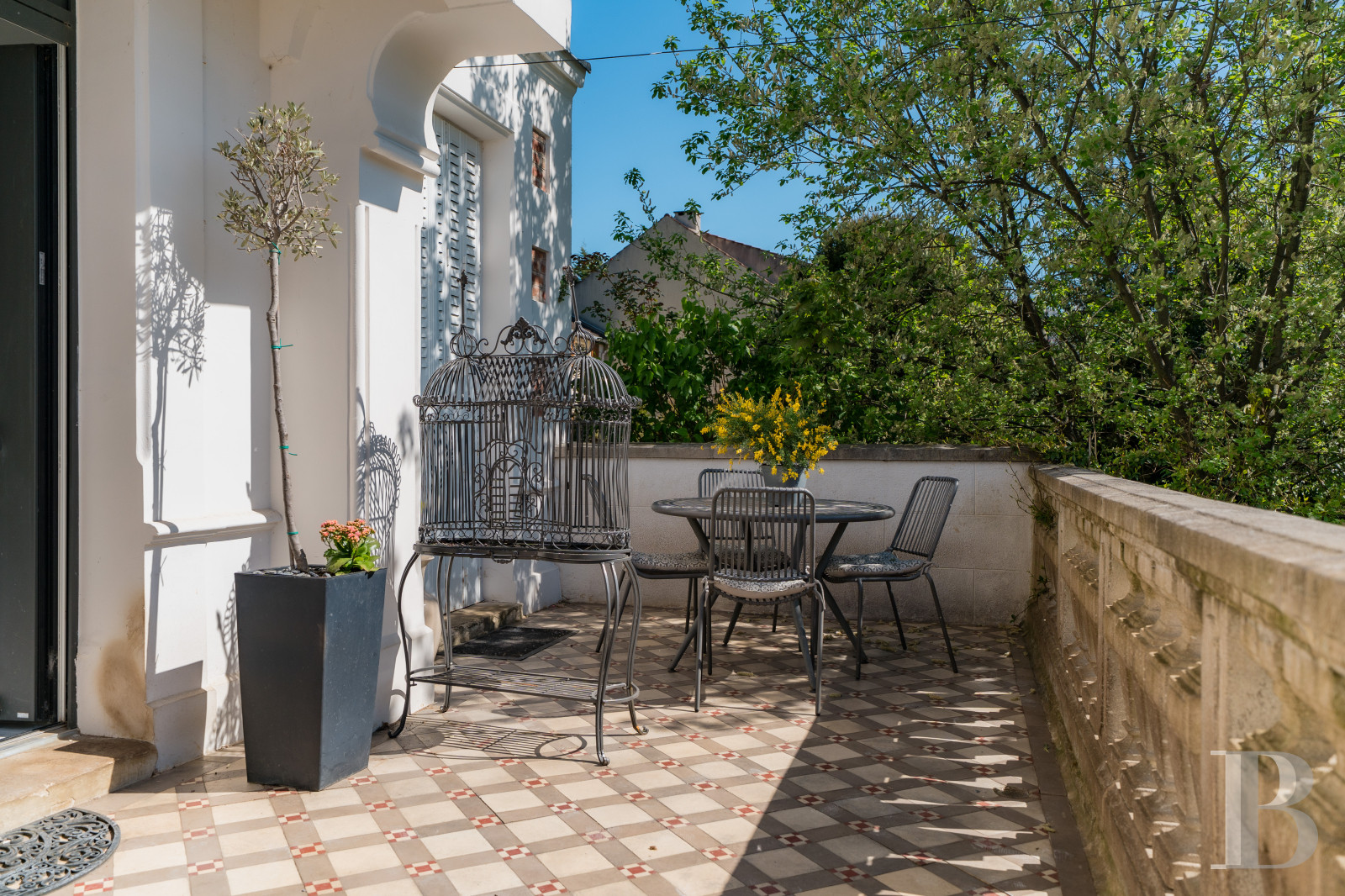 Vue depuis la rue, la propriété est précédée d’un jardin. Un escalier en pierre blanche bordé d’une balustrade massive, également en pierre, mène à un perron qui peut servir de terrasse. Orienté au sud, il permet l’accès à la maison. Celle-ci, surélevée d’un entresol, se développe sur trois niveaux organisés autour d’une distribution centrale.Le rez-de-jardin