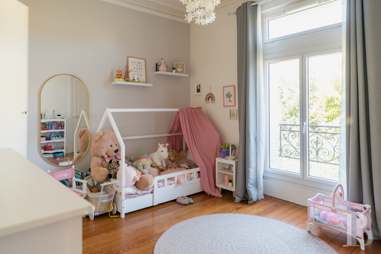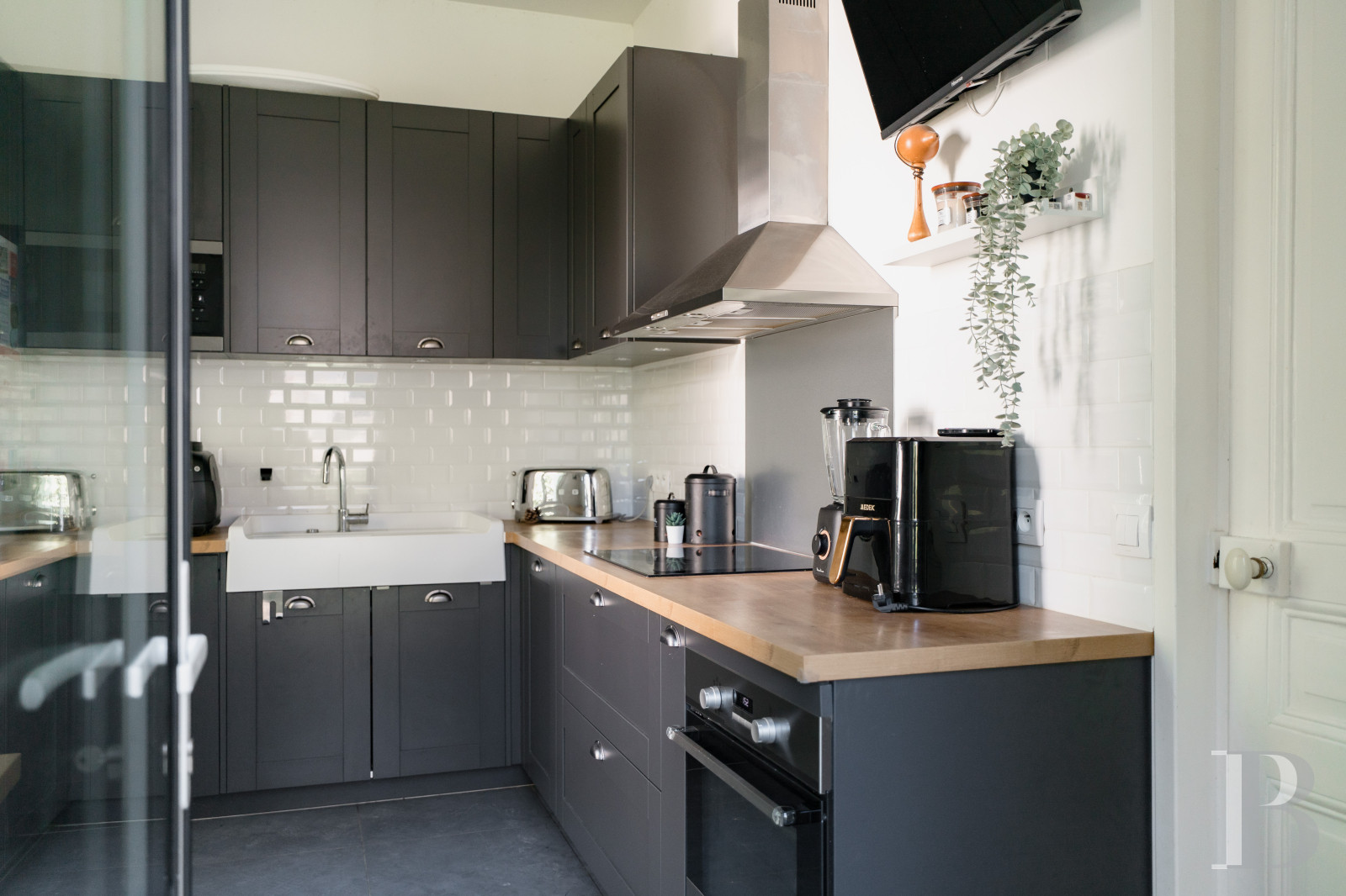 L’entrée est couverte d'un sol en carreaux de ciment aux motifs cintrés qui contribuent à l’identité du lieu. À gauche, une porte s’ouvre sur un salon-salle à manger dont les plafonds arborent leurs moulures d’origine. Les baies vitrées apportent une abondante luminosité, sans vis-à-vis direct avec la rue. À droite, un petit salon aménagé en bureau procure un espace plus intimiste.Dans le prolongement du hall se trouvent une cuisine et un cellier. Les fenêtres de la cuisine, située dans une extension harmonieusement intégrée à l’ensemble, donnent sur le jardin. Une porte-fenêtre permet l’accès à un petit perron surmonté d’une marquise, suivi d’un escalier qui descend vers le jardin. Le cellier récemment rénové comprend une lingerie et des toilettes, ce qui renforce la fonctionnalité du niveau. Un escalier en chêne, aux contremarches peintes et aux balustres en fonte, assure la liaison avec l’étage supérieur.