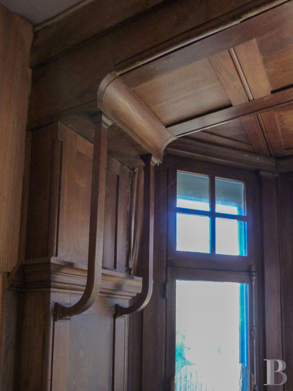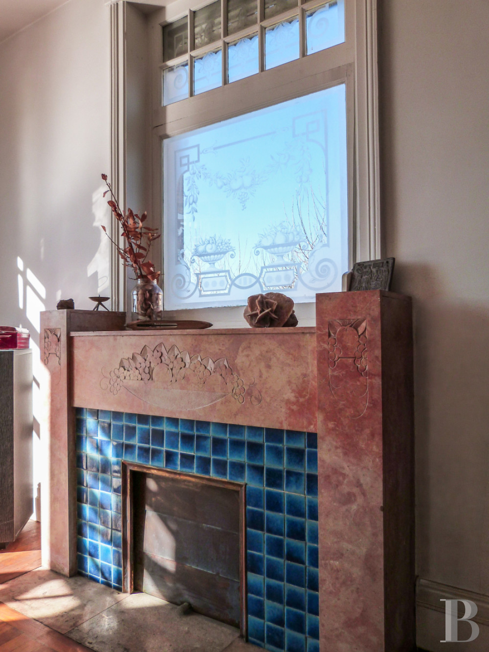Le vestibule, pièce centrale pourvue de l'escalier en bois finement sculpté, avec carreaux de ciment au sol, distribue les accès aux différentes pièces :- un bureau de 10 m² avec "bow window", boiseries murales sculptées d'origine et cheminée en marbre.- des sanitaires indépendants.- la cuisine, de 10 m², avec accès direct au sous-sol et aux caves, ainsi qu'à la terrasse, côté sud.- la salle à manger et le salon (respectivement de 16 et 11 m²), séparés par des portes doubles vitrées, chaque pièce étant gratifiée d'une cheminée sous fenêtre en marbre sculpté, de sols parquetés et de moulures au plafond, ainsi que de larges ouvertures à petits et grands carreaux. De la salle à manger, une double porte ouvre sur la terrasse. Pour un meilleur confort thermique, un poêle à granulé a été ajouté.