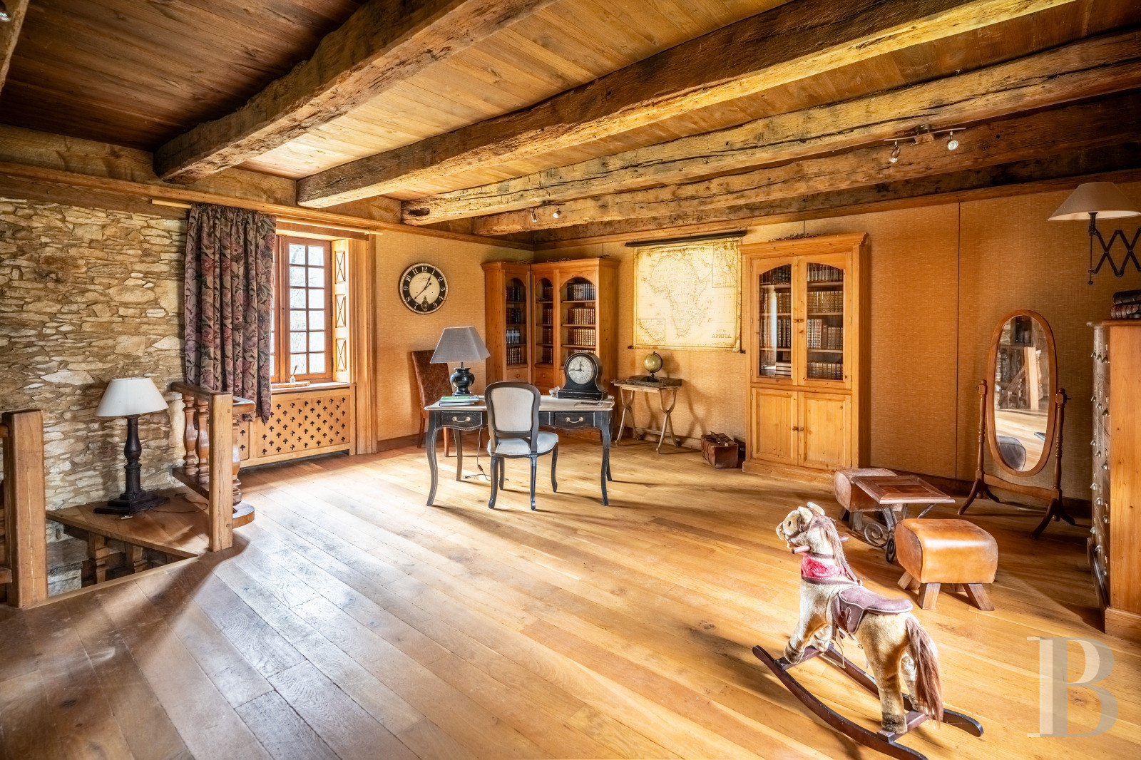 L’entrée principale donne sur une pièce à usage d’accueil, de salon et de distribution, largement ouverte, caractérisée par une forte présence du bois. Le plafond à poutres apparentes répond à un parquet en larges lames qui unifie l’espace. Un mur de pierre partiellement dégagé apporte un contraste minéral. La cheminée monumentale en pierre, encadrée de boiseries moulurées, structure le volume et constitue le point focal de la pièce. Une fenêtre à petits carreaux, habillée de tentures, laisse entrer une lumière latérale qui éclaire un espace de travail. Elle commande une ancienne chambre aux mêmes caractéristiques architecturales, des sanitaires, ainsi qu’un salon-bibliothèque enrichi de meubles réalisés sur mesure. Le niveau accède, lui aussi, directement aux terrasses situées au sud-est.
