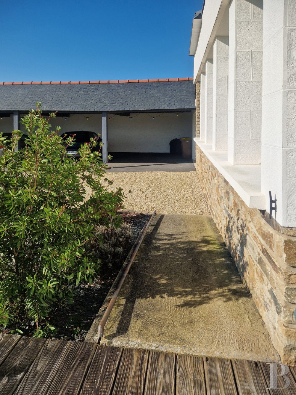 À l’ouest, le préau permet de stationner quatre véhicules, sur environ 93 m². Il comporte des éclairages et des prises électriques. Le garage de quelque 40 m² est fermé et invisible depuis le jardin. Situé dans le prolongement de la maison, il est accessible depuis la largeur du préau via deux grandes portes. Il est éclairé par plusieurs grandes plaques de toit translucides.Le jardin