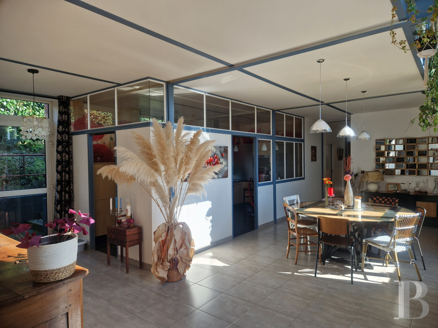 L'entrée principale dessert d'un côté un salon-bureau, baigné de lumière grâce à de vastes baies. Equipé d’un poêle à bois, il donne accès à une buanderie, à une salle d’eau avec toilettes et à une petite cave. Au droit de l'entrée, un escalier en métal dessert l'étage. Une chaufferie est située à l'arrière. De l'autre côté de l'entrée, une salle à manger ouvre par une porte sur une terrasse et le jardin. Surmontée par une passerelle métallique à l’étage, elle est séparée d'une cuisine aménagée par des cloisons vitrées, fixées sur un cadre métallique. Une deuxième entrée est accessible via un couloir qui sépare une chambre et une salle de bains. Un escalier métallique à deux volées dessert une salle de séjour avec plafond cathédrale et sol surélevé. Un poêle à pellets y est installé. L'espace correspond à l’ancienne scène de théâtre de l’école. L'ensemble des sols sont carrelés et les pièces sont toutes orientées au sud.