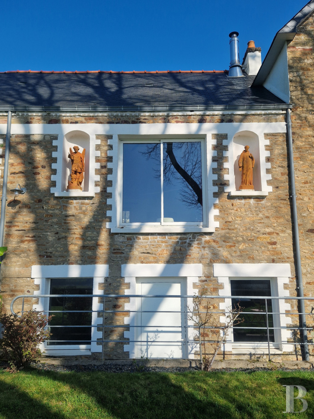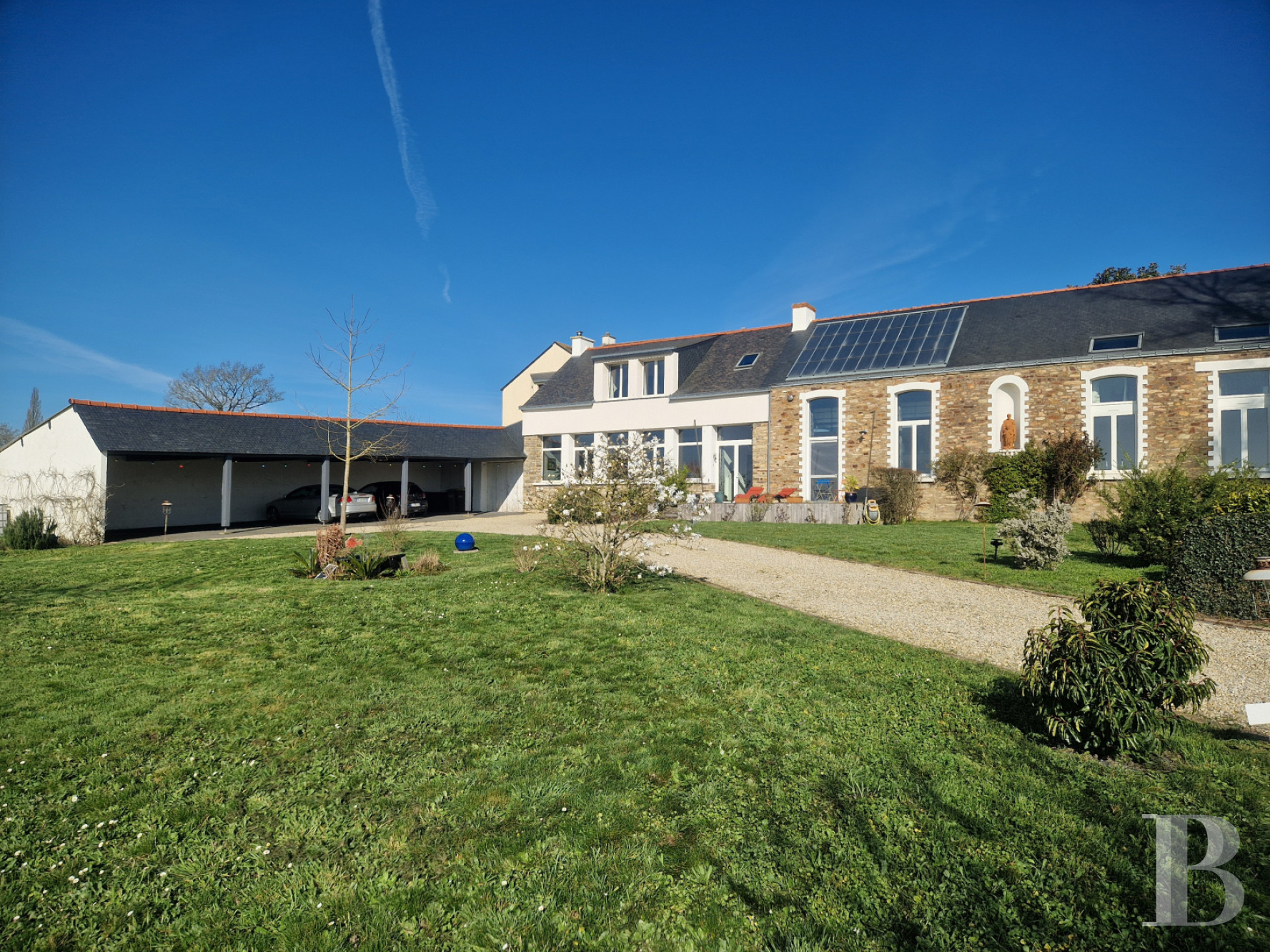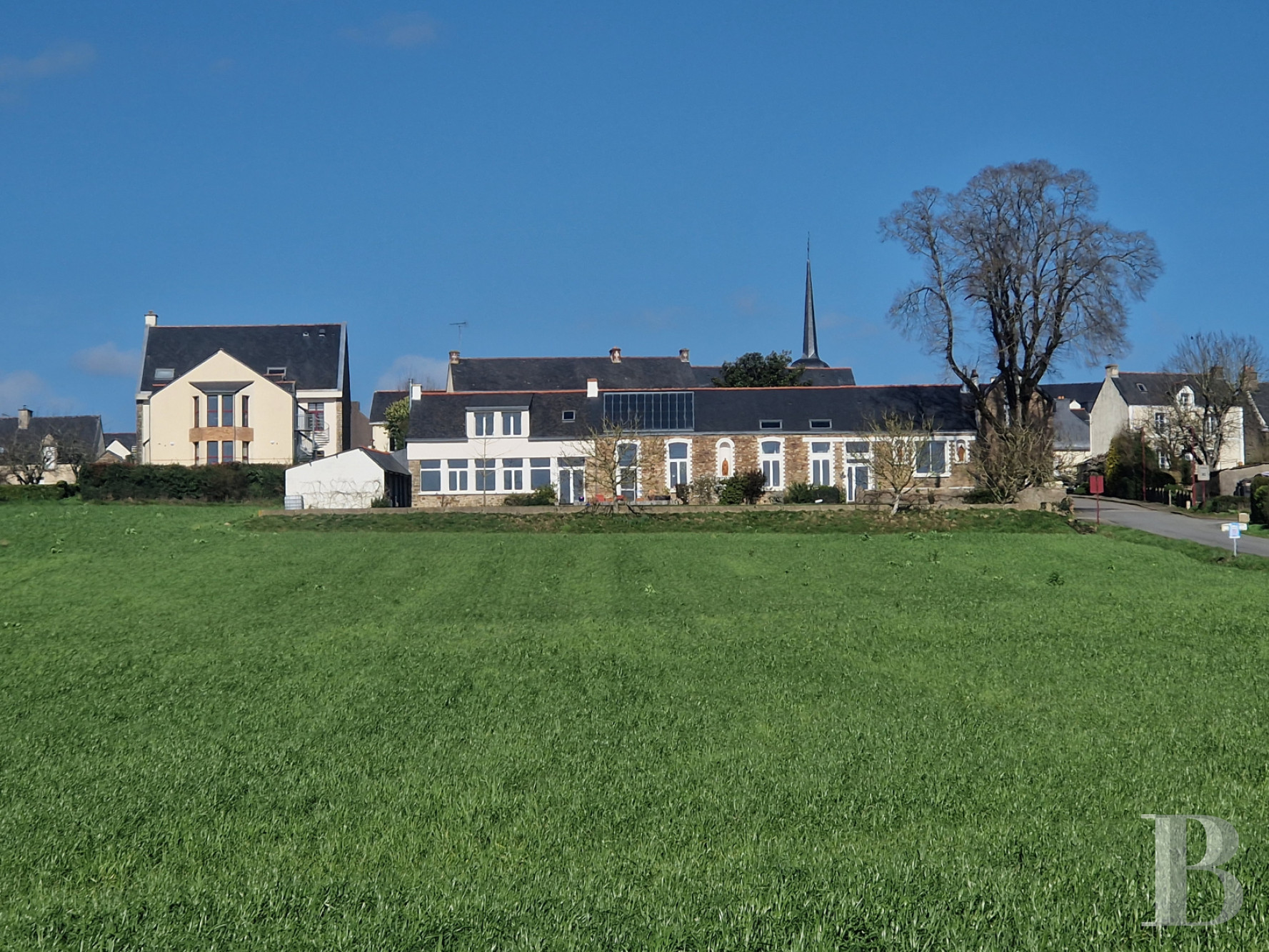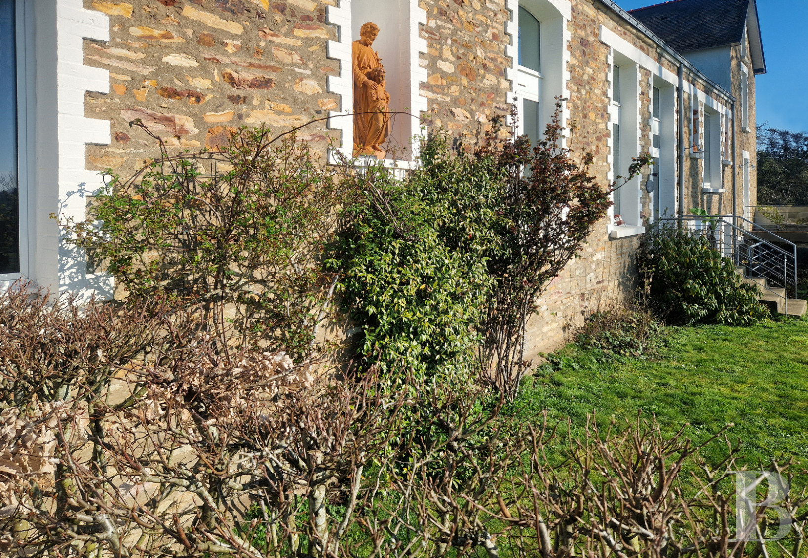 Témoin emblématique de l’histoire locale, la maison domine la vallée, liserée de tendres reliefs à l’horizon. Avec sa façade remarquable, ornée de niches et de statues religieuses, l'ancienne école a vu passer des générations d'écoliers et d'enseignants. Aujourd'hui entièrement rénovées dans un esprit contemporain, les anciennes classes sont devenues des pièces de vie lumineuses et confortables. La propriété tire aussi parti de sa modularité, avec sa maison d'amis accessible depuis la rue. À l'extérieur et vers le sud, la vue dégagée permet d’étendre le jardin bien au-delà de ses limites, sans la contrainte de l'entretien. Alentour, c'est la campagne mais en Bretagne, la mer n'est jamais loin.