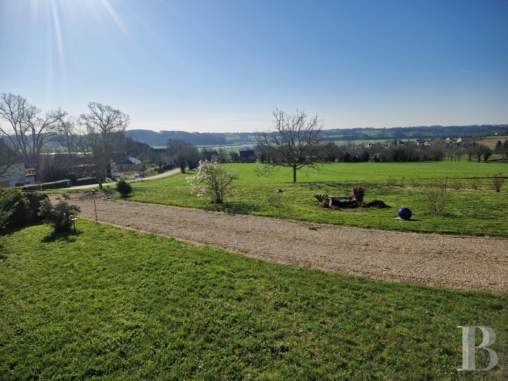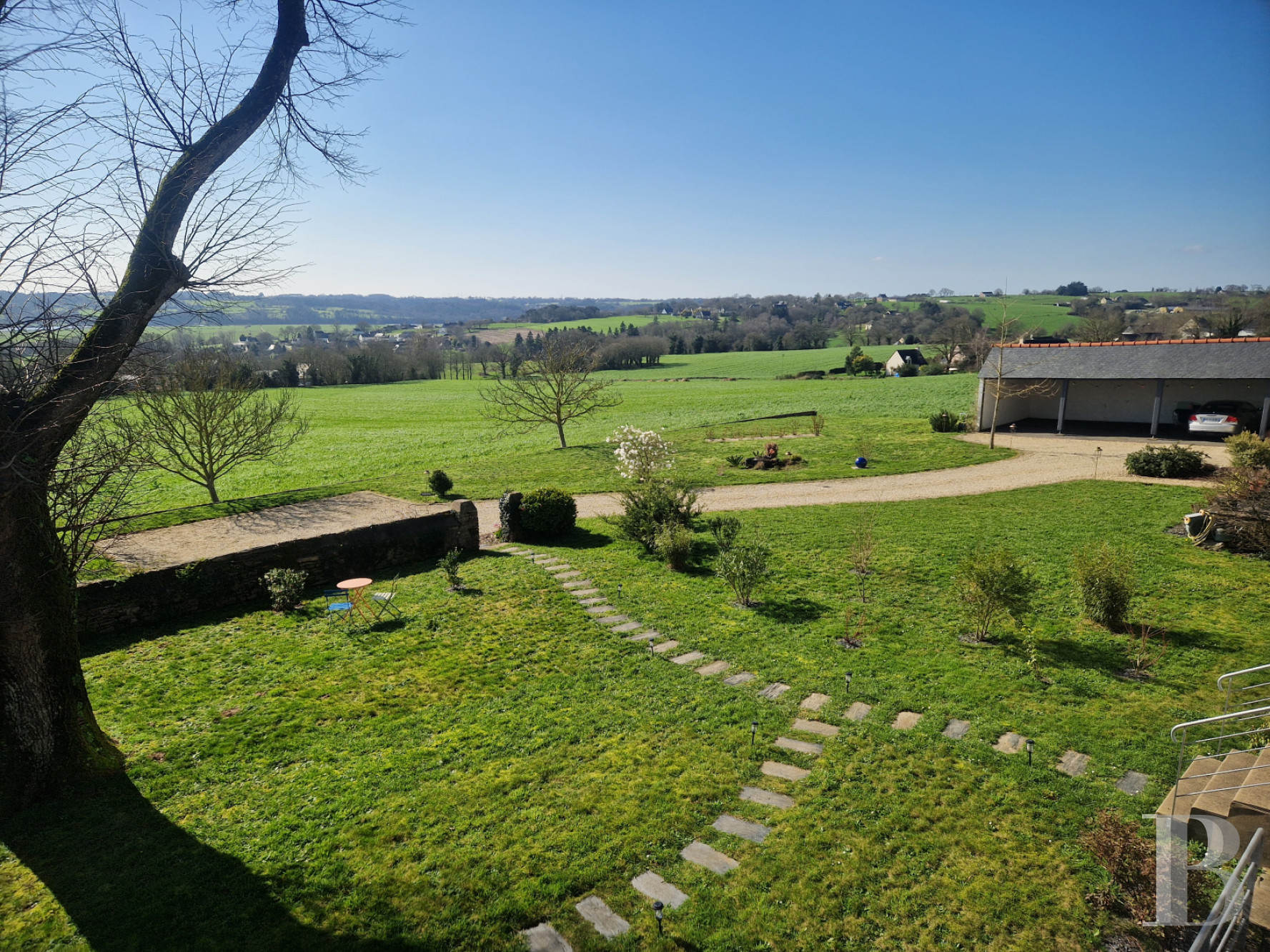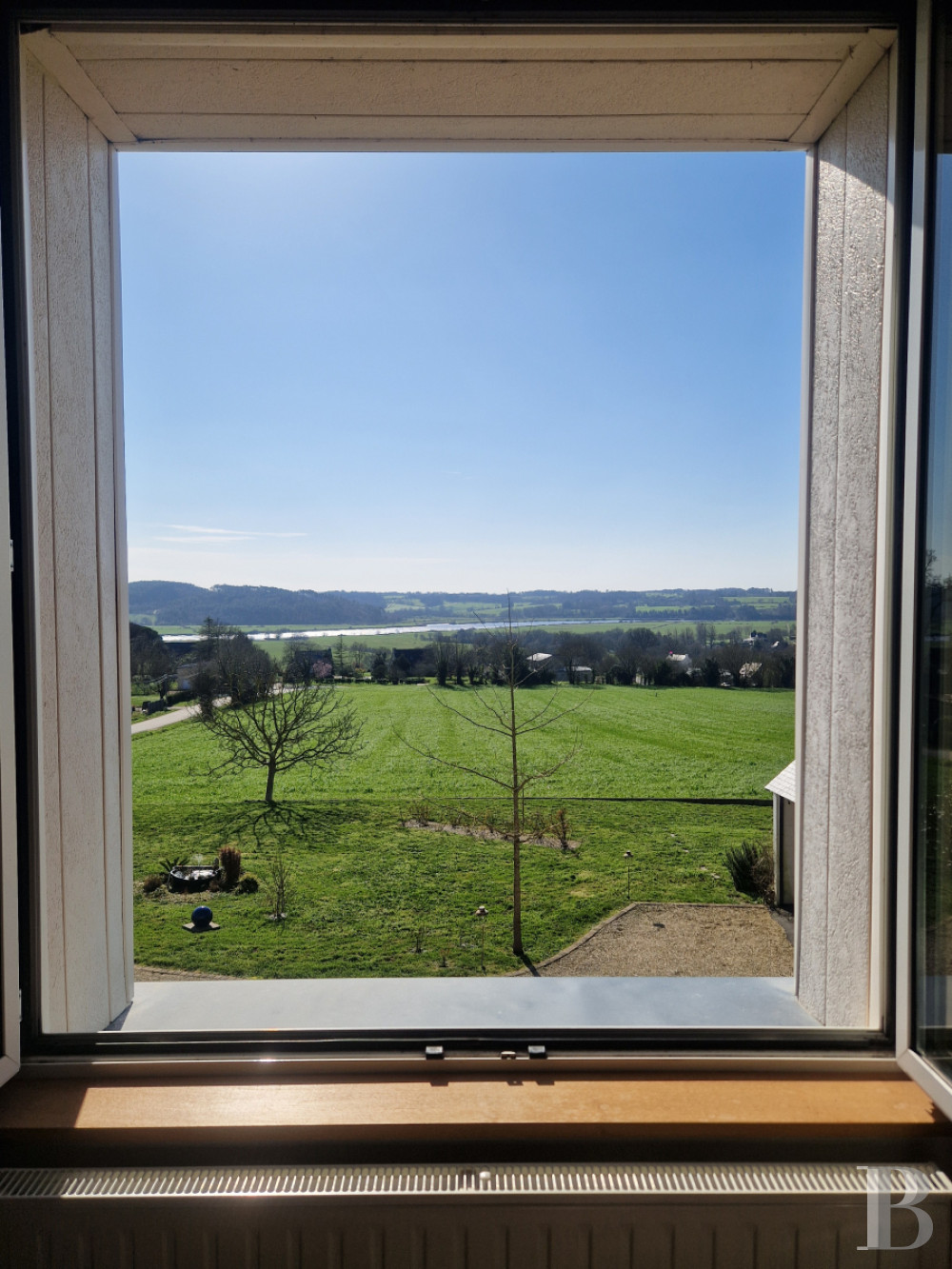 Témoin emblématique de l’histoire locale, la maison domine la vallée, liserée de tendres reliefs à l’horizon. Avec sa façade remarquable, ornée de niches et de statues religieuses, l'ancienne école a vu passer des générations d'écoliers et d'enseignants. Aujourd'hui entièrement rénovées dans un esprit contemporain, les anciennes classes sont devenues des pièces de vie lumineuses et confortables. La propriété tire aussi parti de sa modularité, avec sa maison d'amis accessible depuis la rue. À l'extérieur et vers le sud, la vue dégagée permet d’étendre le jardin bien au-delà de ses limites, sans la contrainte de l'entretien. Alentour, c'est la campagne mais en Bretagne, la mer n'est jamais loin.