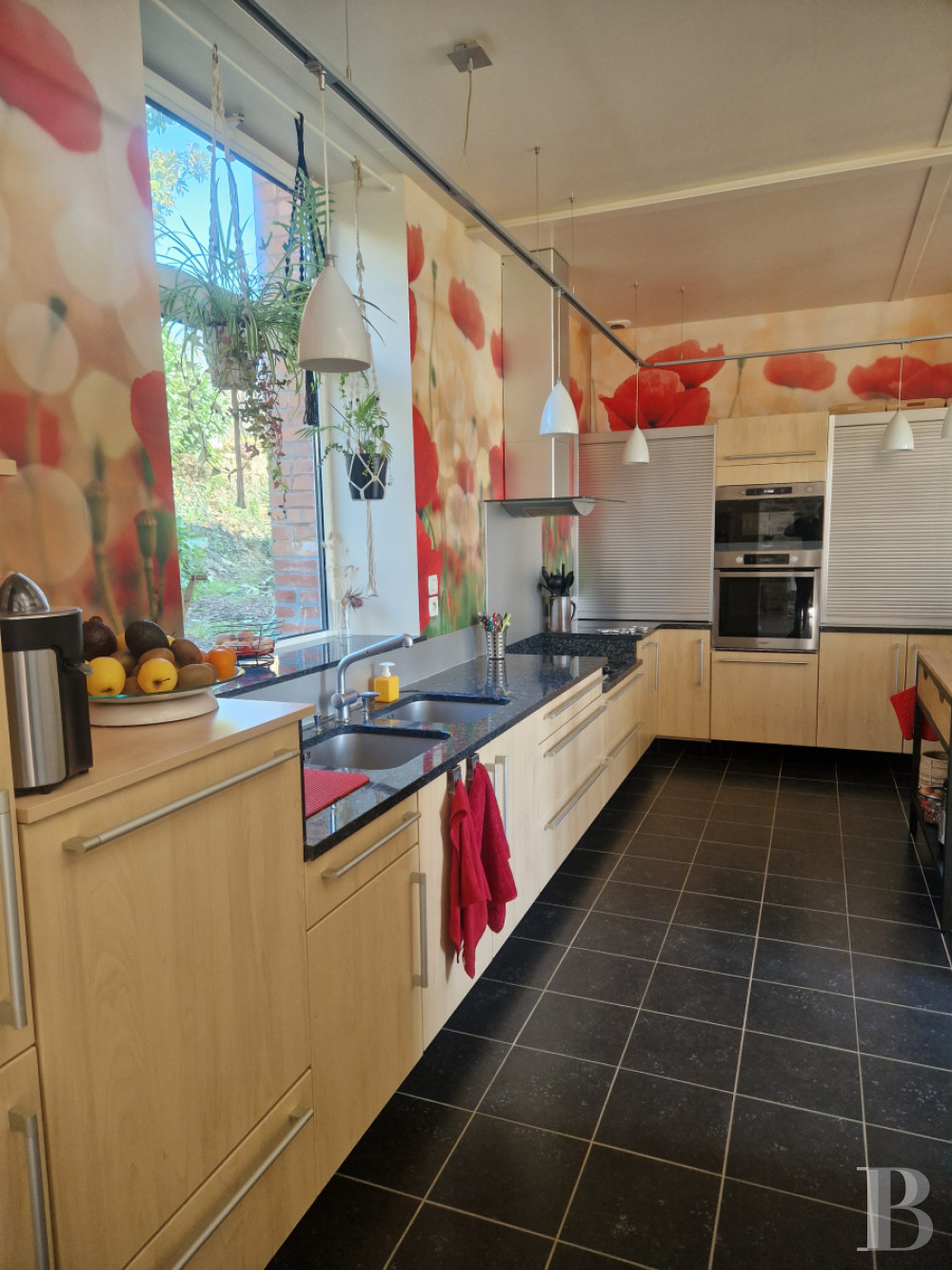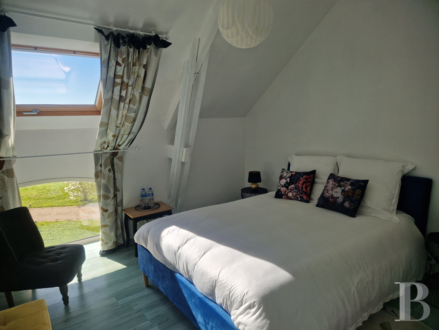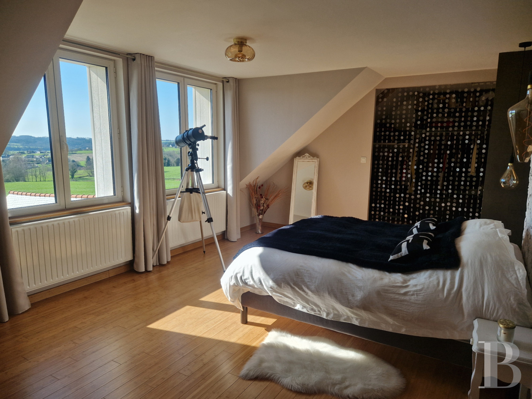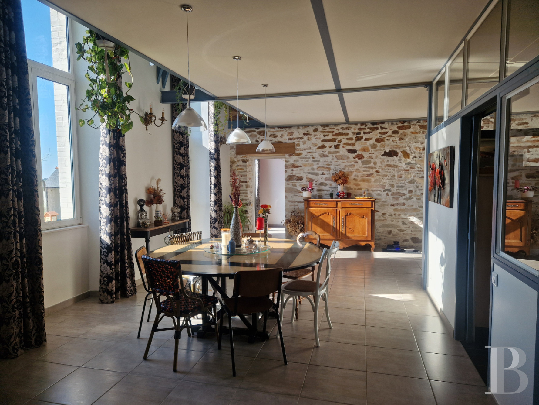 Témoin emblématique de l’histoire locale, la maison domine la vallée, liserée de tendres reliefs à l’horizon. Avec sa façade remarquable, ornée de niches et de statues religieuses, l'ancienne école a vu passer des générations d'écoliers et d'enseignants. Aujourd'hui entièrement rénovées dans un esprit contemporain, les anciennes classes sont devenues des pièces de vie lumineuses et confortables. La propriété tire aussi parti de sa modularité, avec sa maison d'amis accessible depuis la rue. À l'extérieur et vers le sud, la vue dégagée permet d’étendre le jardin bien au-delà de ses limites, sans la contrainte de l'entretien. Alentour, c'est la campagne mais en Bretagne, la mer n'est jamais loin.