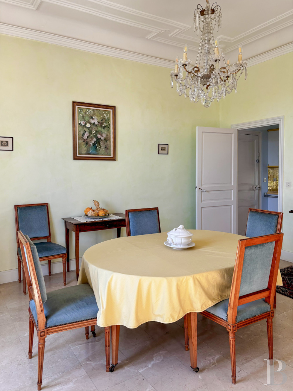Le rez-de-chausséeAccessible par un perron, la porte d’entrée, en bois et verre avec imposte, est encadrée de pilastres en pierre et ouvre dans un vestibule aux lambris d'appui en bois peint en gris. À ce niveau, les sols sont tous pavés de dalles de marbre crème excepté celui de la cuisine, recouvert d'un carrelage blanc. Le hall se prolonge en face par un escalier qui mène à l'étage. Il distribue à droite via une porte à double battant un vaste salon traversant aux murs clairs et au plafond blanc à frise en plâtre. La hauteur sous plafond de plus de 3 m et deux portes-fenêtres contribuent à la clarté de la pièce et à l'impression d'espace. Dans le prolongement du salon, un jardin d’hiver en angle, au sol pavé de tomettes, a été créé plus tardivement. À l’arrière de la véranda, un bureau-salon de télévision accède au jardin. De là, en traversant à nouveau le salon, une autre porte ramène dans le couloir au pied de l'escalier. Une cuisine se tient à gauche, éclairée par une porte-fenêtre dans le mur nord qui donne sur le parc. Le mobilier, sobre et moderne, est de couleur claire. De là, une porte commande une arrière-cuisine qui a investi le rez-de-chaussée de la tour, où se trouvent aussi une buanderie et la chaudière ainsi qu’une douche. Plusieurs baies éclairent cet espace technique et permettent l’accès au jardin au couchant. Enfin, la cuisine communique avec la salle à manger, également accessible depuis le couloir en face du salon, tandis que des toilettes et la descente vers la cave en demi-sous-sol prennent place sous l'escalier.