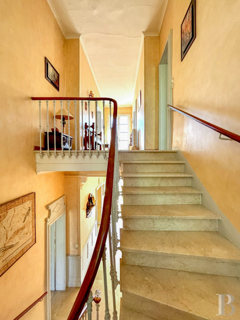 L'accès au second niveau se fait par un escalier en marbre identique à celui du sol, à rampe ouvragée en métal et bois, avec éclairage naturel par quatre vitraux multicolores. Un palier menant au balcon qui surplombe la porte d'entrée dessert toutes les pièces de l'étage, soit trois chambres spacieuses dont deux en façade sud, l’autre ouvrant au nord et donnant vue sur le jardin. Les deux pièces à coucher à droite disposent d’une baie vitrée et partagent une salle de bains ainsi que des toilettes situés dans la tour et bénéficiant ainsi d’une luminosité accrue. Le sol en carreaux de ciment, les accessoires et le mobilier rétros lui donnent un attrait certain. La chambre principale, située côté levant et développée sur plus de 25 m², profite d'une spacieuse et lumineuse salle de bain avec douche et toilettes privatives ainsi que d’une garde-robe à l’arrière. Entre la chambre et la salle de bain, une porte commande un escalier droit qui permet l’accès au grenier, actuellement aménagé en bureau et salle des archives familiales. Les sols de l'étage sont revêtus de parquets, sauf ceux des pièces d'eau, qui sont carrelés.