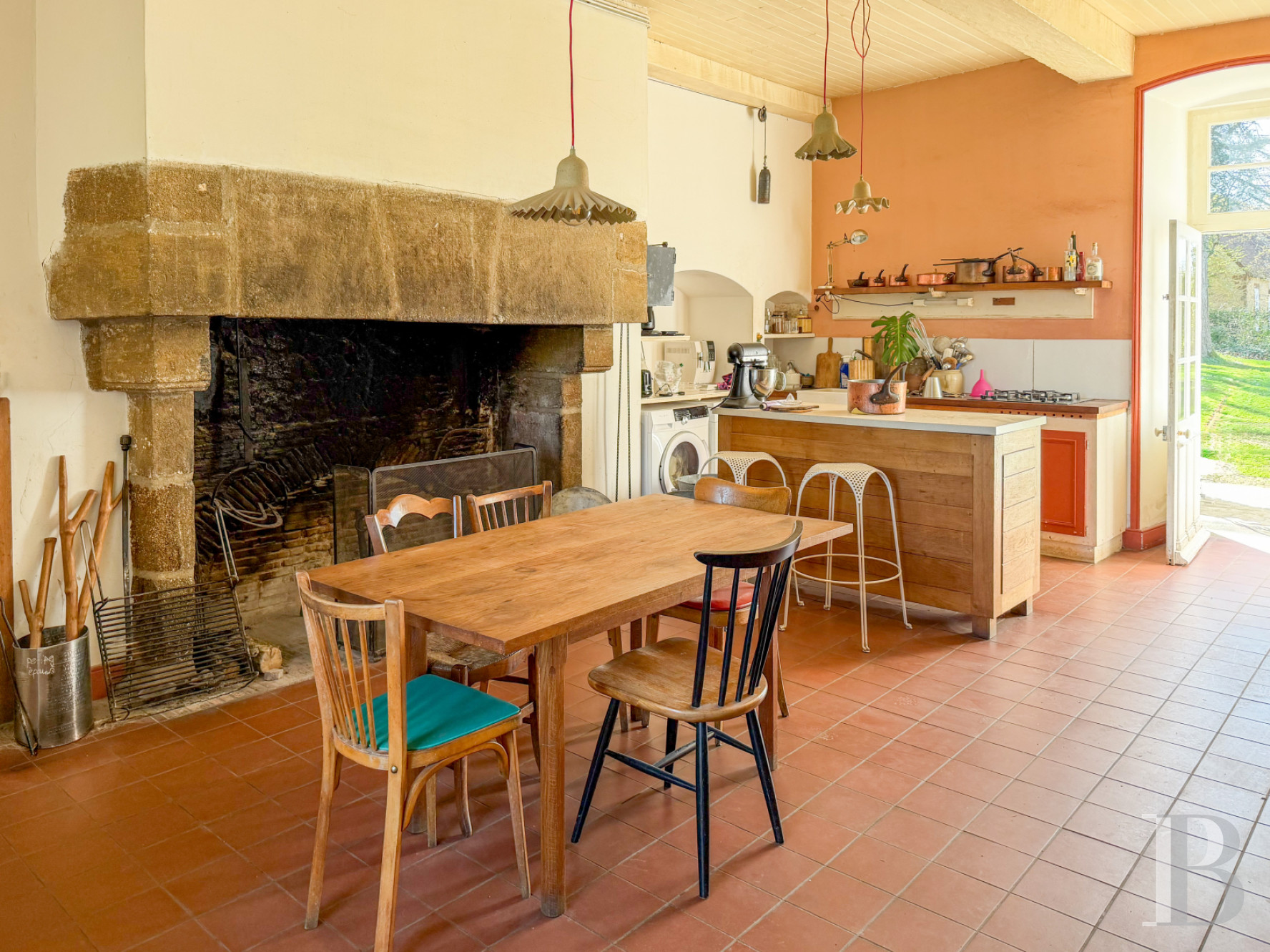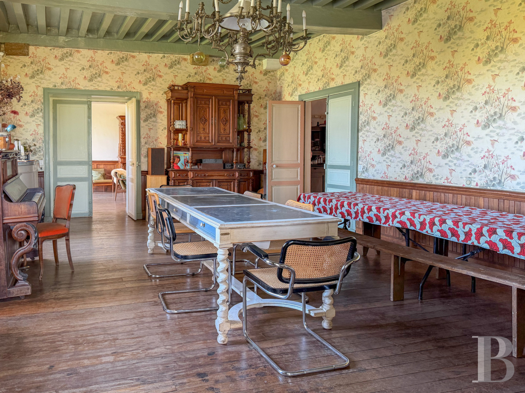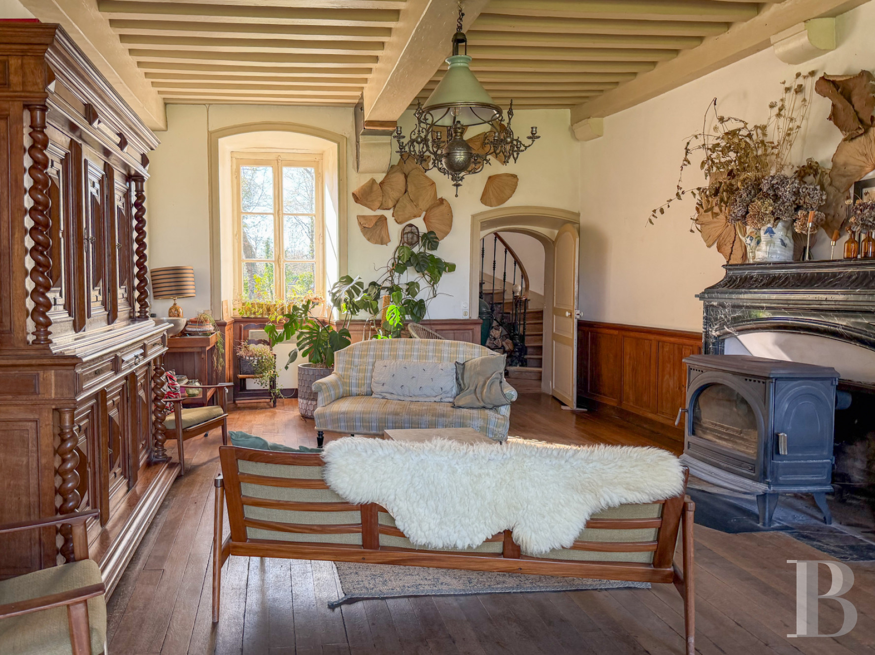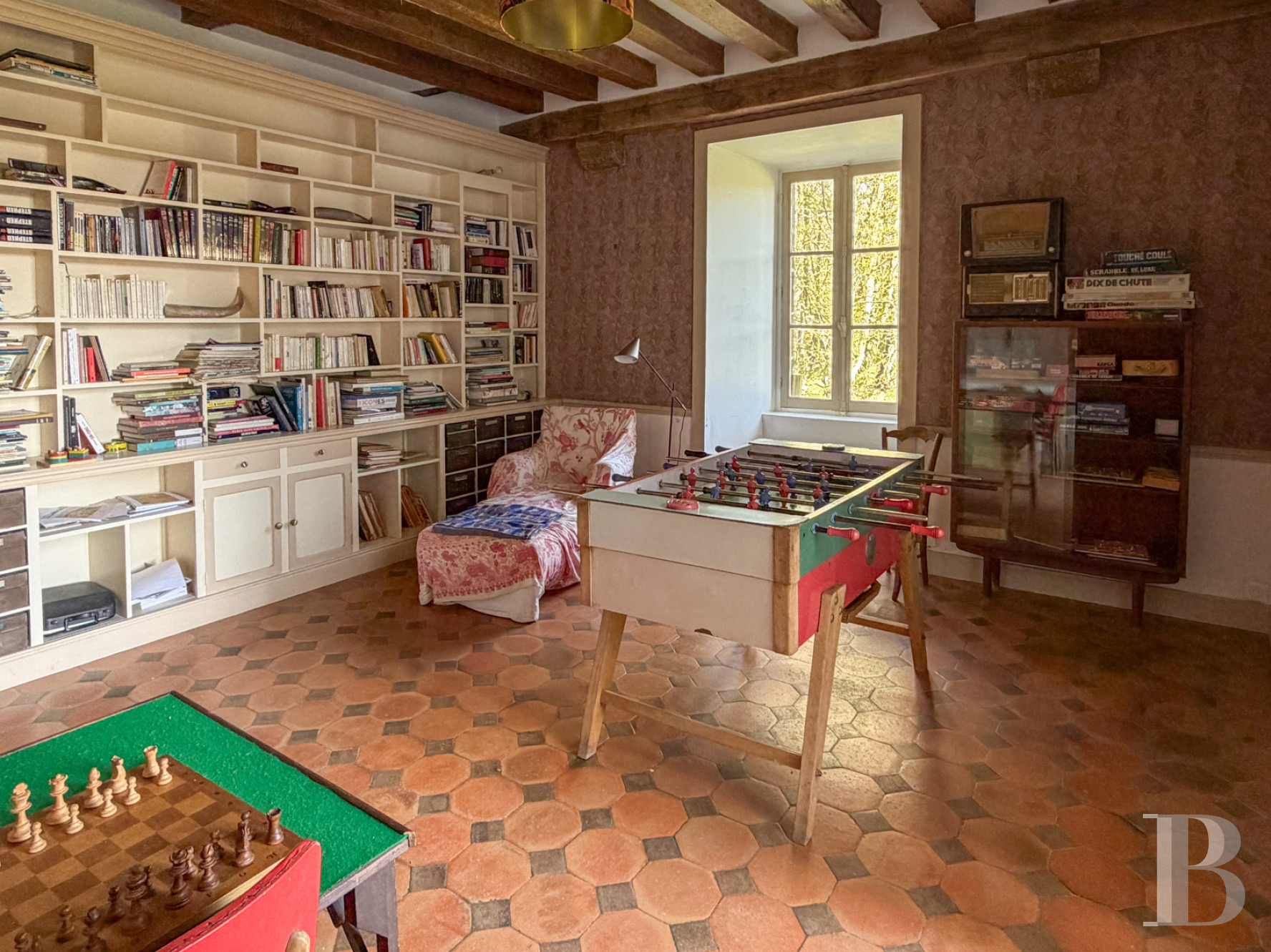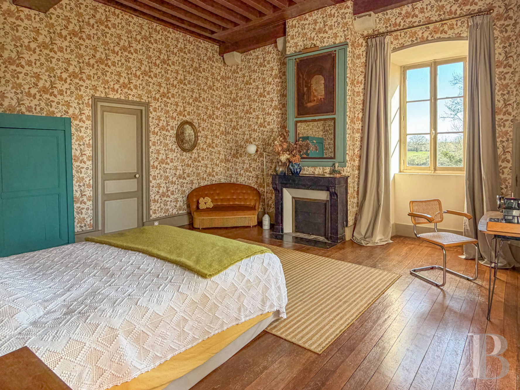 Un palier donne accès à un vaste dortoir avec poutres apparentes. Dans la continuité, une chambre lumineuse avec vue sur le parc voisine une salle d'eau.