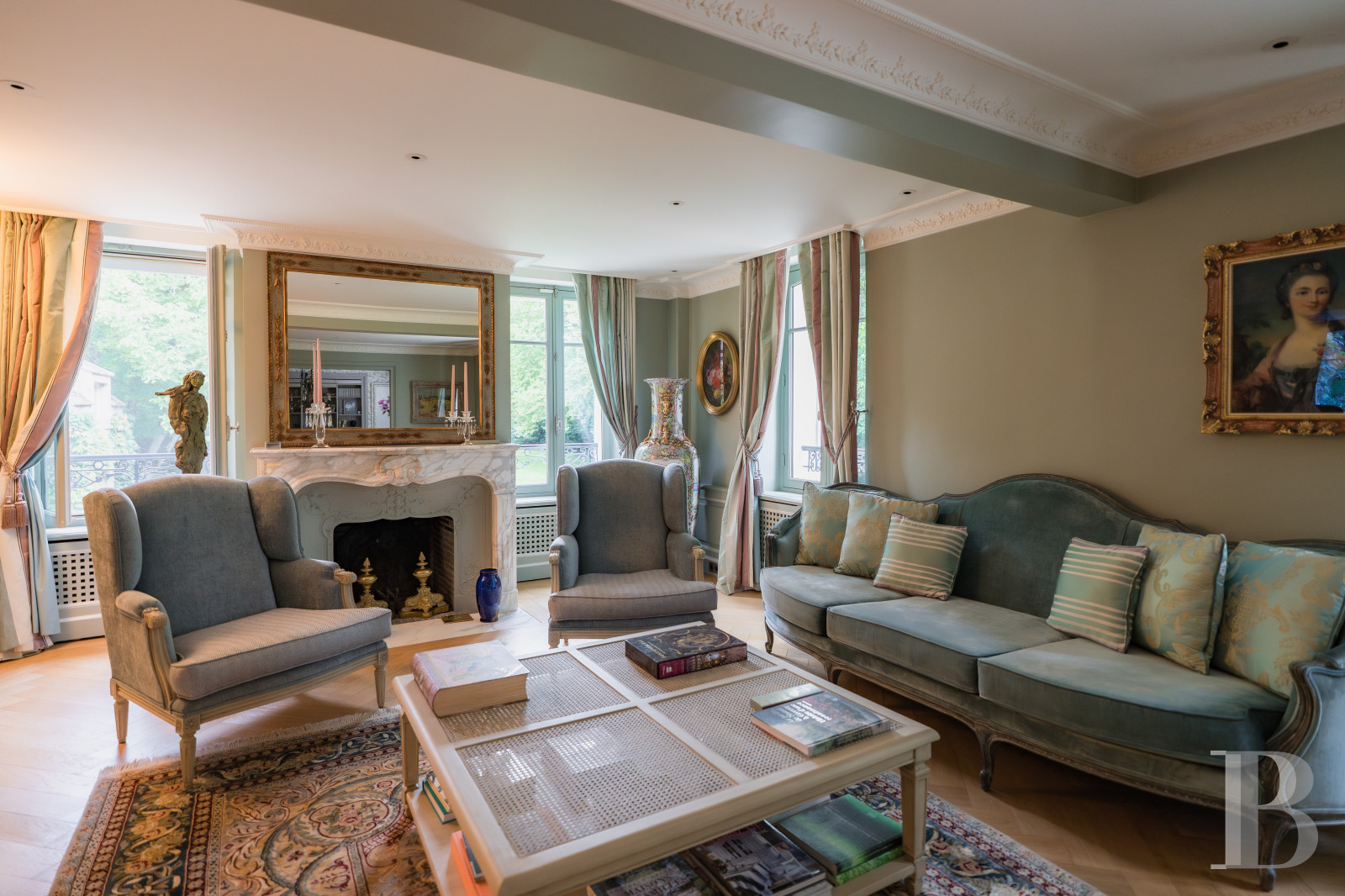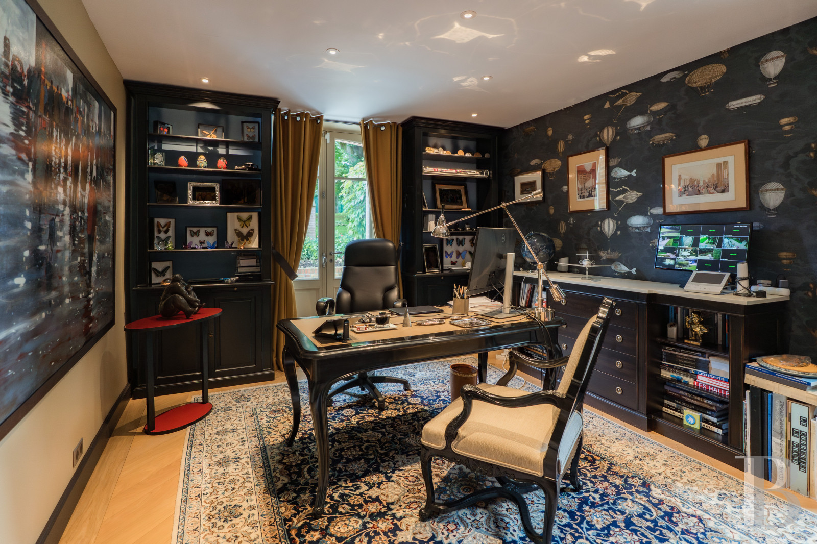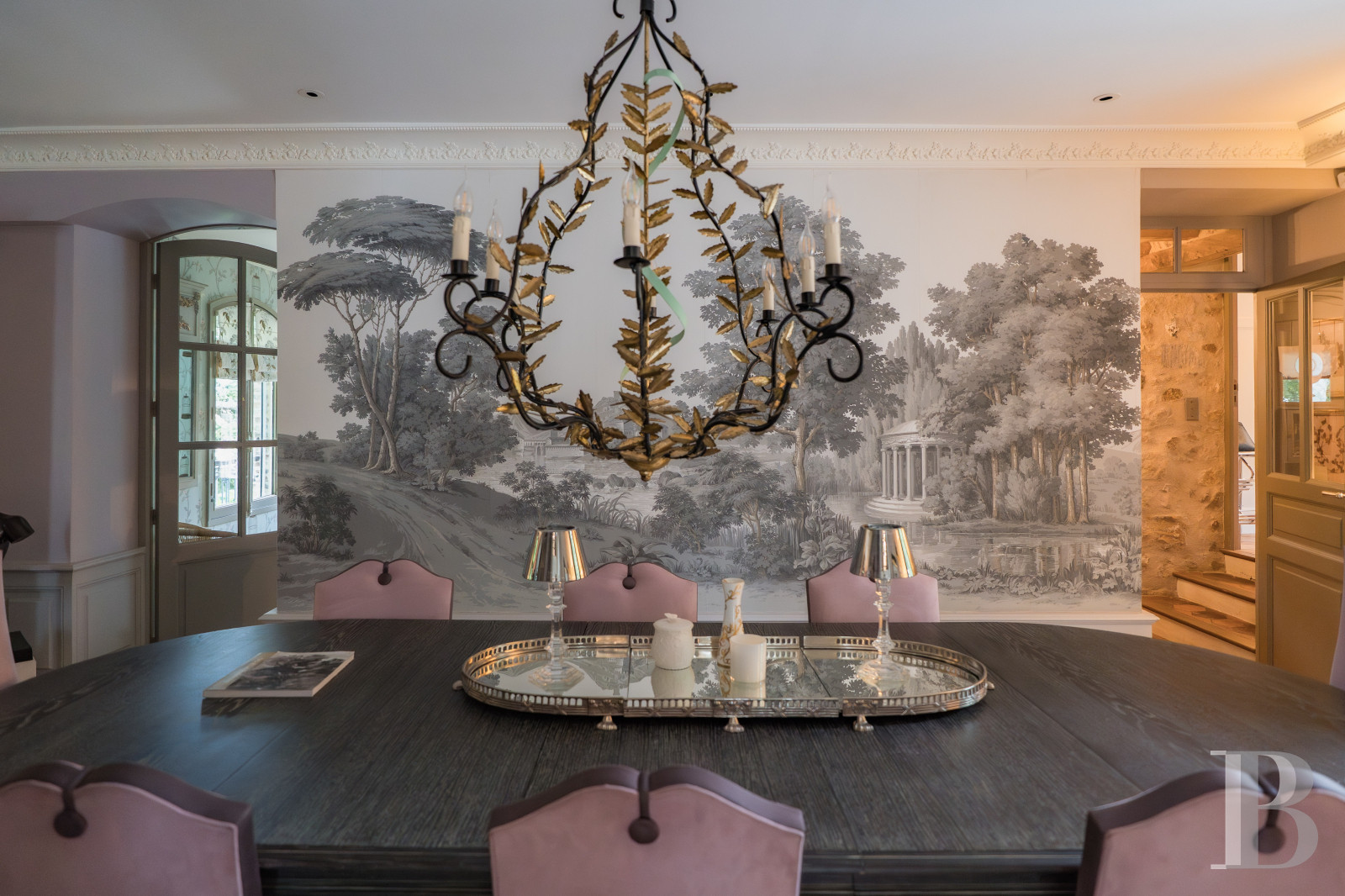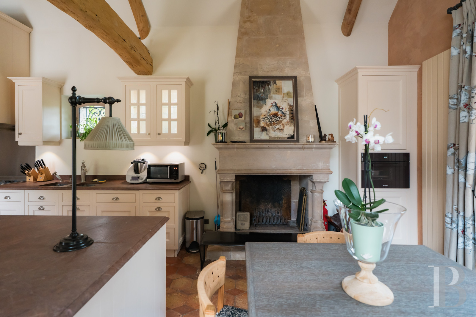 Il se compose d’une entrée-salle de séjour qui ouvre, à droite, sur un grand salon, puis sur un bureau et, à gauche, sur un petit salon-salle à manger, sur la cuisine et sur une petite pièce nommée « la Volière », où se trouve un ascenseur. Les sols sont en pierre blanche à cabochons noirs dans l’entrée et la salle de séjour, et en parquet à bâton rompu en chêne massif dans les autres pièces, à l’exception de la cuisine et de l’entrée attenante, en terre cuite hexagonale. Deux grandes cheminées du 18e s. – en marbre blanc dans le grand salon et en pierre blanche dans la cuisine – ornent et réchauffent les pièces. Moulures, boiseries, portes peintes moulurées ou ajourées, papiers peints aux motifs végétaux ainsi que les teintes harmonieuses des murs, créent une atmosphère chaleureuse tout en ménageant des identités personnalisées pour chaque pièce. La cuisine, d’une superficie de 30 m² environ, bénéficie de trois expositions différentes. Deux portes-fenêtres donnent sur une terrasse et une piscine. Un grand îlot central, une table devant la cheminée ainsi que tout le confort de la modernité font de la cuisine la pièce maîtresse du niveau.