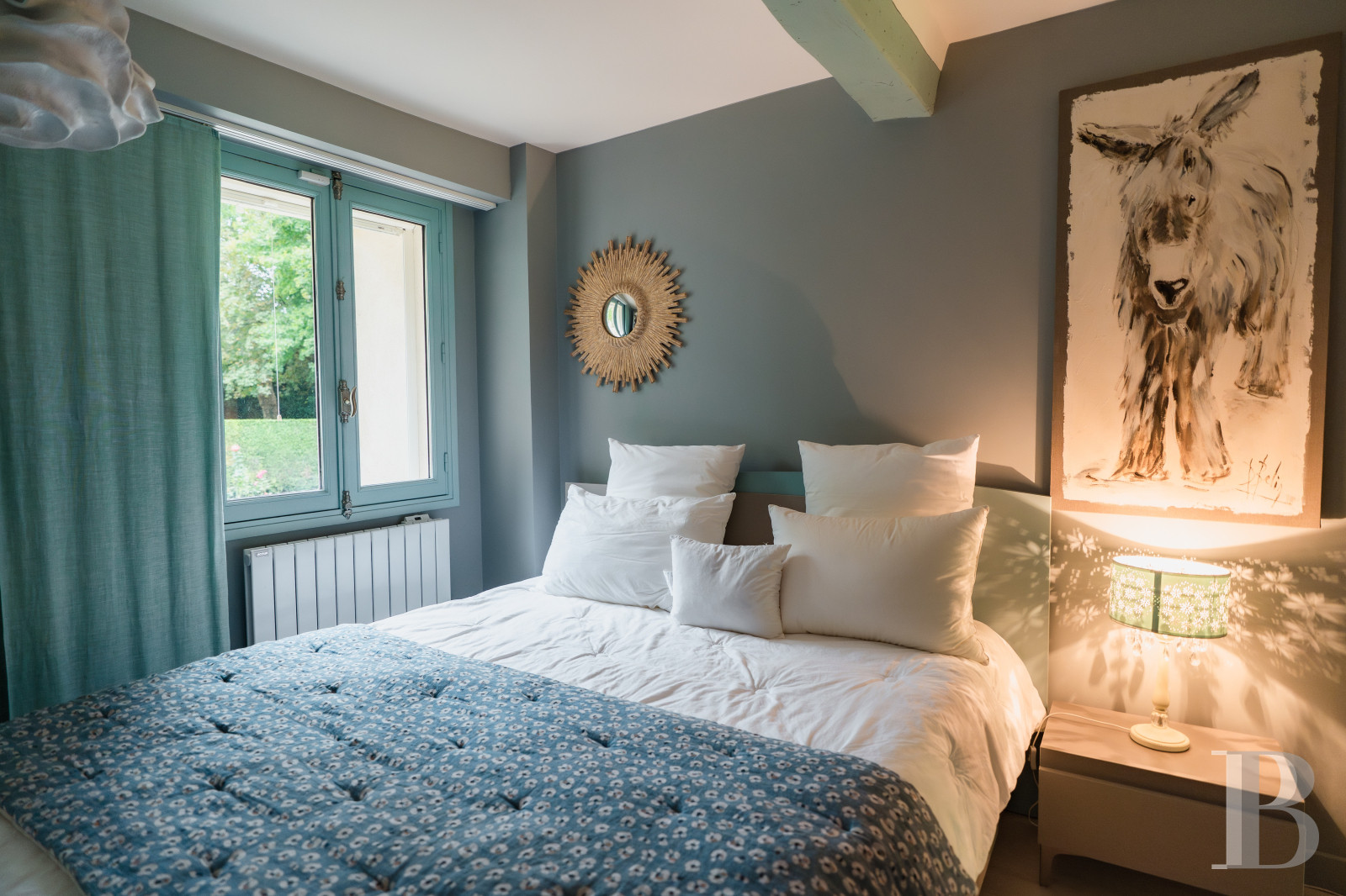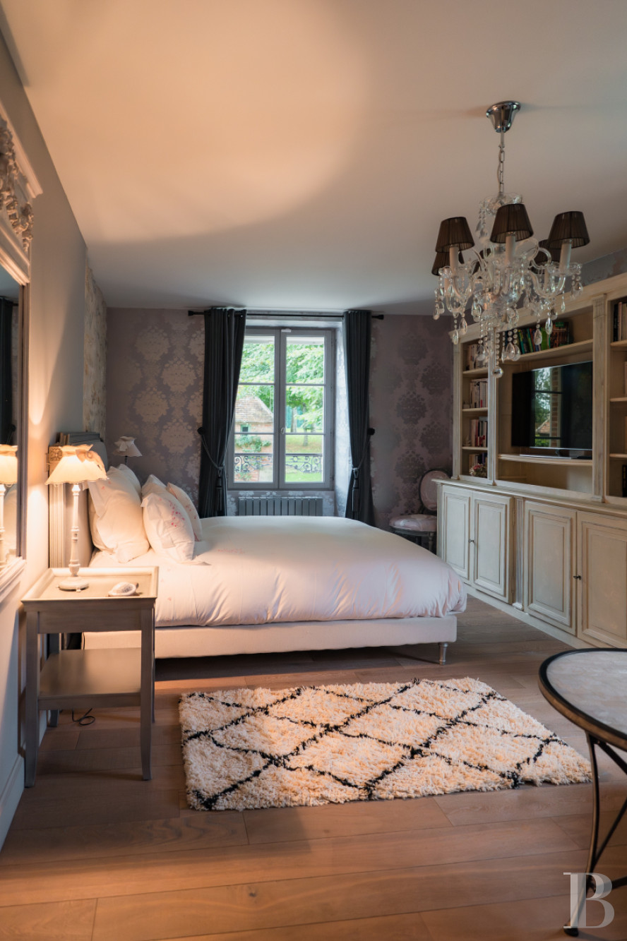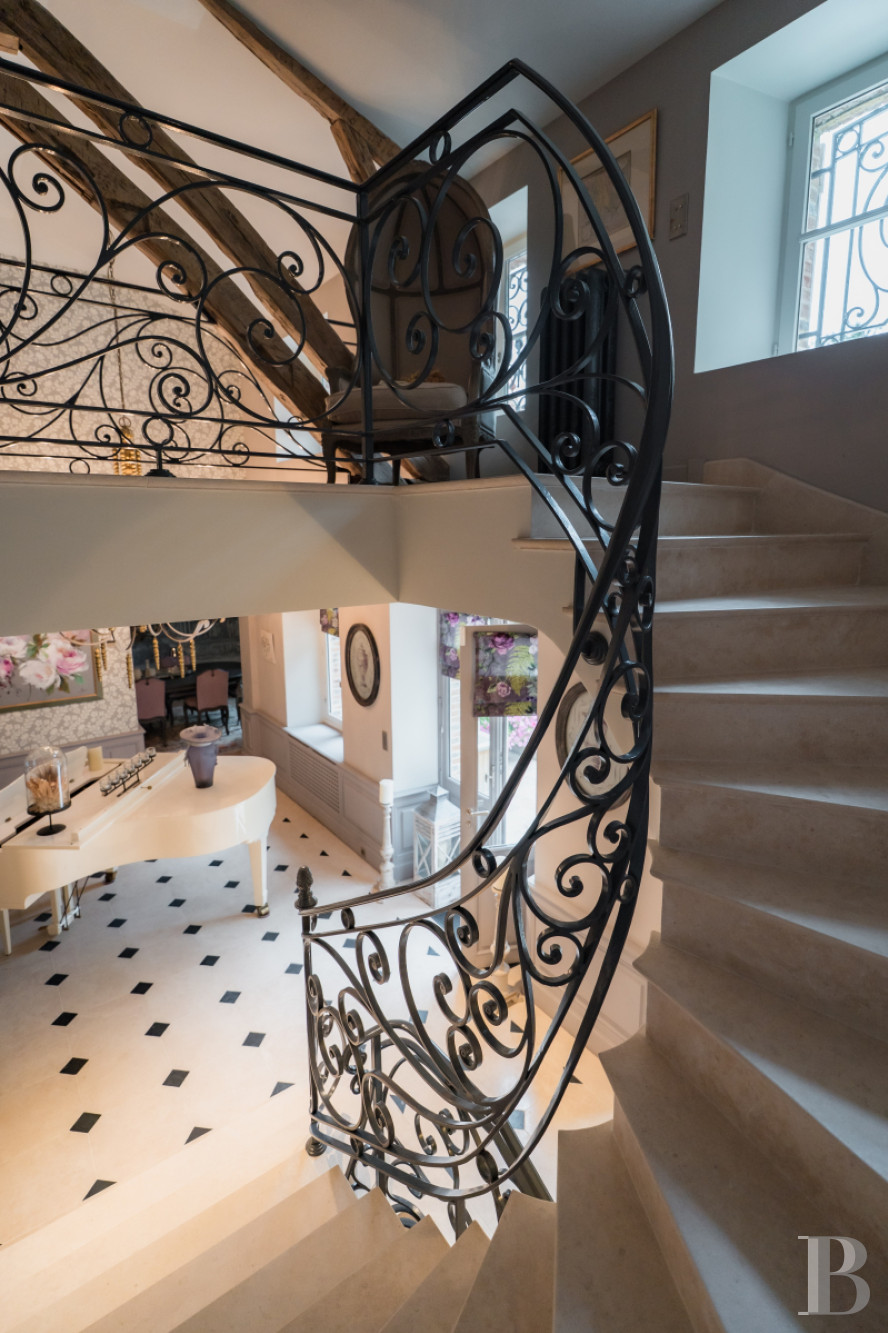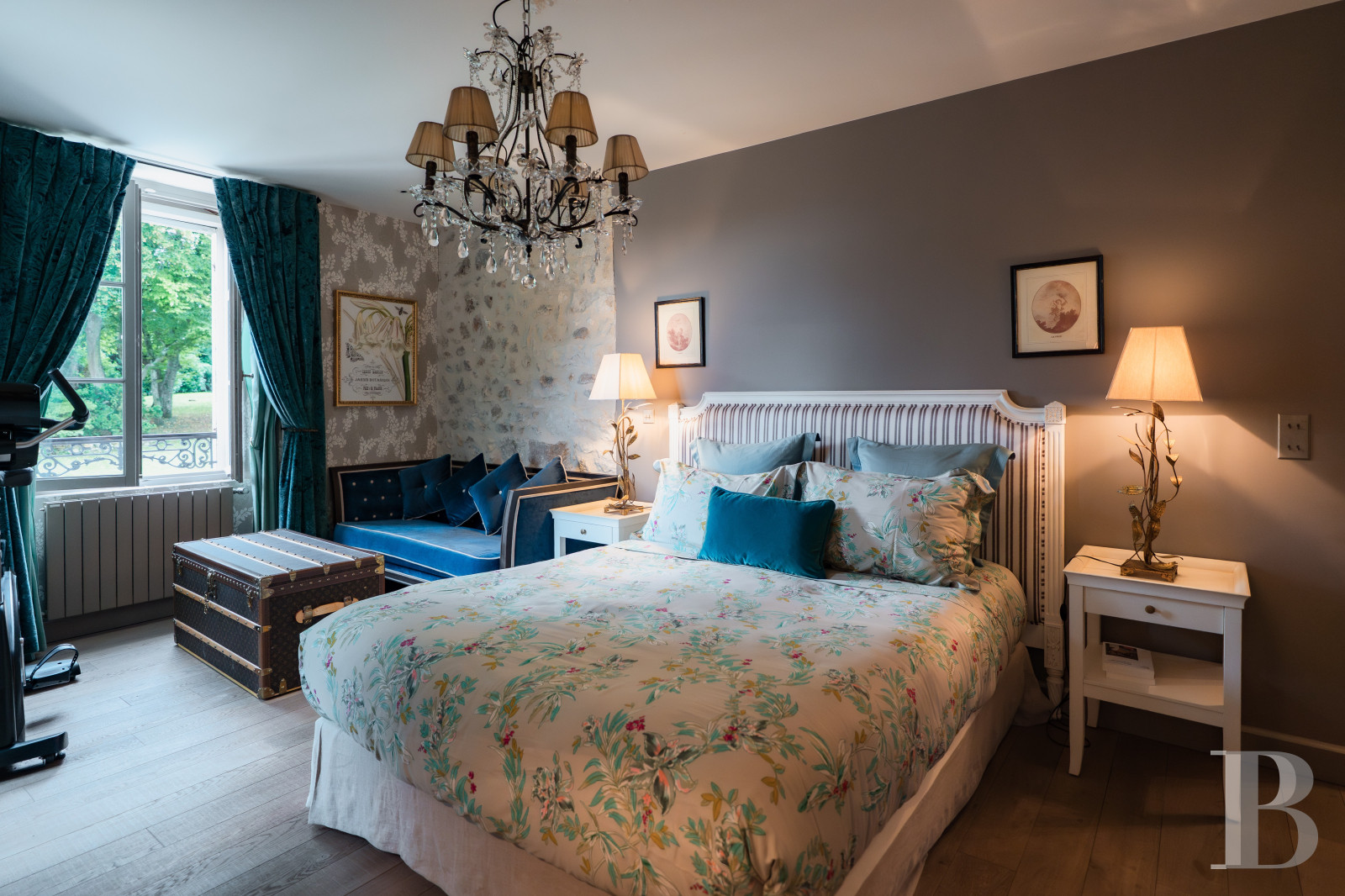 Un escalier à double quart tournant en pierre blanche avec garde-corps en fer forgé et un ascenseur mènent à l’étage situé sous les combles. Le niveau compte une chambre principale avec garde-robe, un espace bureau et une grande salle de bains avec double vasque, douche et toilettes, dont le sol est en pierre blanche à cabochons noirs. Il comporte également un petit espace pour une chambre, une chambre d’amis, avec salle d’eau et toilettes. Les sols des chambres sont en parquet droit en chêne massif. Les murs sont en pierre apparente ou recouverts de papiers peints à motifs floraux. Les chambres profitent d’une double exposition, dont une terrasse privative pour la chambre principale.