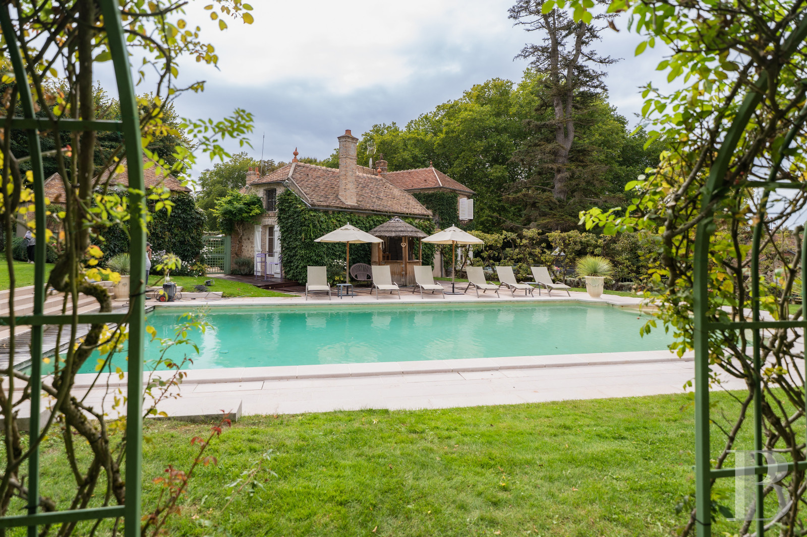 Située dans une enceinte composée d’une allée de poiriers et de murs anciens en pierre, la piscine, aux margelles en pierre blanche, est bordée de pelouse sur trois côtés et d’une terrasse en teck qui abrite un petit kiosque en paille et bois. Une roseraie et des bacs en bois tressés pour le potager ponctuent les surfaces engazonnées le long des murs. La piscine fonctionne au sel et chauffée par une pompe à chaleur.