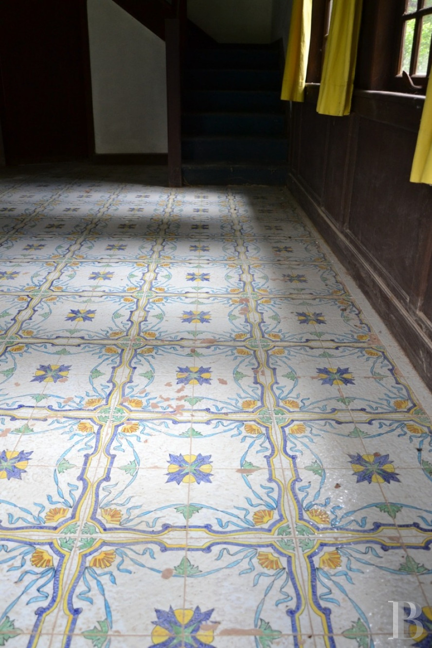 Un vaste vestibule vitré, avec poutres et solives apparentes, ouvert sur le ruisseau et le parc, permet de desservir les pièces de réception et un escalier en bois mène vers les chambres au premier étage. Le salon, d’environ 30 m², est couvert au sol d’élégants carreaux de faïence italienne, avec plafond à la française et cheminée en pierre. À sa suite, se tiennent une salle à manger et une cuisine avec carreaux en damier. Enfin, les pièces de service comportent un cellier, un fruitier, une remise et une chaufferie.