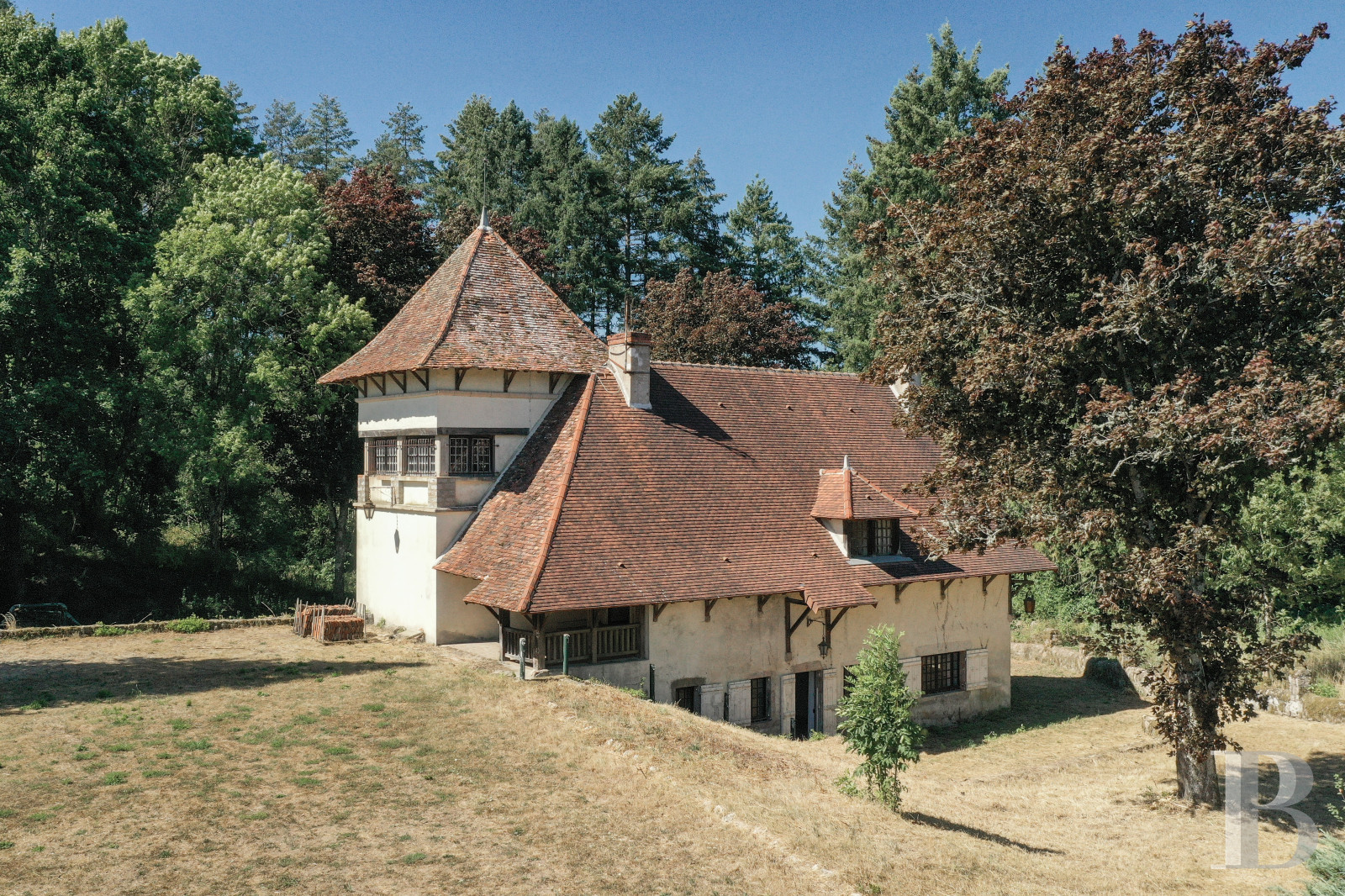 La structure d’origine est certainement antérieure à la Révolution française. Dans la cour, une plateforme surélevée au 19ᵉ s., soutenue par des murs en pierre, a permis de créer un dénivelé et d’accéder au premier étage du bâtiment de plain-pied. La tour quadrangulaire massive, sur trois niveaux, a certainement été conçue à la même période. Le corps principal est élevé d’un rez-de-chaussée et d’un étage sous combles, couvert de tuiles plates.